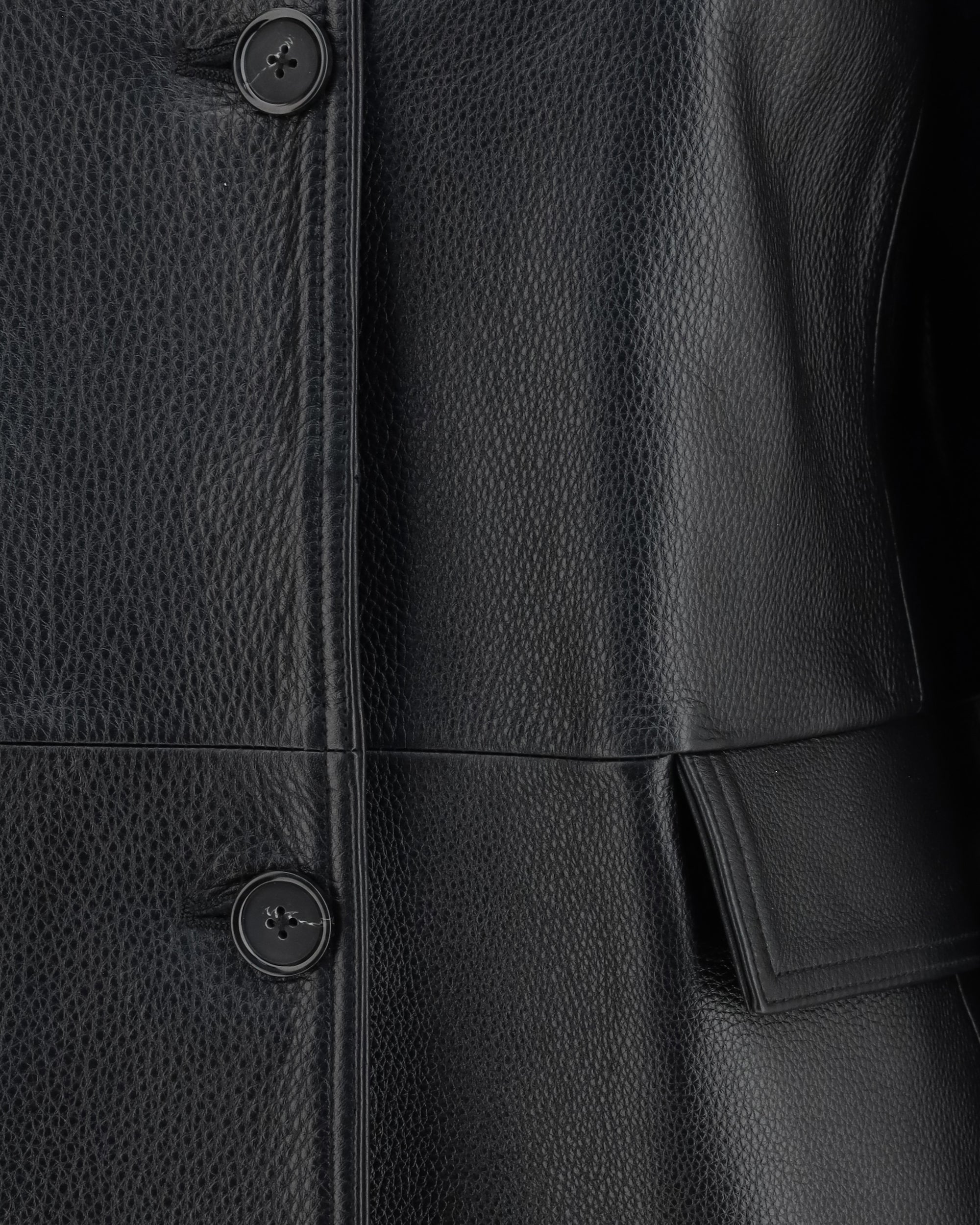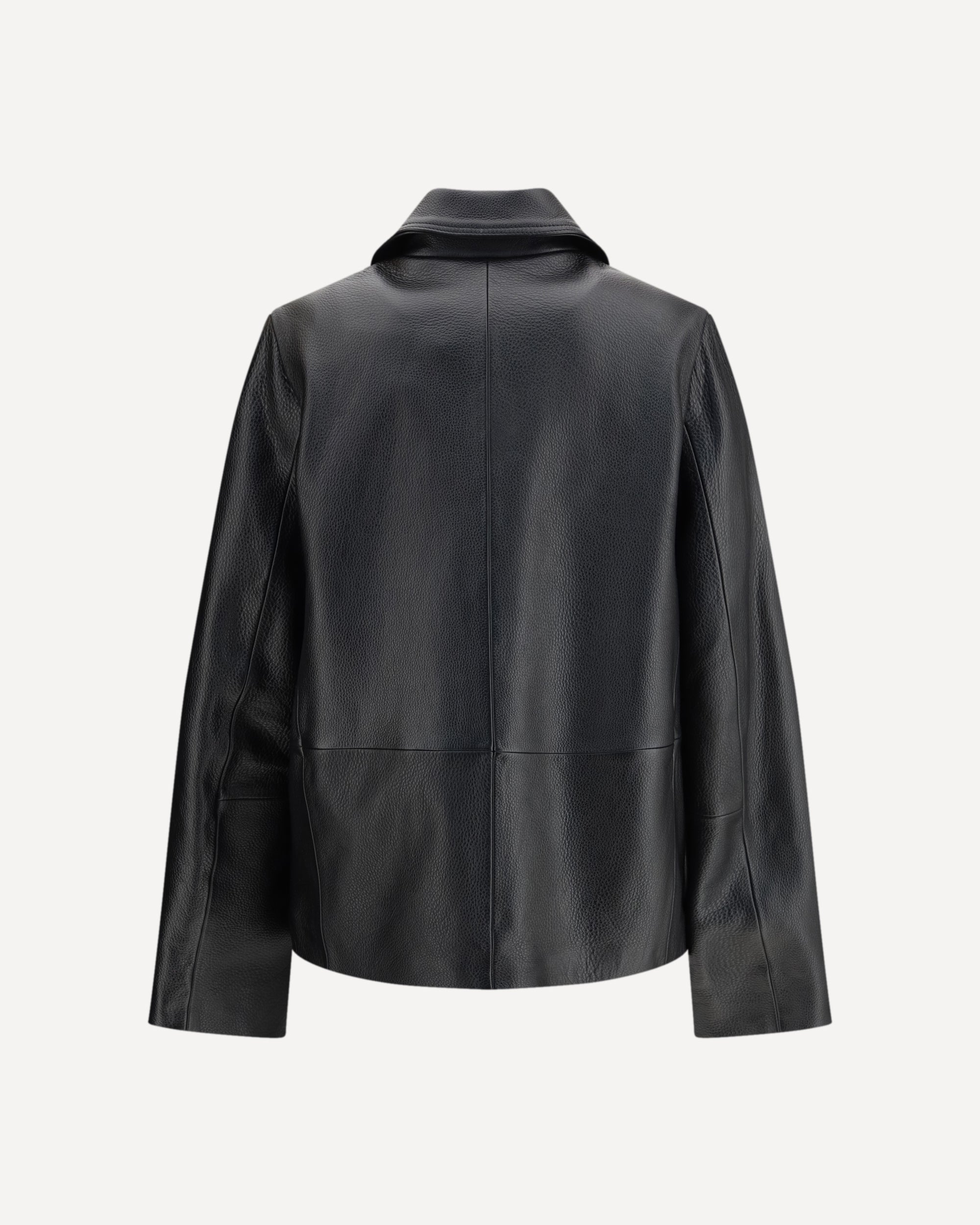 The grained leather Jacket by Toteme is a refined piece crafted from textured grained leather for a structured, luxurious feel. It features a button-front closure, practical flap pockets, and a smooth satin lining for added comfort and sophistication. A modern wardrobe essential that elevates everyday looks with minimalist elegance.