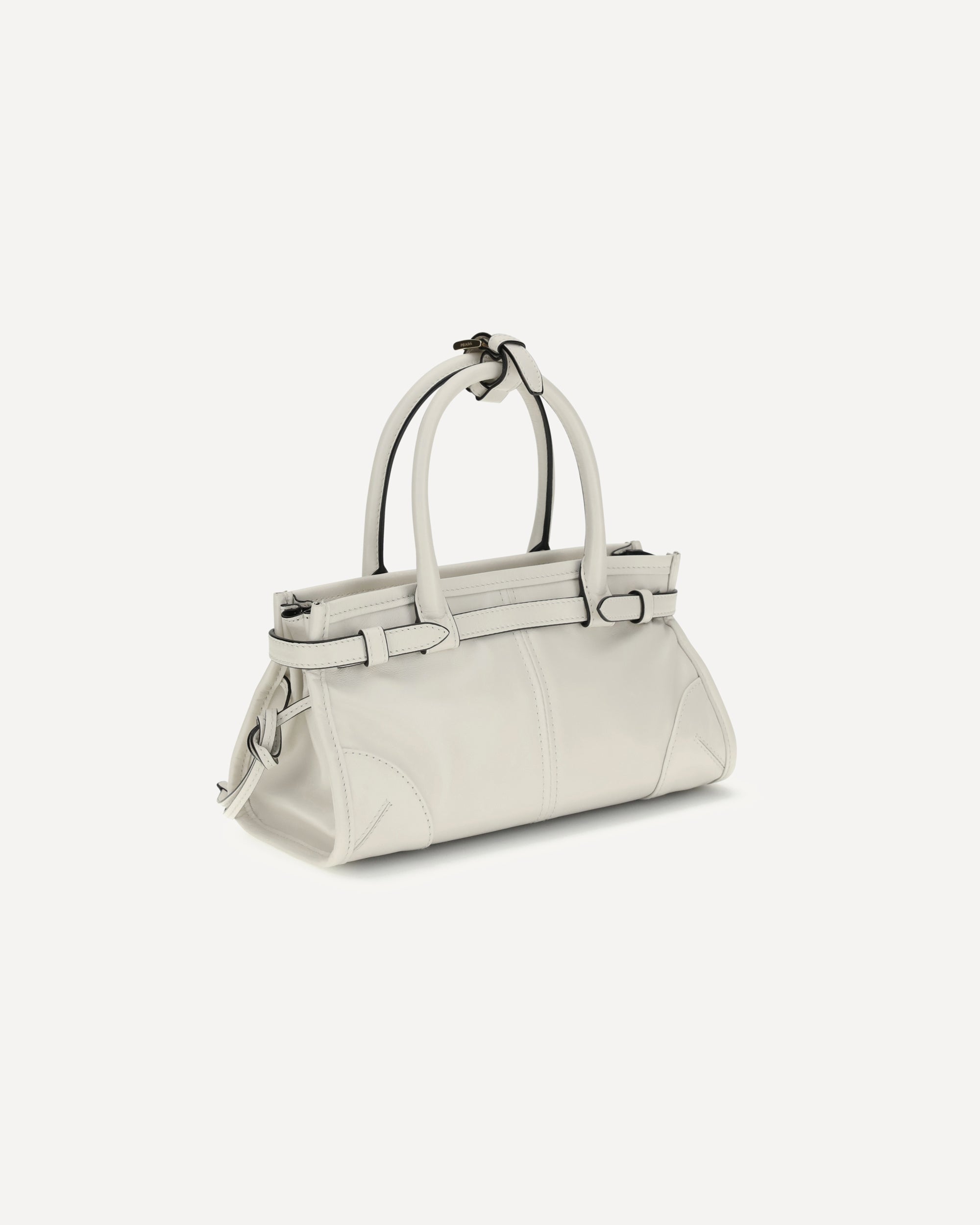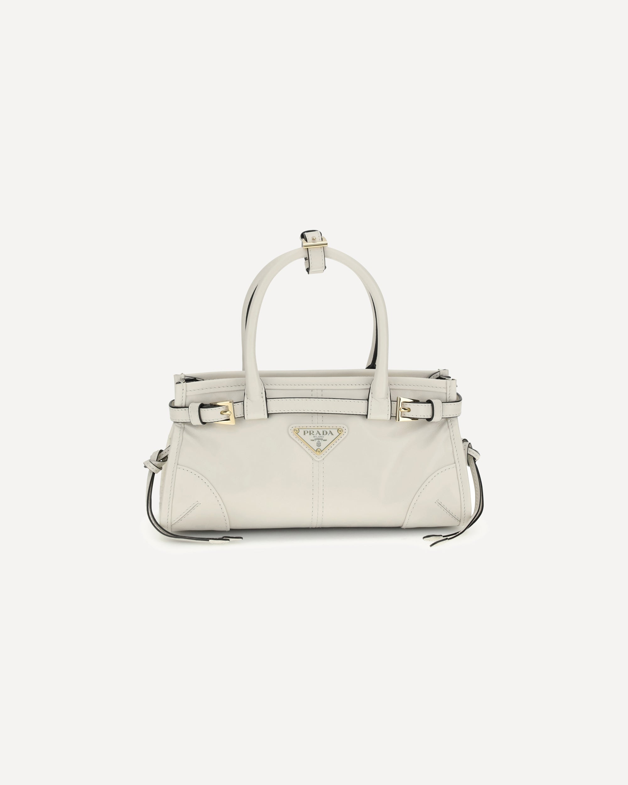 Bonnie mini Handbag by Prada is a compact and versatile accessory defined by a modern and sophisticated design. Made of soft leather with a liquid, shiny finish, it is embellished with distinctive metal buckles and side laces that enhance its unique style. The model features an adjustable and removable leather shoulder strap, zipper closure and refined metal details. The enameled triangle logo on the front signs the brand's iconic aesthetic, while the logoed nylon interior includes a practical zippered pocket. A perfect blend of contemporary elegance and functionality.