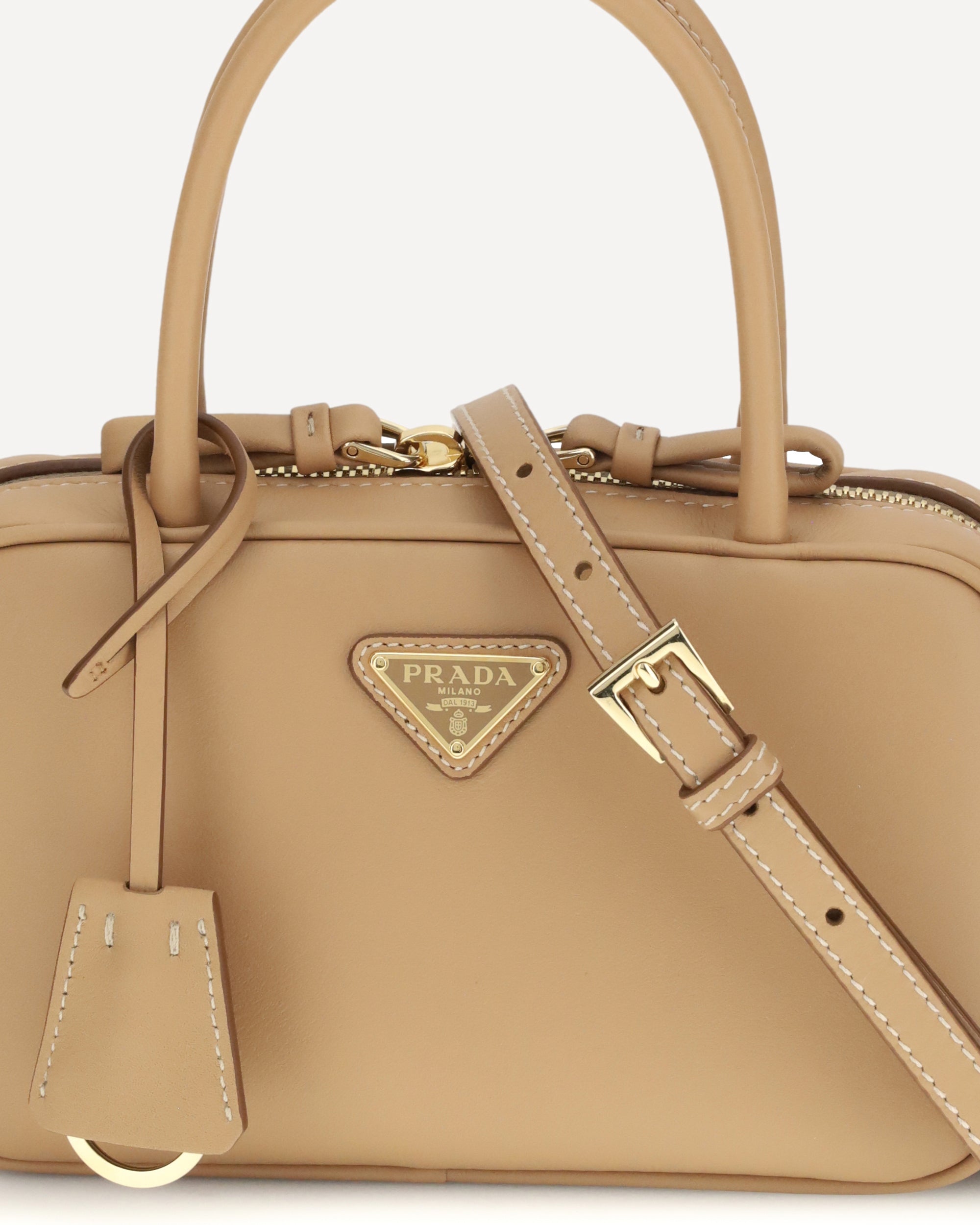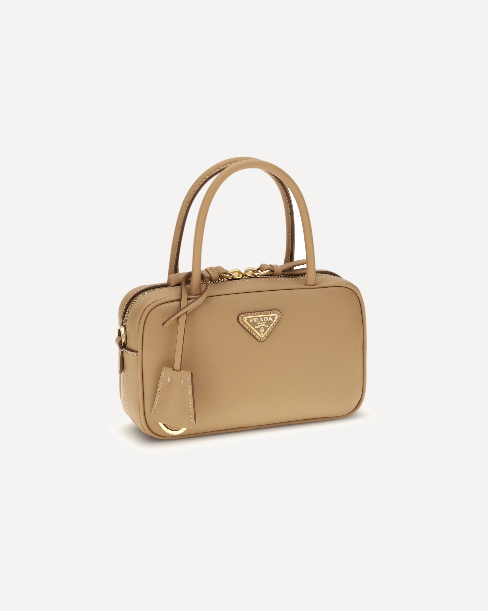 The Handbag by Prada combines elegance and functionality in an iconic design. Featuring two tubular handles and a zip closure, it is embellished with a triangular logo plaque on the front, the brand's distinctive symbol. The key ring attached to the base of the handles adds a practical and sophisticated detail. The interior features a compartment, perfect for organizing essentials in style.