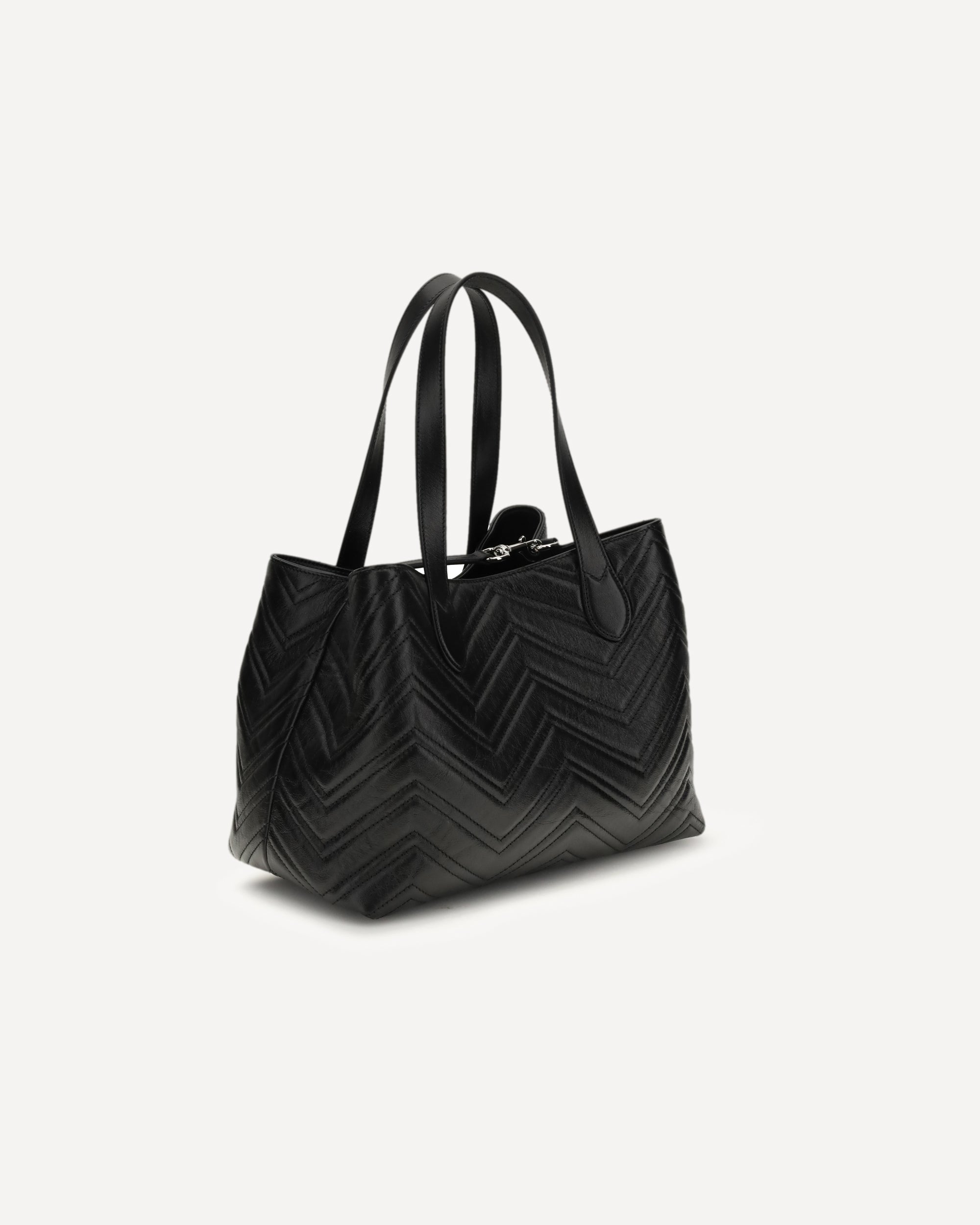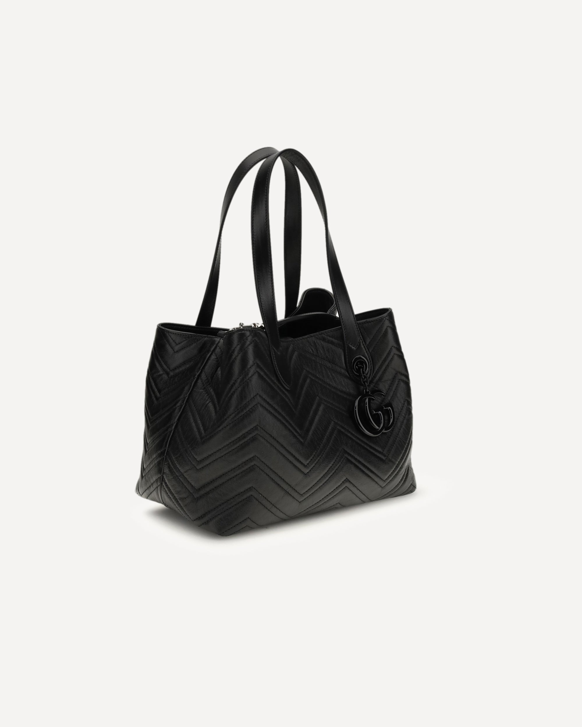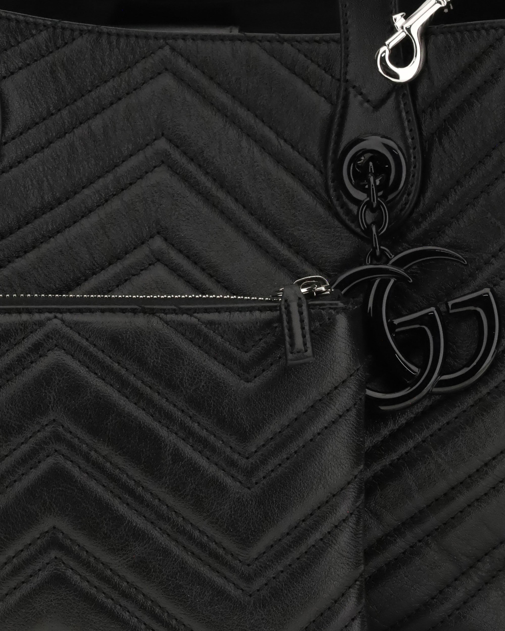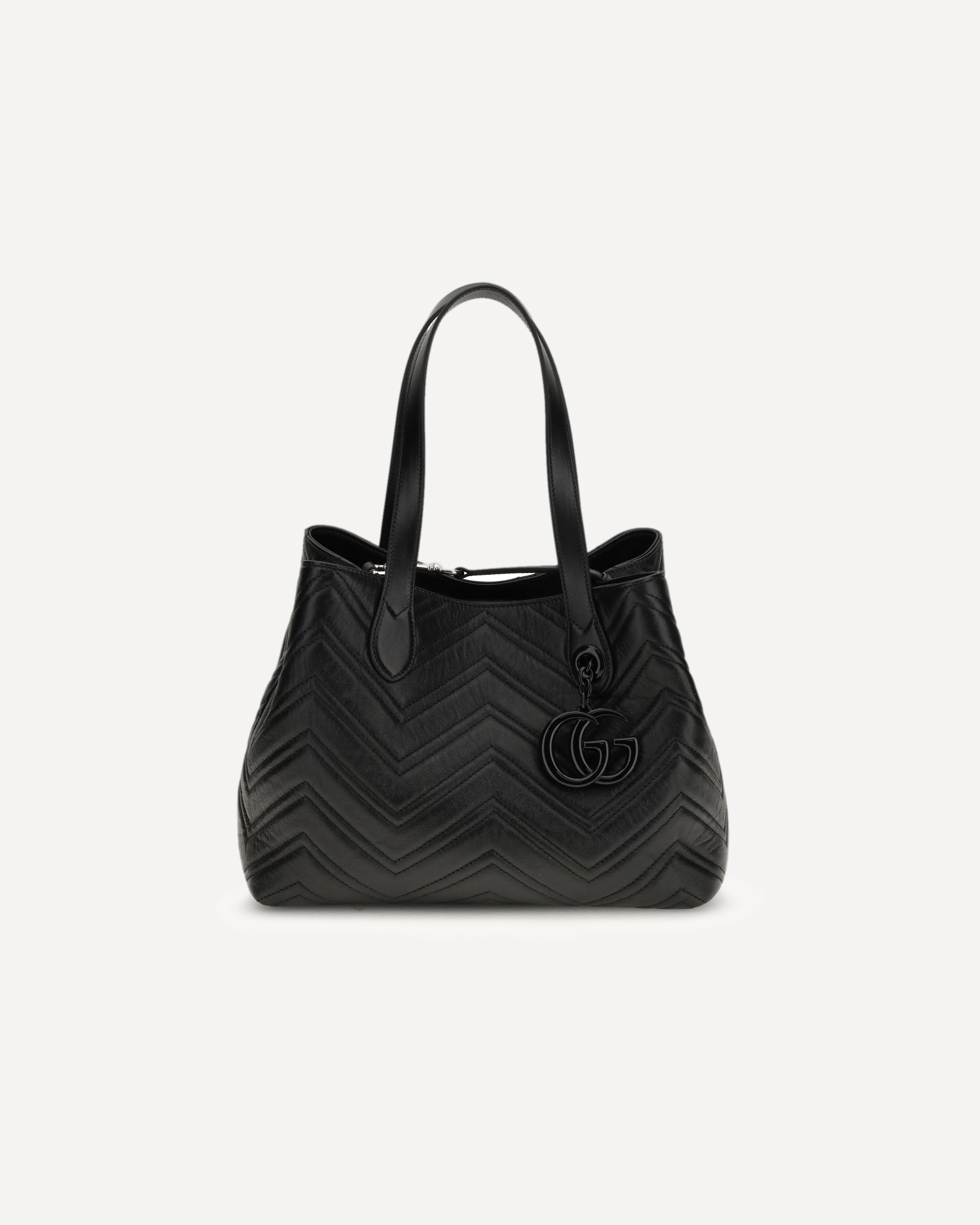 The GG Marmont shopping Bag by Gucci is crafted from soft chevron-quilted nappa leather, showcasing one of the House’s most iconic textures. It features the signature Double G emblem on the front and a magnetic closure for effortless functionality. The tone-on-tone enamel hardware adds a modern, refined touch, while the viscose lining ensures a lightweight, high-quality feel. The detachable leather shoulder strap allows the bag to be worn either over the shoulder or carried by hand, making it versatile for everyday styling.