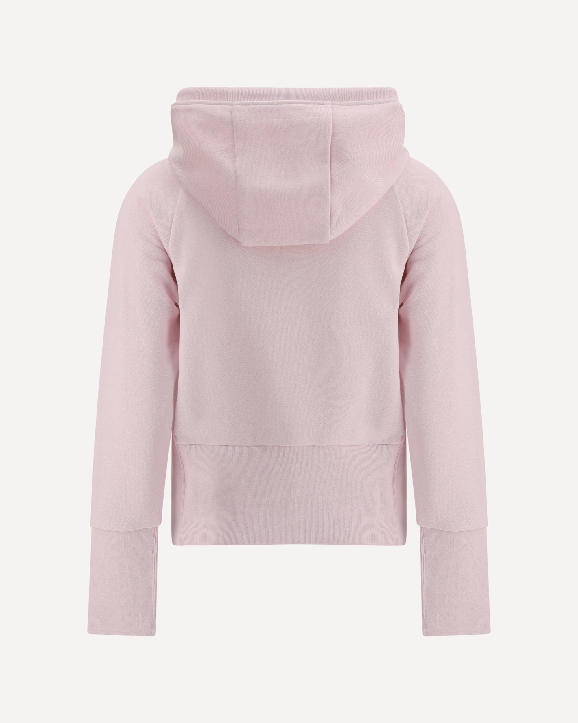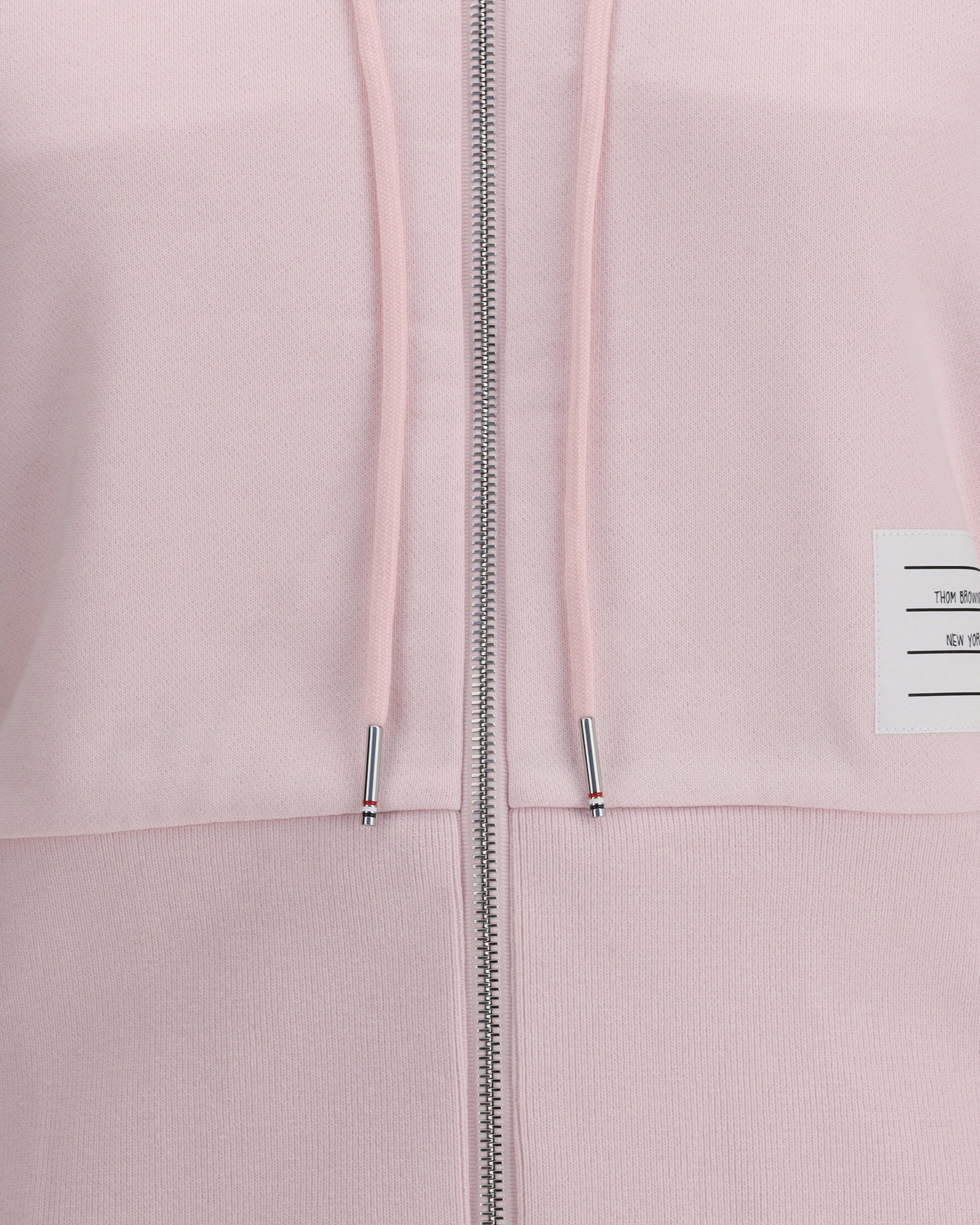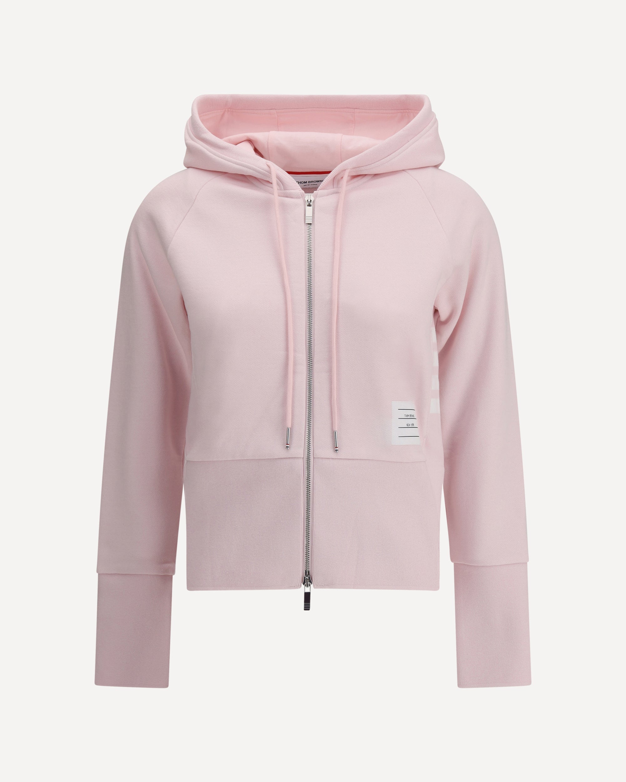 Pure cotton Sweatshirt by Thom Browne, featuring an adjustable drawstring hood and a double-slider front zipper closure. The design features raglan sleeves, two side welt pockets and a logo patch applied to the front. Finished with high ribbed cuffs and hem, it is enhanced by the iconic contrasting bands along the side panels, the brand's signature detail.