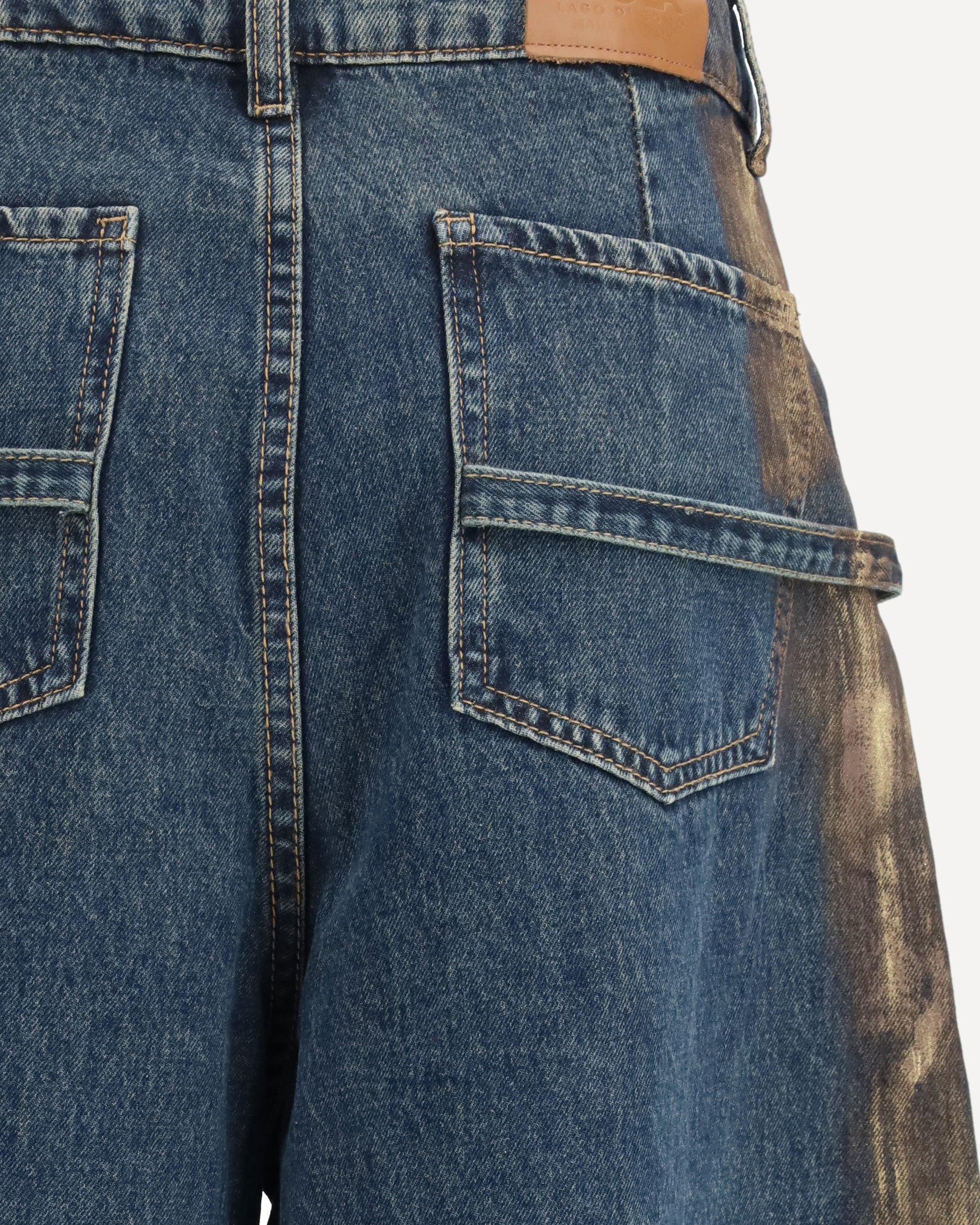 The oversized Jeans by Ella, featuring belt loops and contrasting painted details running along both sides. They are designed with a single-button and zip closure, two front pockets, and two back pockets. The relaxed fit combined with the artistic side accents gives the piece a contemporary and unique character.