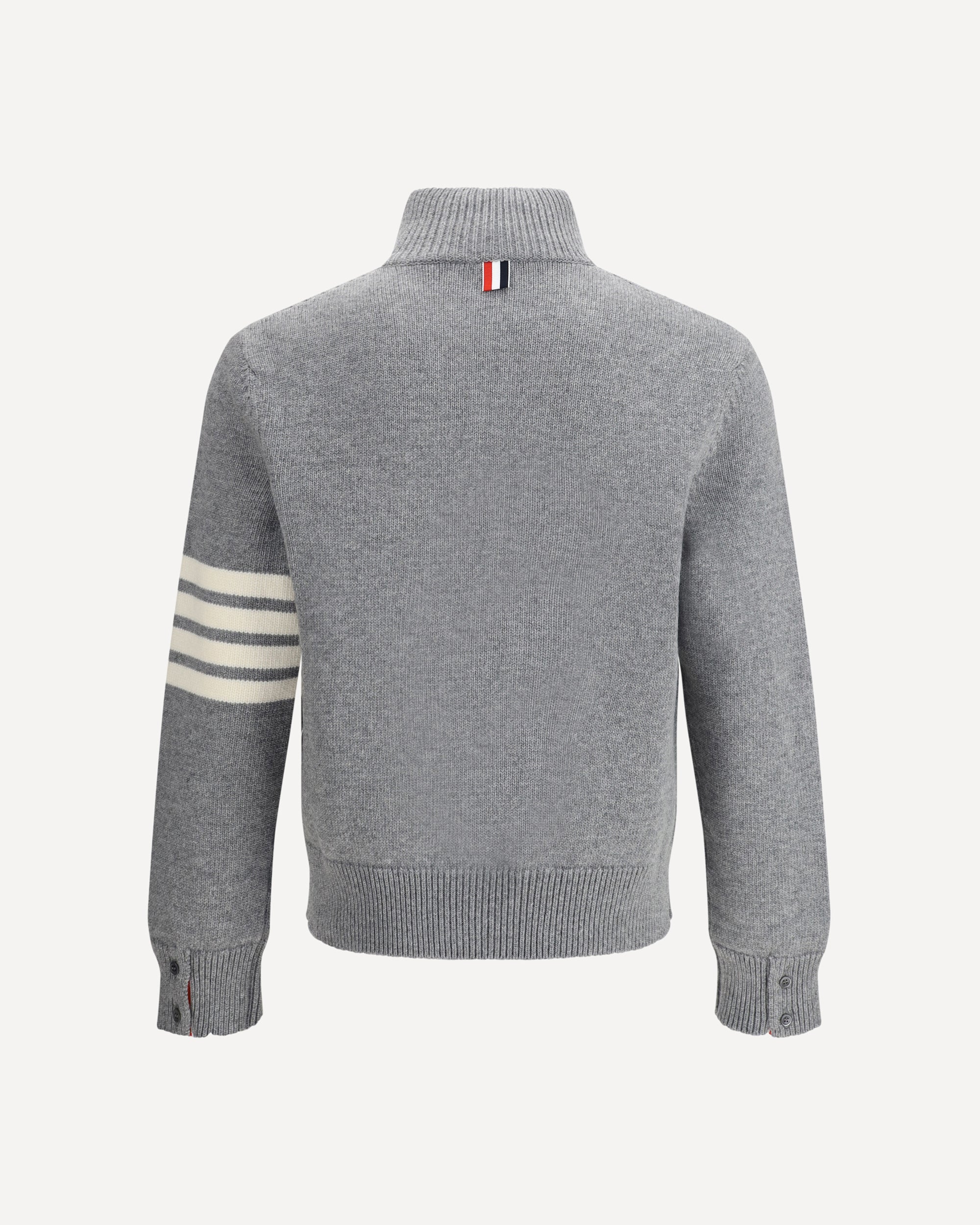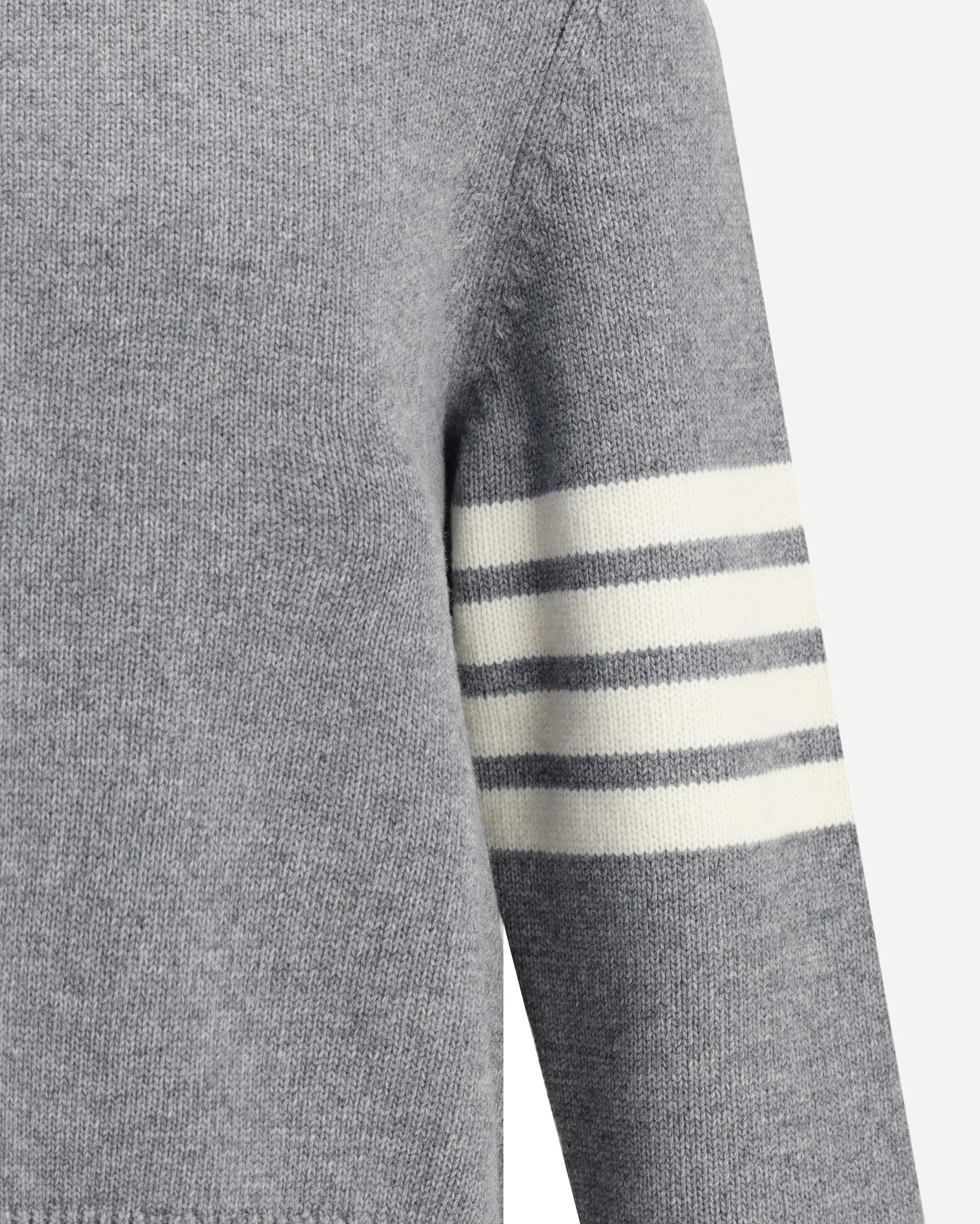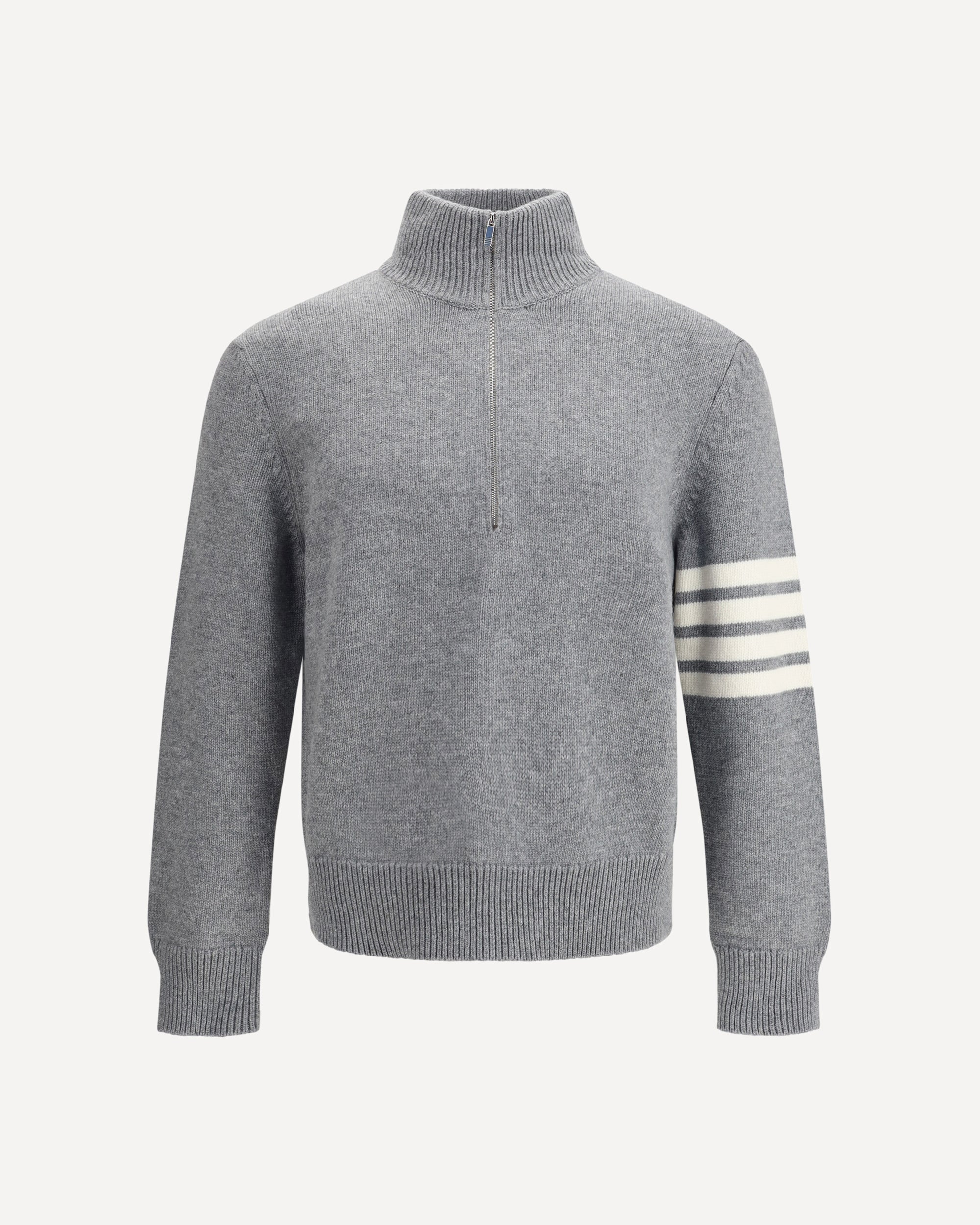 The Sweater by Thom Browne features a contrasting 4-Bar intarsia, combining elegance with a contemporary edge. Designed with refined detailing, it includes a half-zip collar that adds a sporty and versatile touch. A distinctive piece blending comfort with the brand’s signature sophistication.