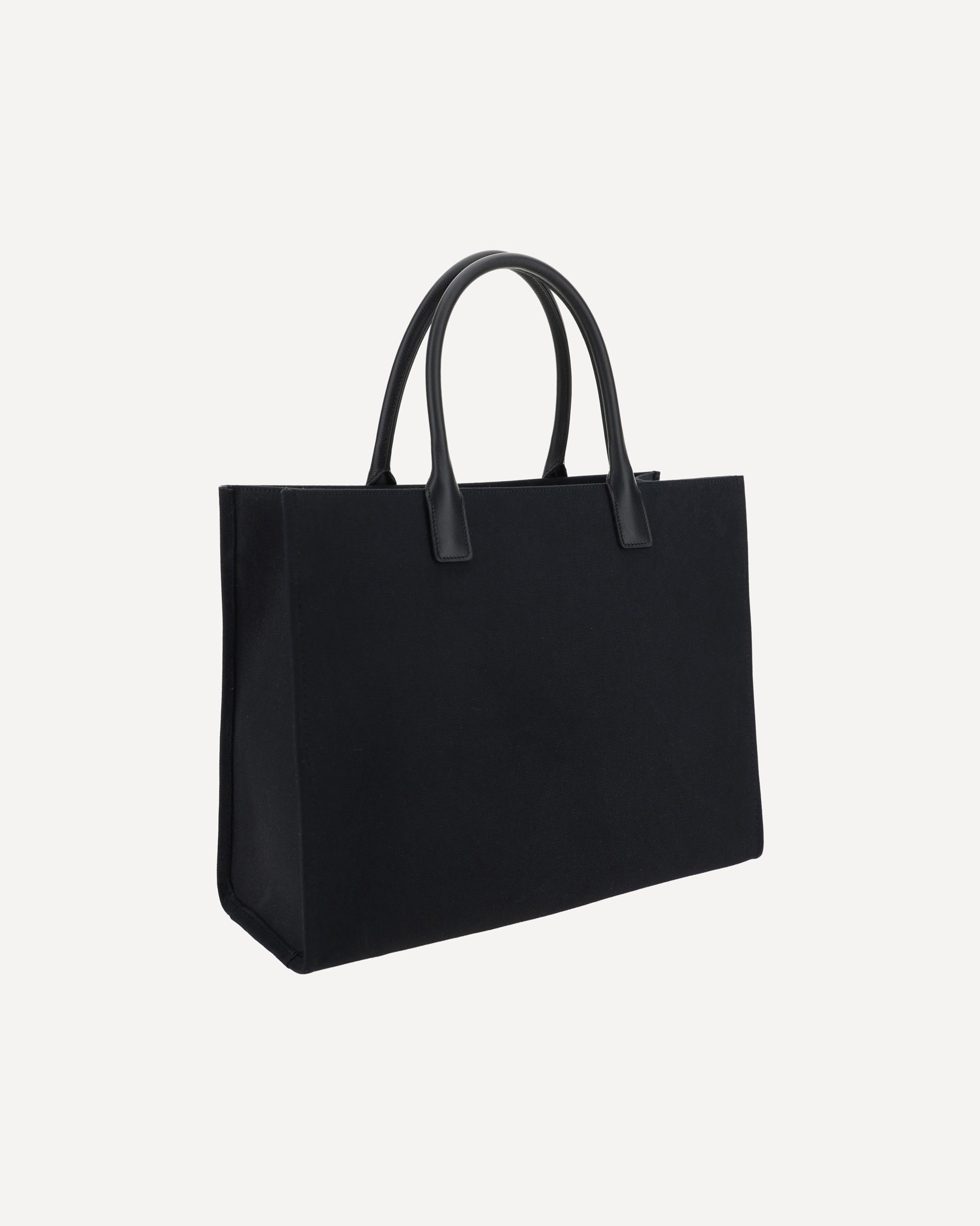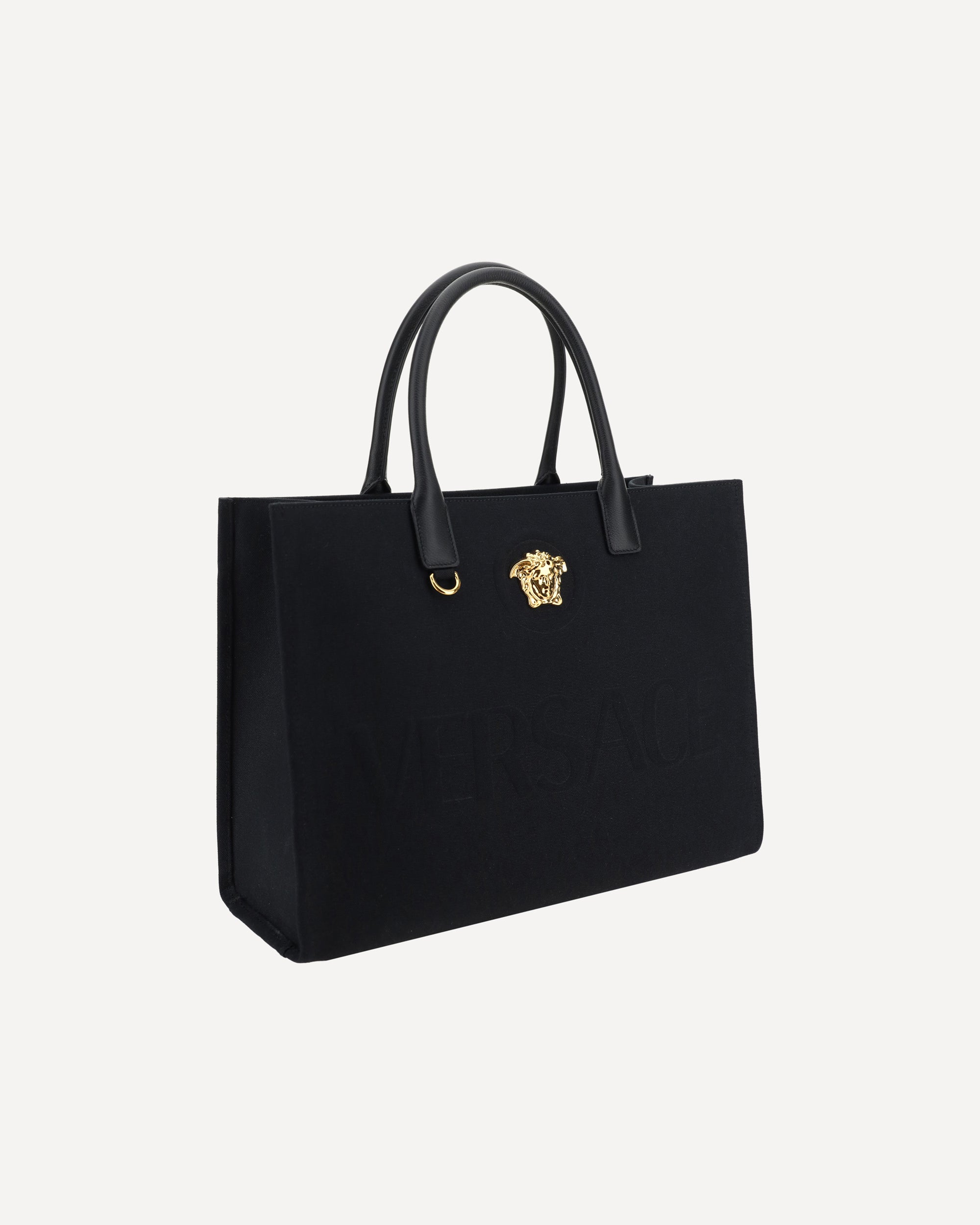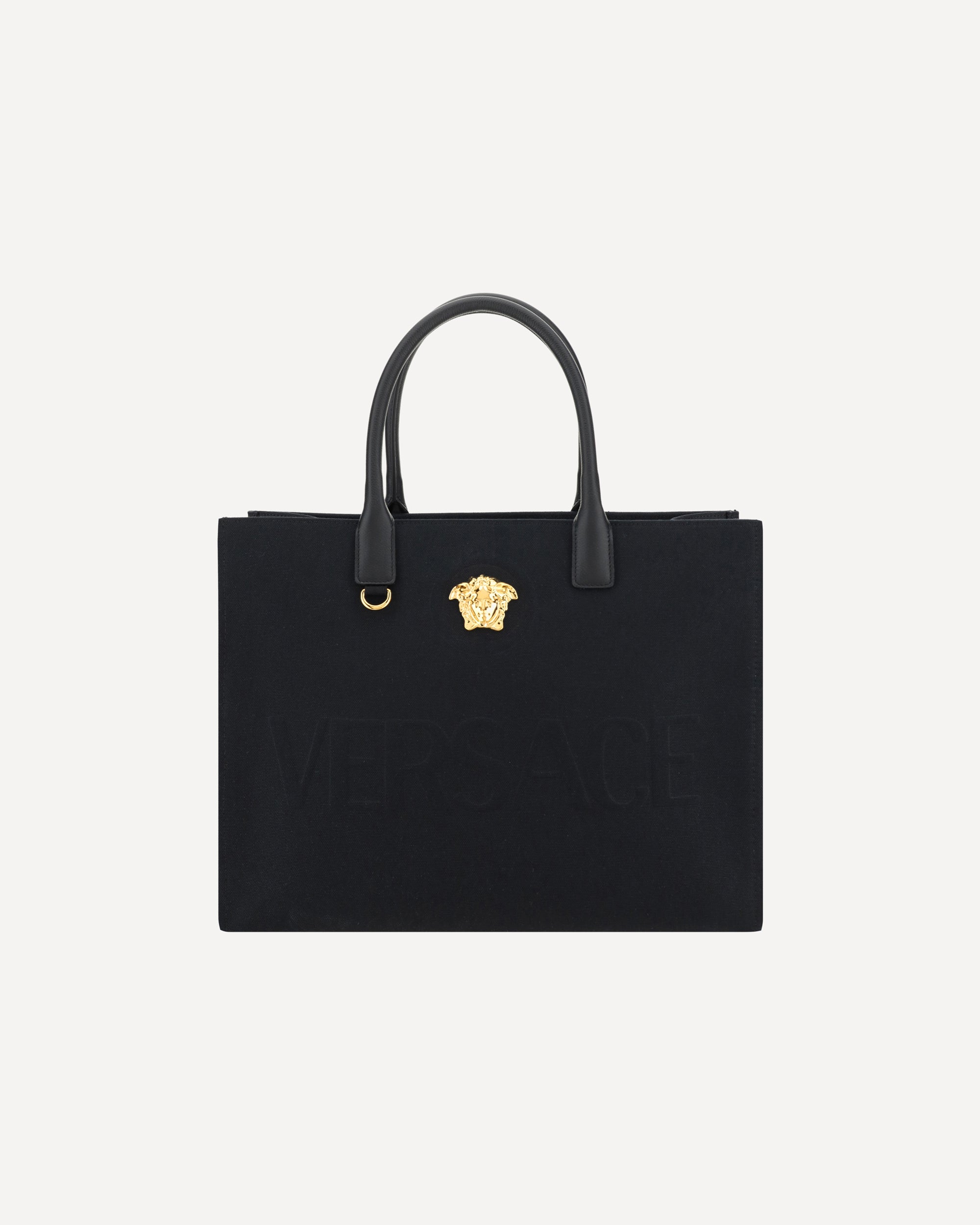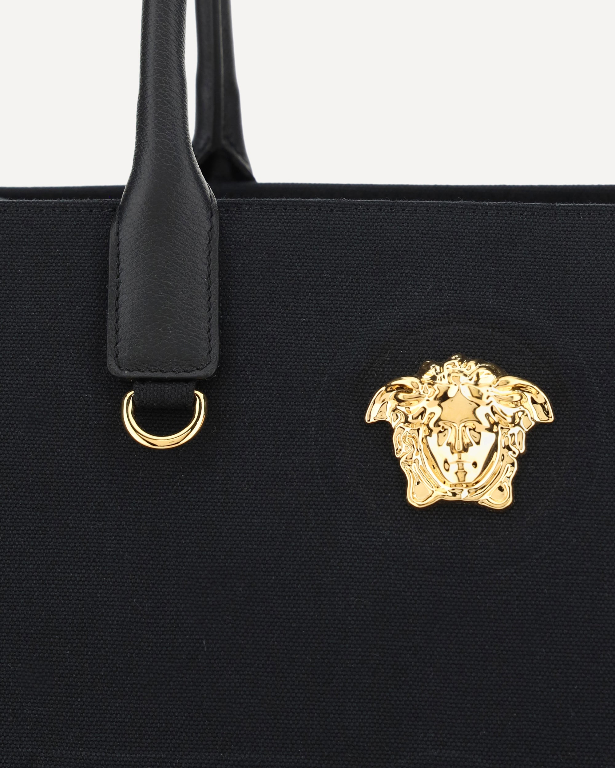 La Medusa Handbag by Versace, rigid leather handles on top, top button closure, single interior compartment, iconic Medusa metal plaque applied on front, leather feet at base.
