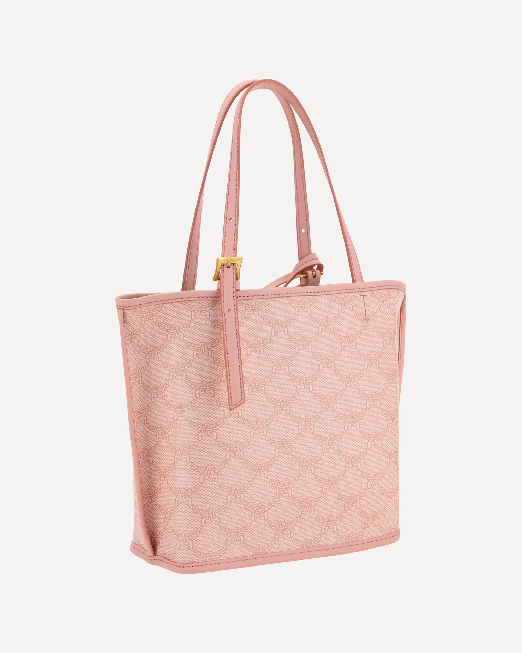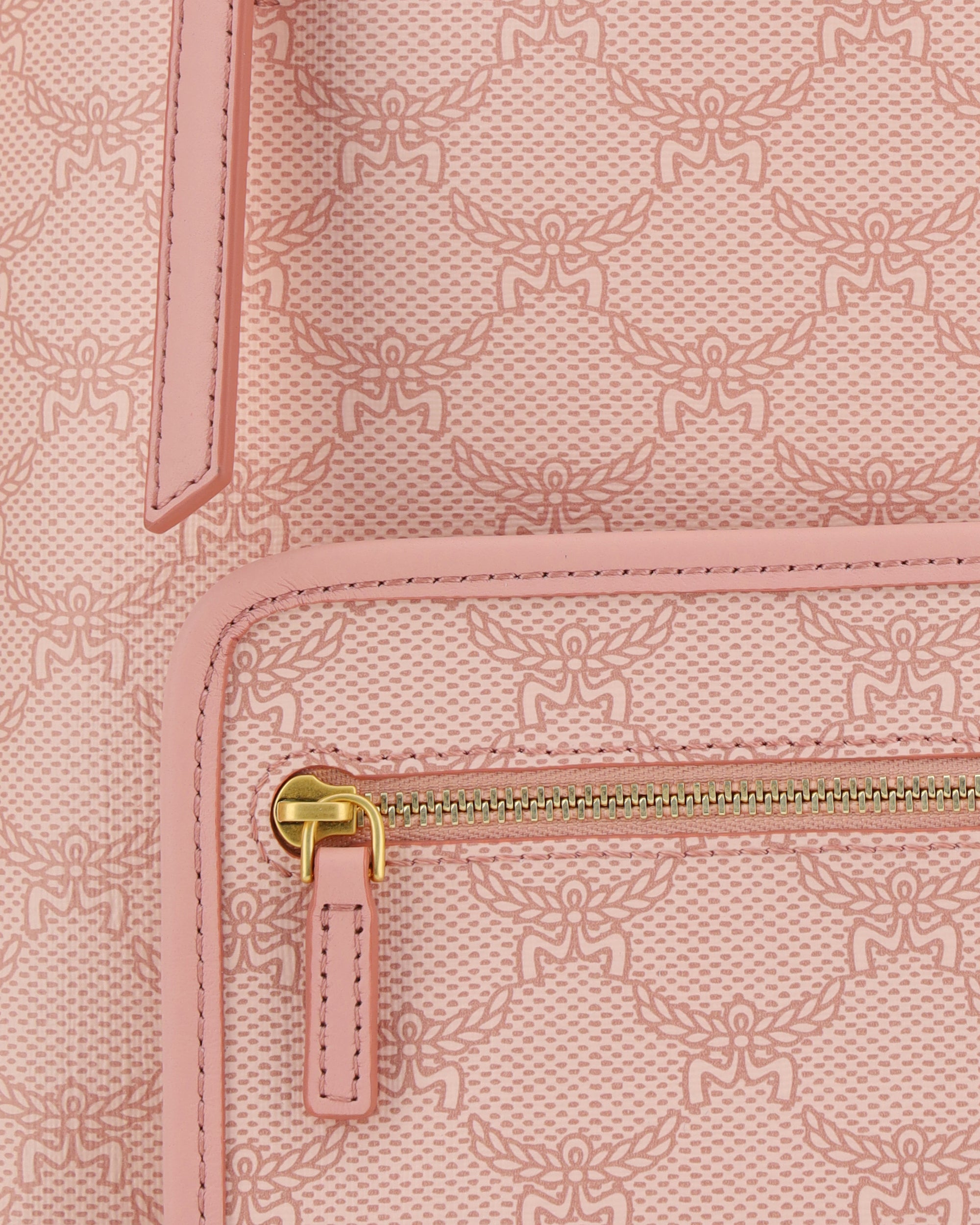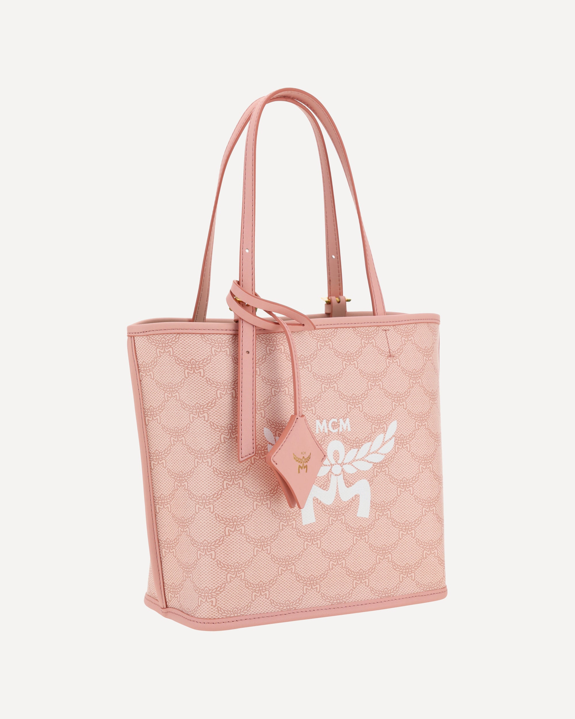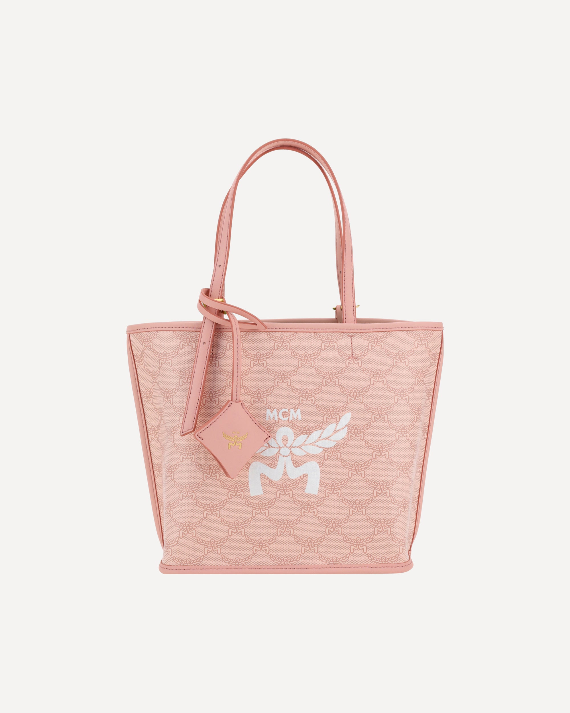Laurel Shoulder Bag by MCM, two flat top handles, single interior compartment, iconic all-over contrasting brand logo, brand monogram on front, interior pouch