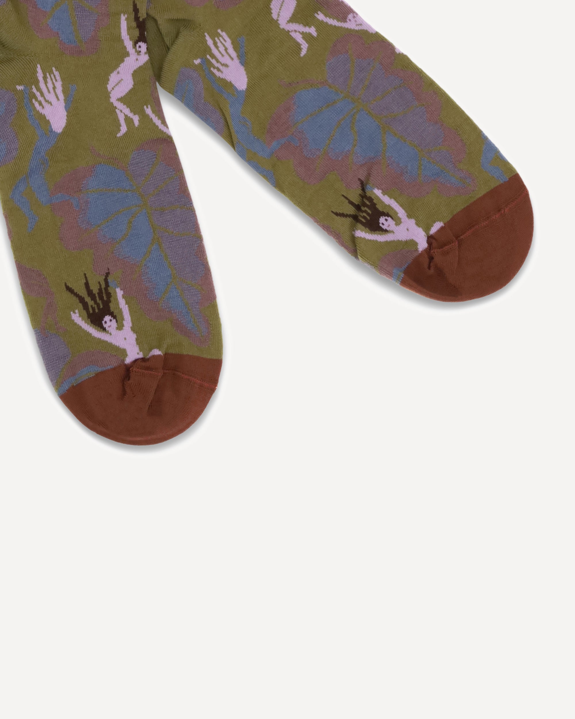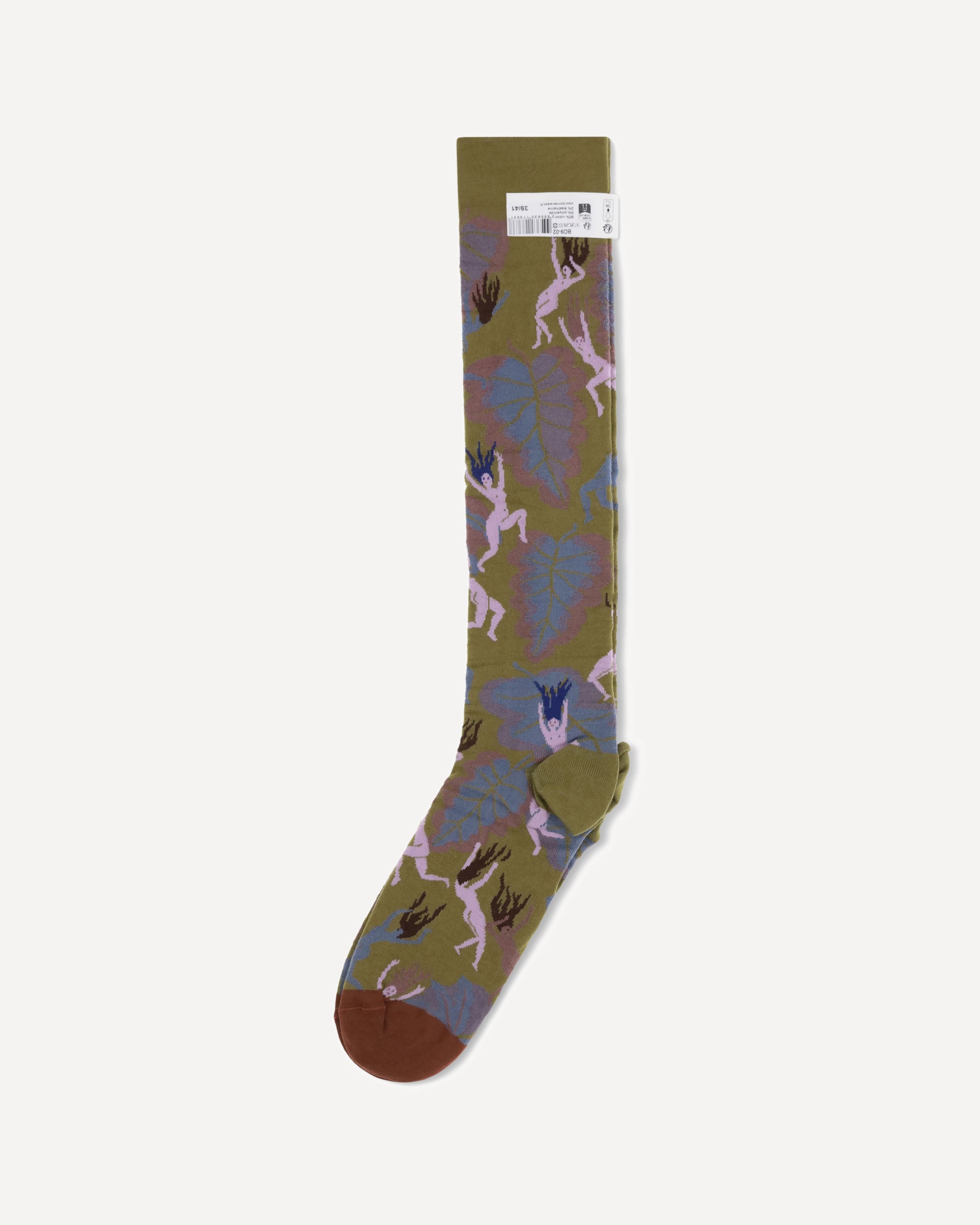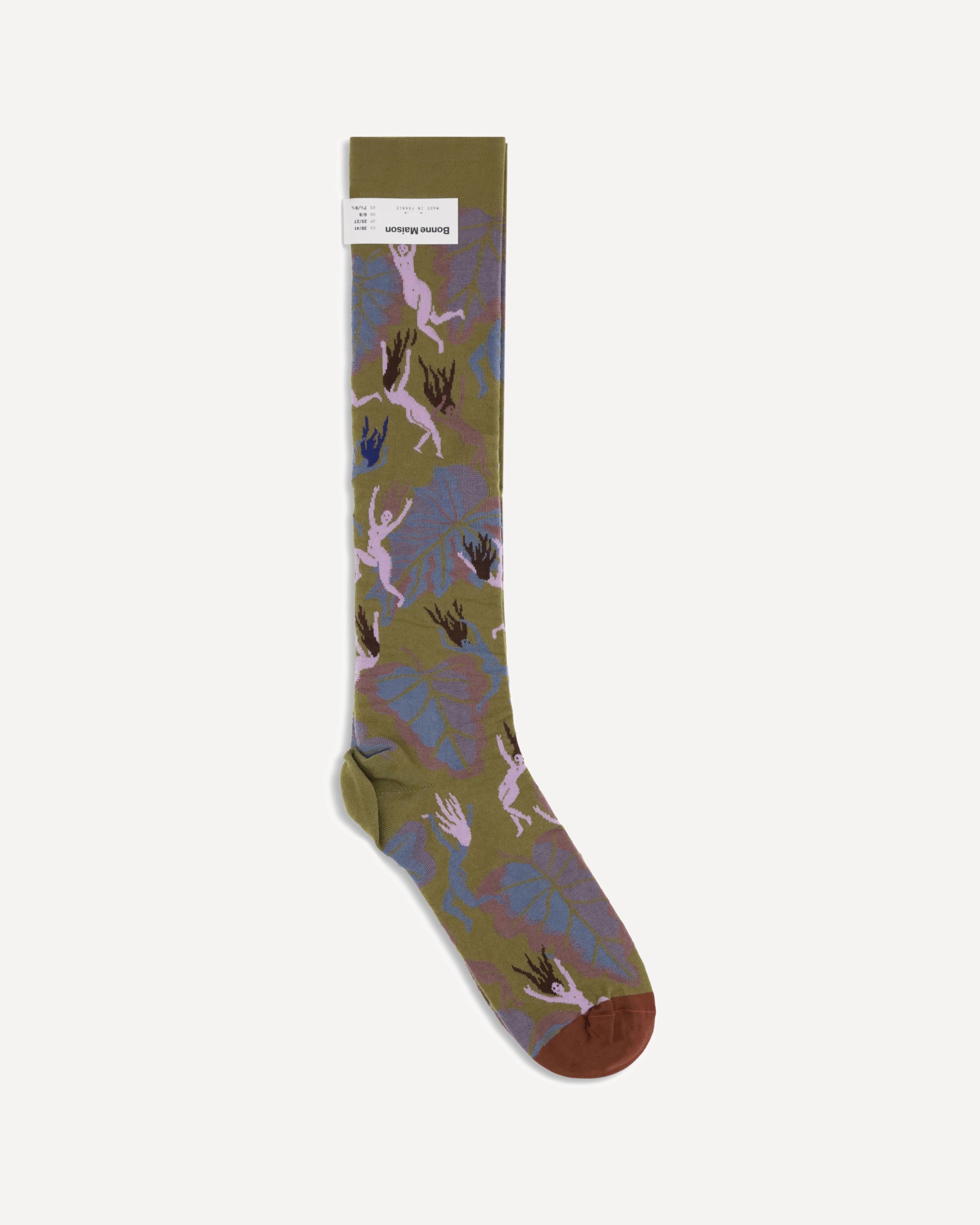 Absinthe Spirits above-knee height Socks by Bonne Maison are embellished with a vibrant pattern depicting women and leaves, an original and distinctive design. Made from high-quality materials, they offer comfort and durability, while their unique style adds a touch of personality and freshness to any outfit. Perfect for those who want an accessory that makes a difference.
