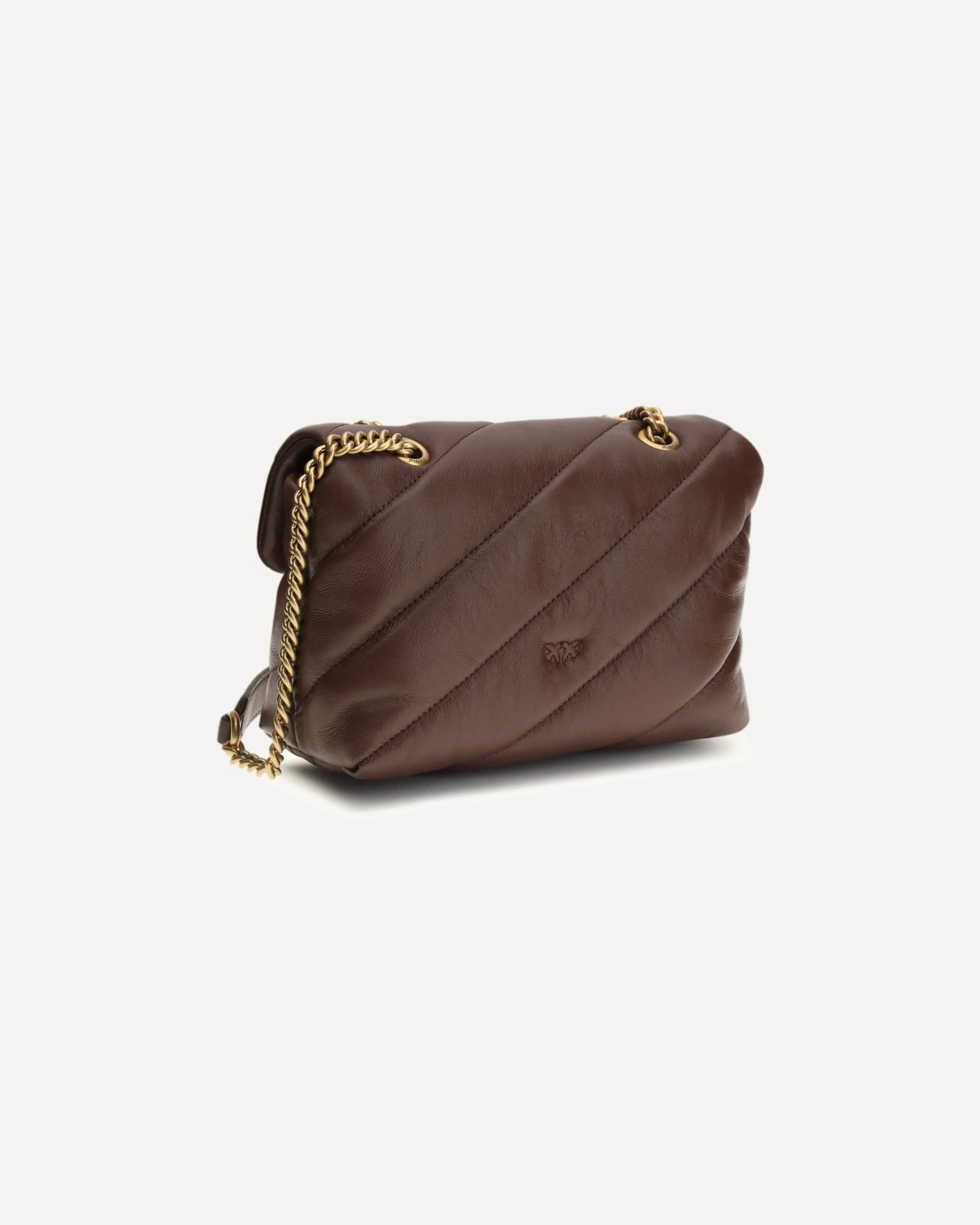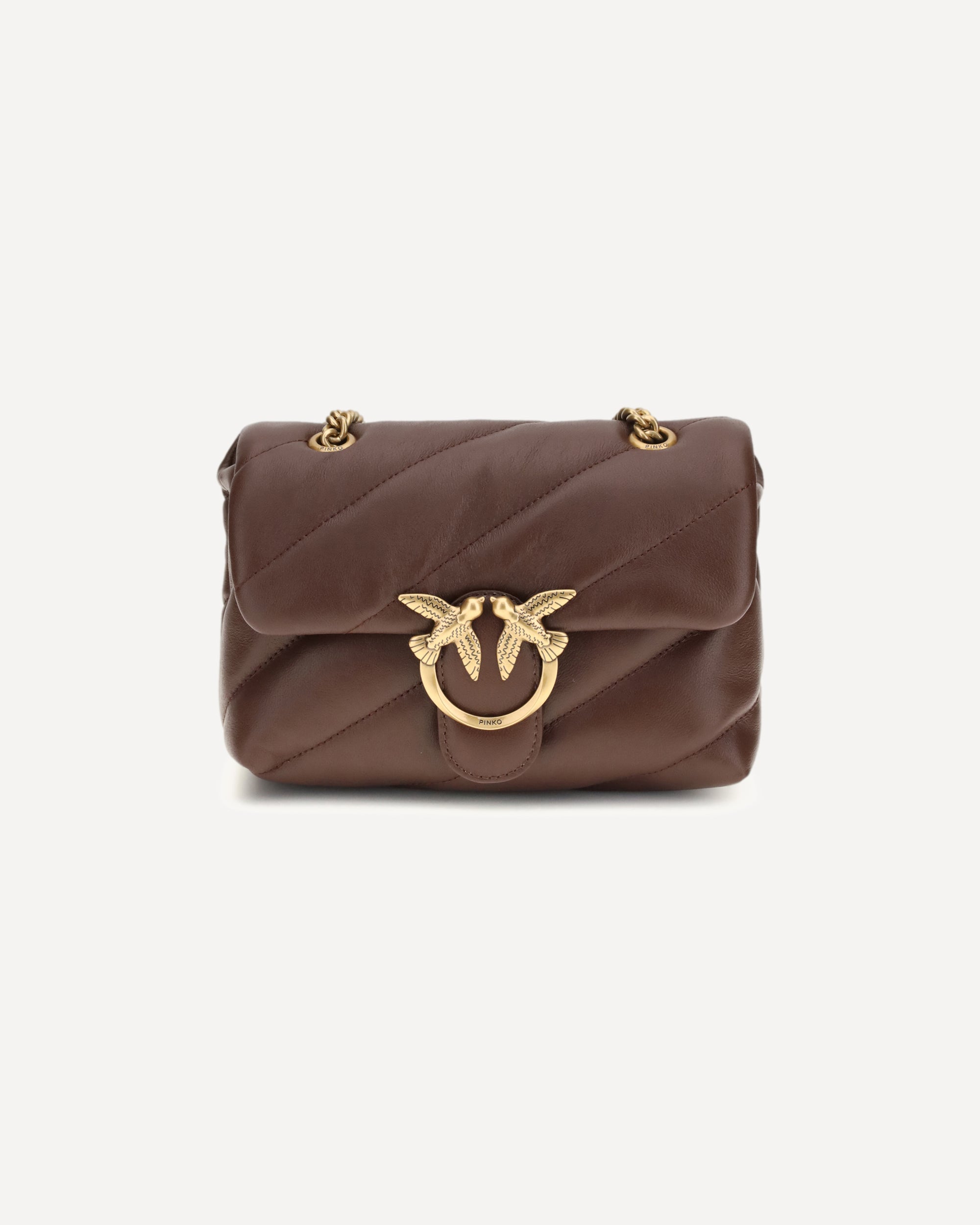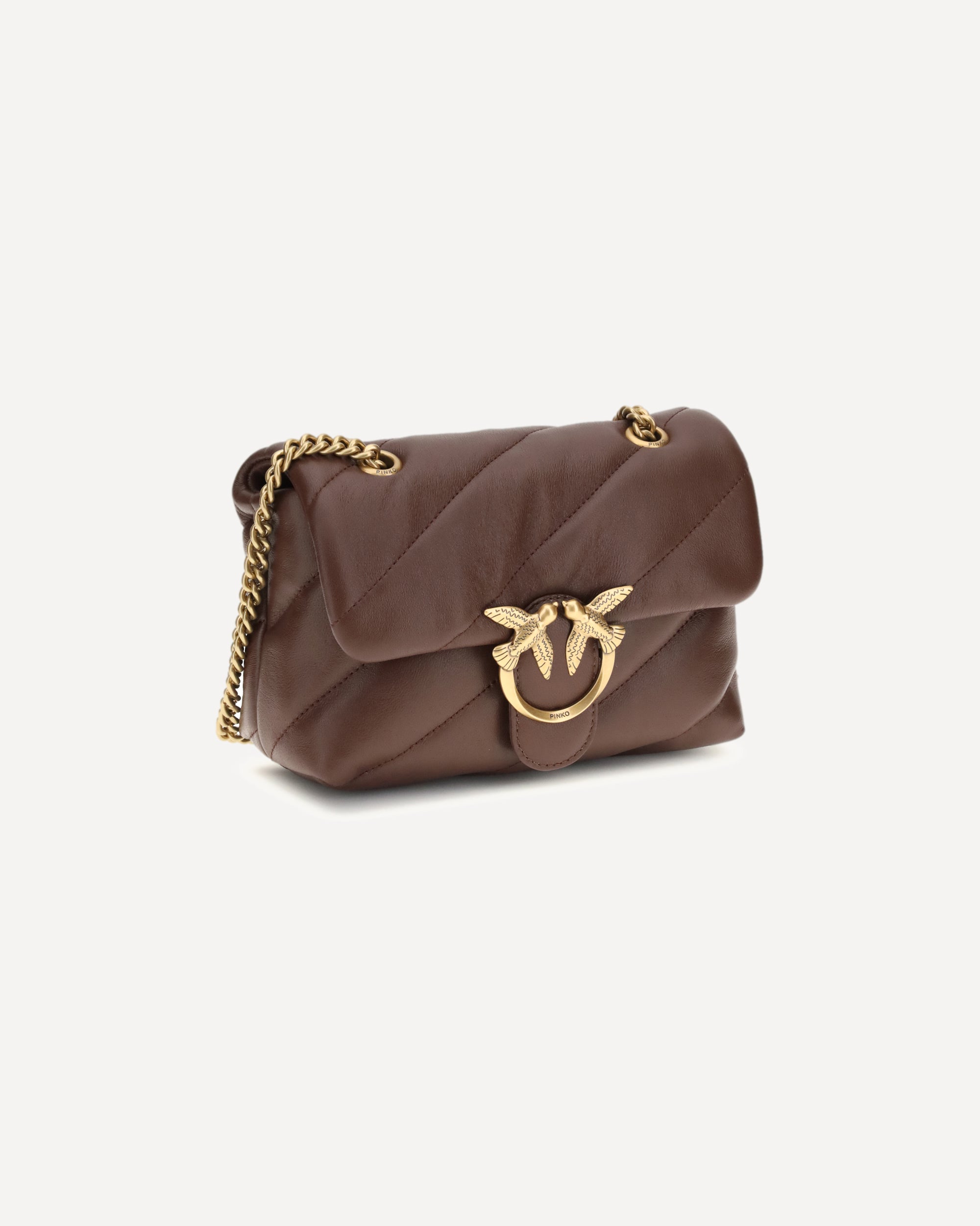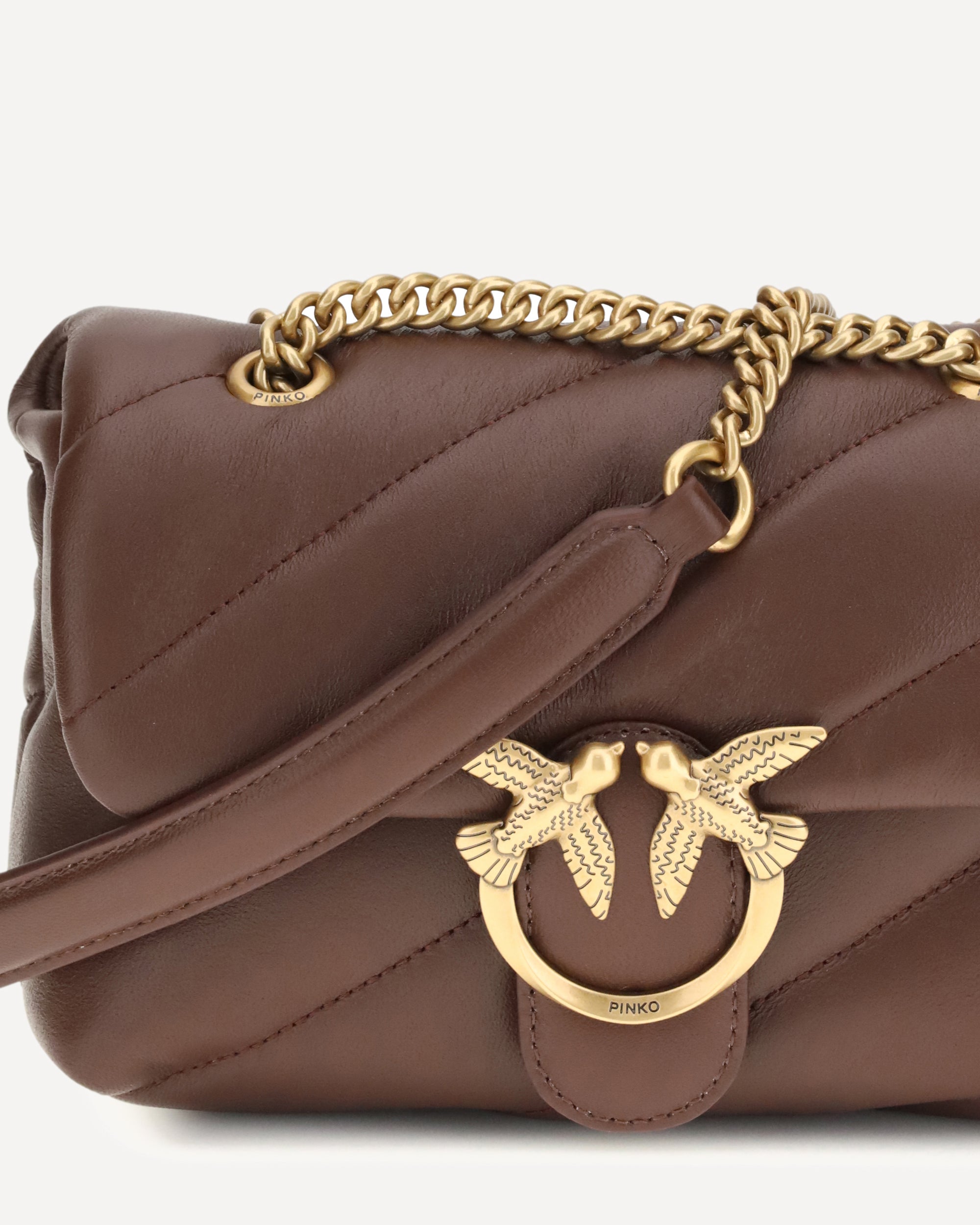 The Love Mini Puff leather Shoulder Bag by Pinko is a stylish and fashionable accessory. The front closure with magnetic button ensures practicality and security, while the iconic Love Birds logo, gold-plated and embossed on the front, adds a touch of luxury. The quilted and padded design gives the bag a rich and sophisticated texture. Inside, there is single interior compartment for excellent organization. The sliding chain strap offers versatility, allowing it to be worn on the shoulder or crossbody. On the back, the brand's iconic tone-on-tone embroidered monogram adds a discreet and refined detail.