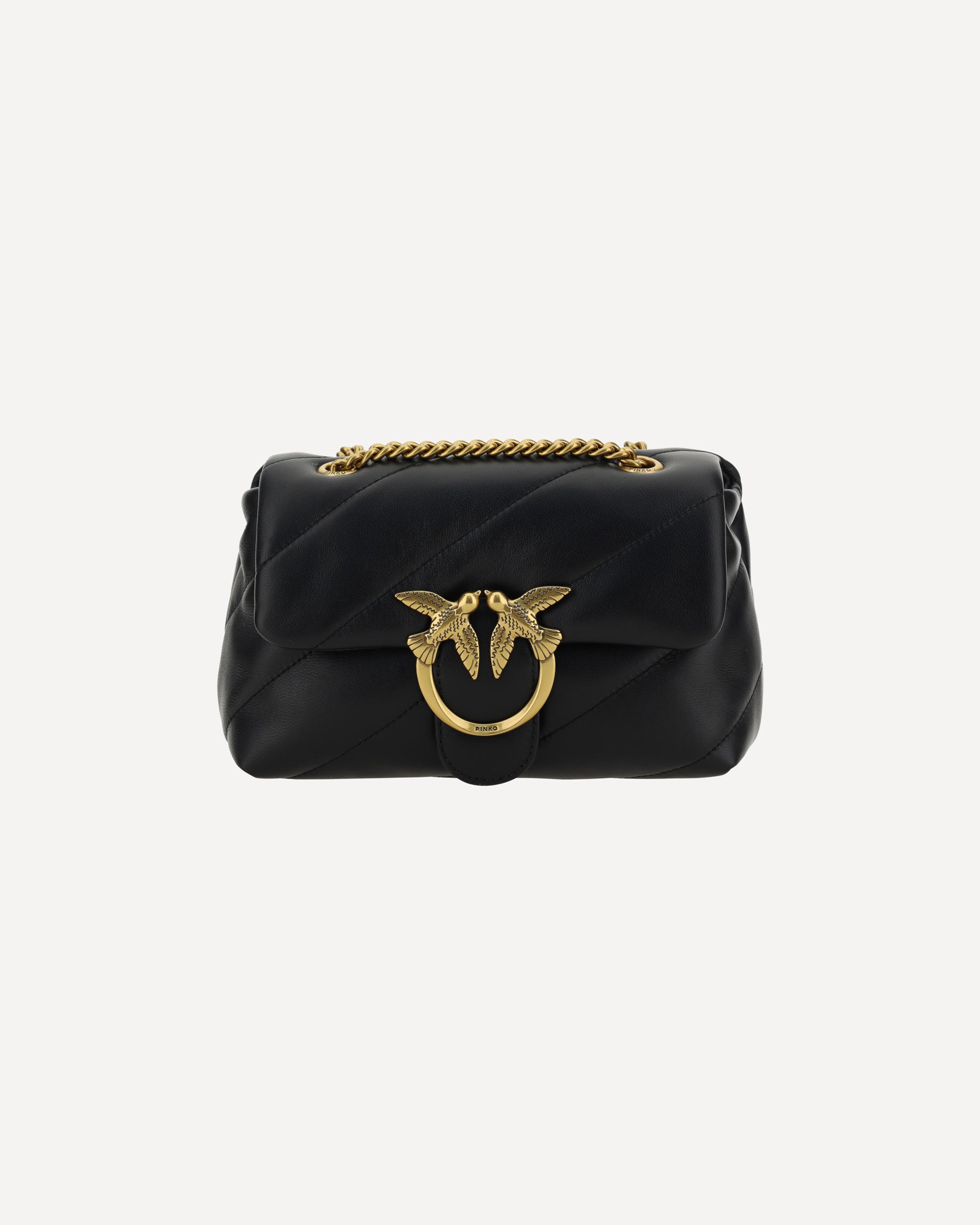 The Love Mini Puff leather Shoulder Bag by Pinko is a stylish and fashionable accessory. The front closure with magnetic button ensures practicality and security, while the iconic Love Birds logo, gold-plated and embossed on the front, adds a touch of luxury. The quilted and padded design gives the bag a rich and sophisticated texture. Inside, there is single interior compartment for excellent organization. The sliding chain strap offers versatility, allowing it to be worn on the shoulder or crossbody. On the back, the brand's iconic tone-on-tone embroidered monogram adds a discreet and refined detail.