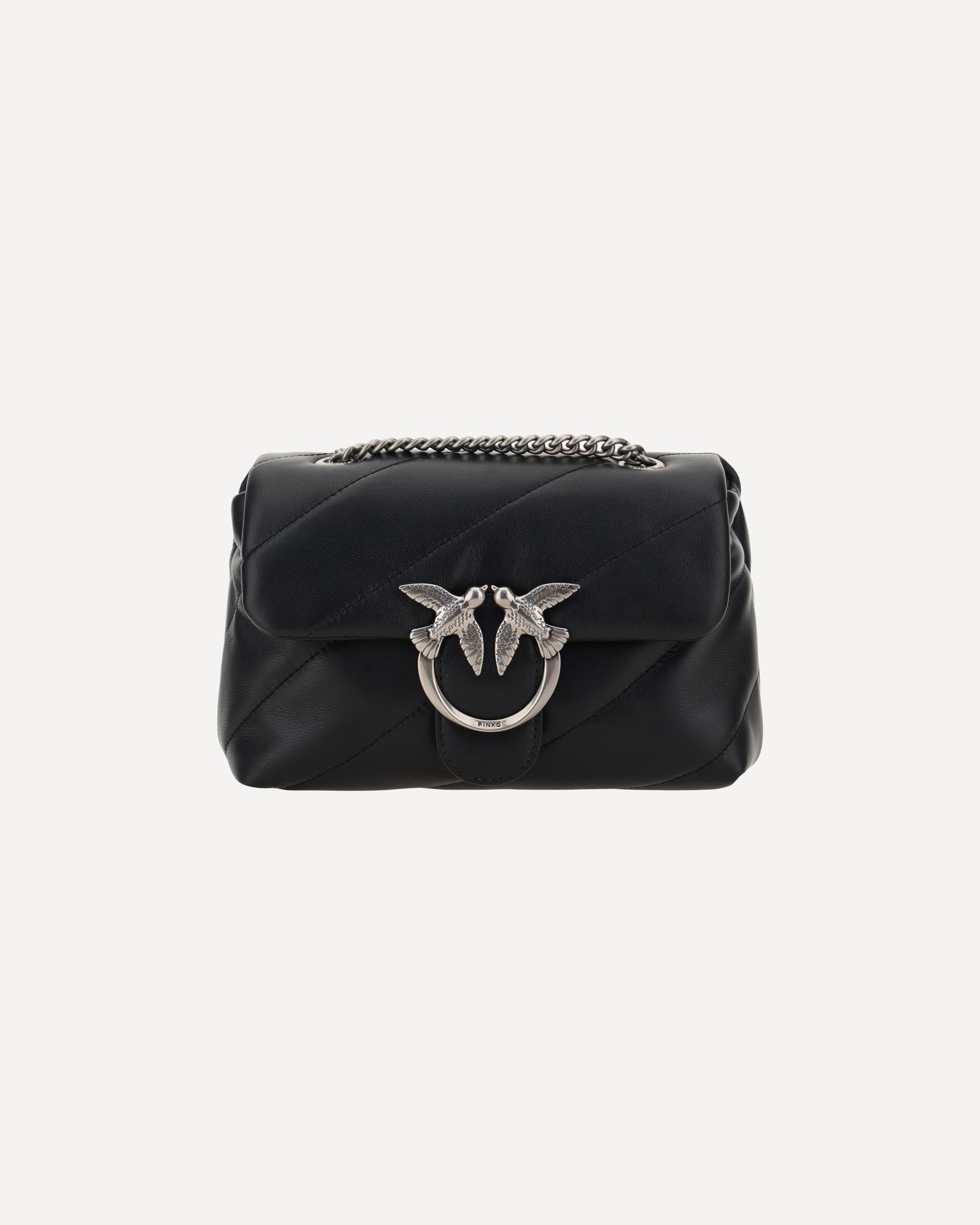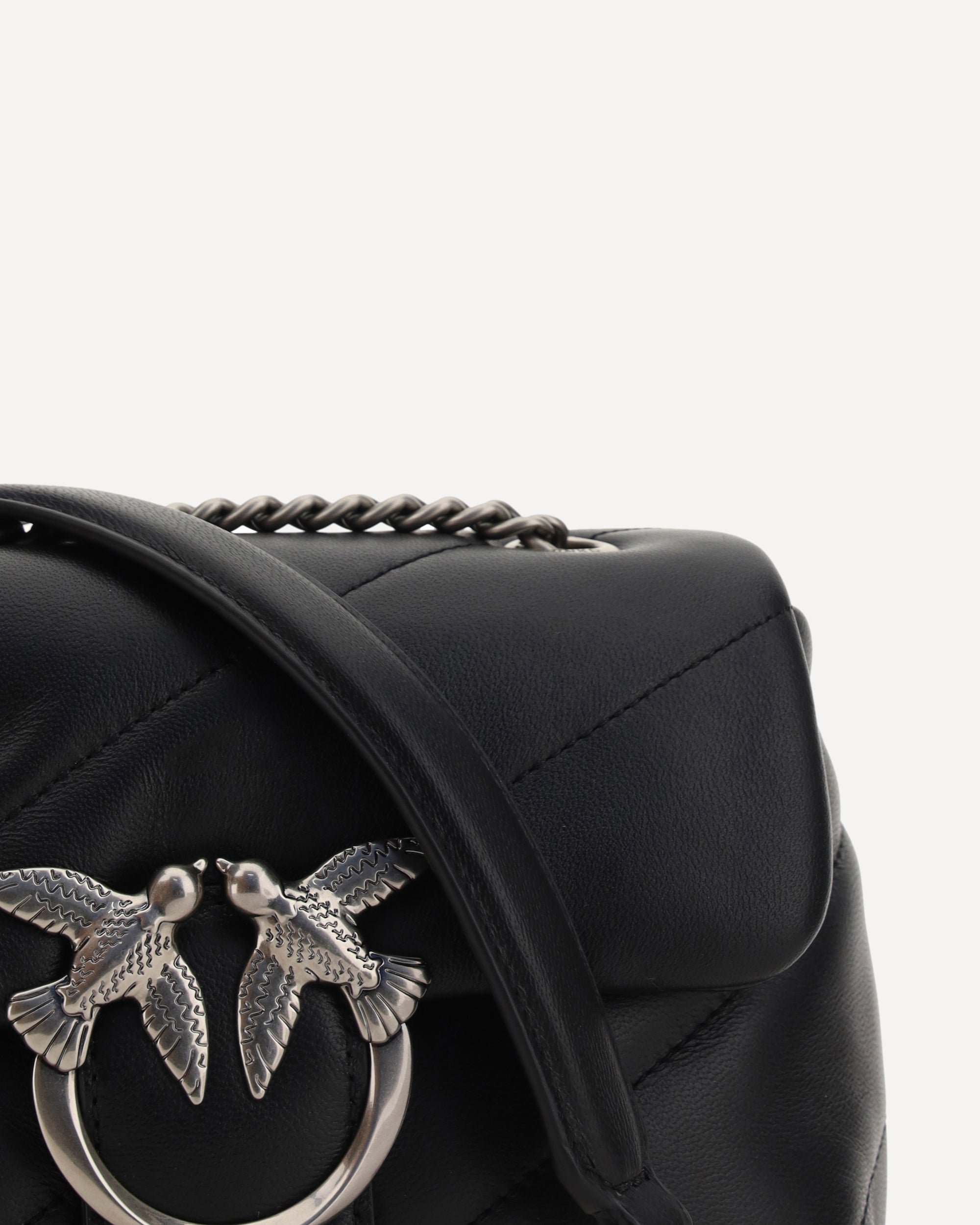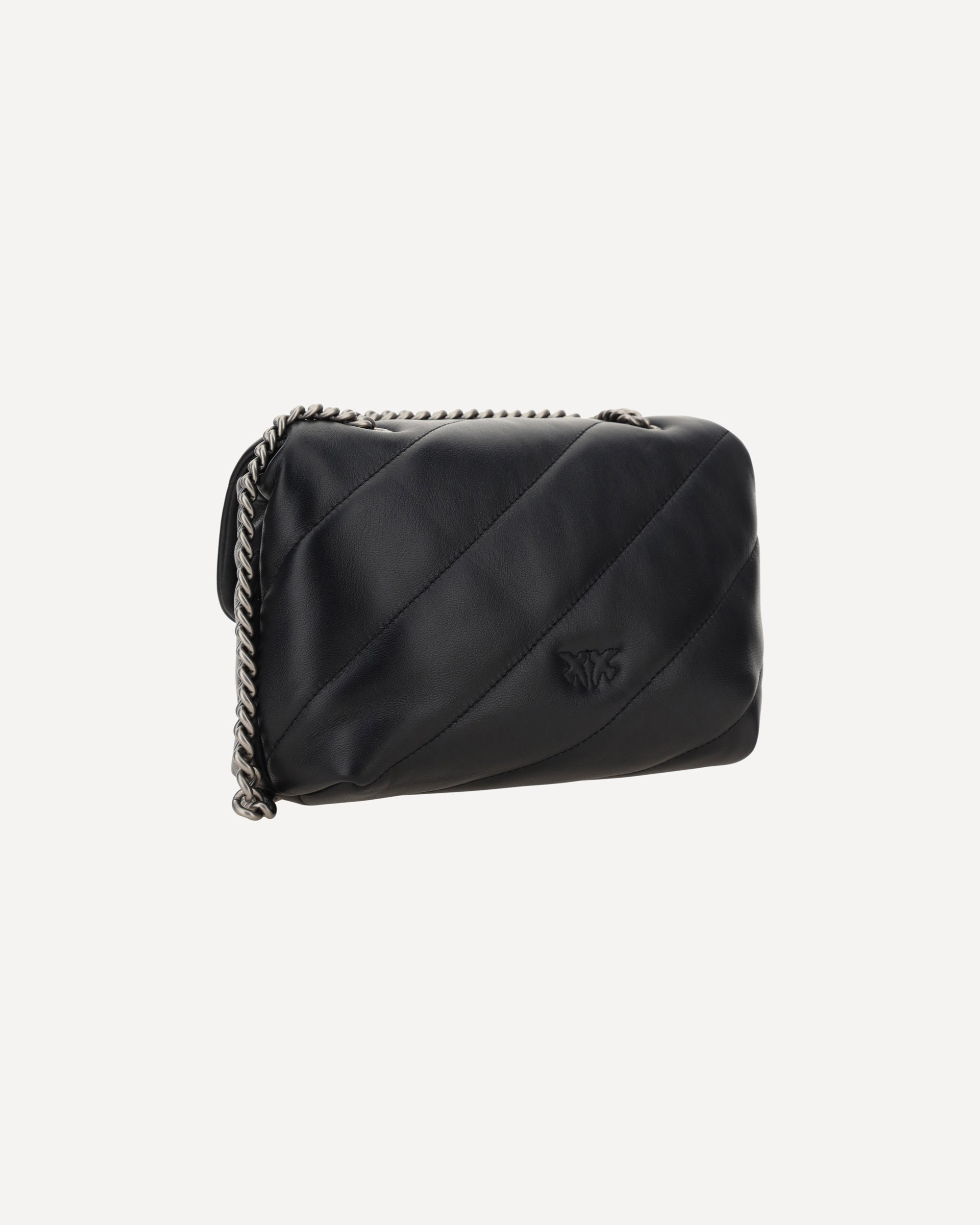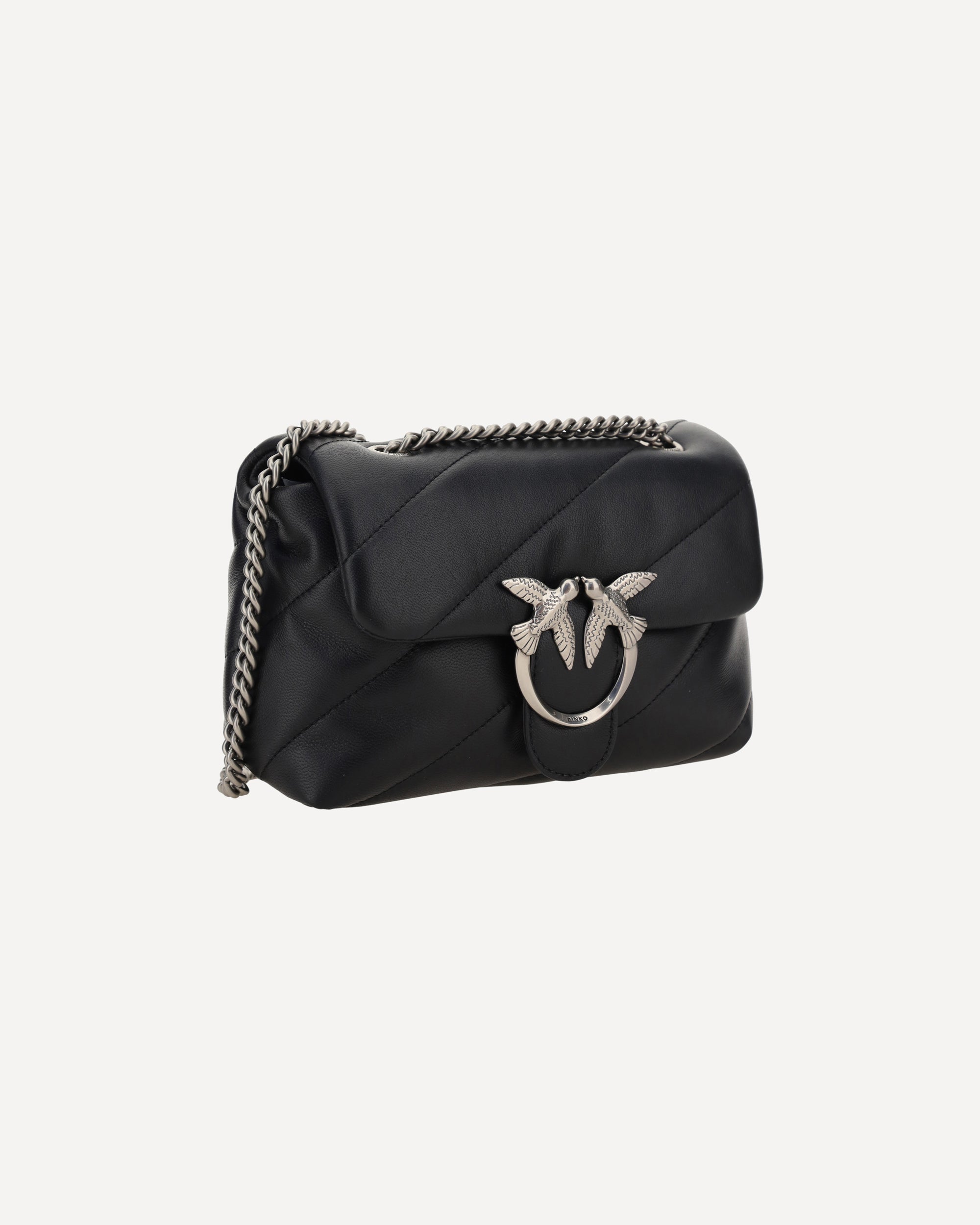 The Love Mini Puff leather Shoulder Bag by Pinko is a stylish and fashionable accessory. The front closure with magnetic button ensures practicality and security, while the iconic Love Birds logo, gold-plated and embossed on the front, adds a touch of luxury. The quilted and padded design gives the bag a rich and sophisticated texture. Inside, there is single interior compartment for excellent organization. The sliding chain strap offers versatility, allowing it to be worn on the shoulder or crossbody. On the back, the brand's iconic tone-on-tone embroidered monogram adds a discreet and refined detail.