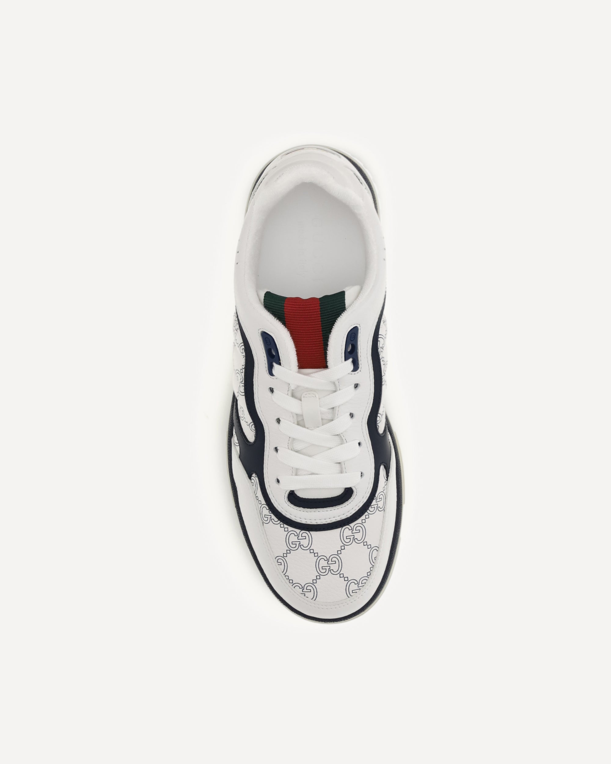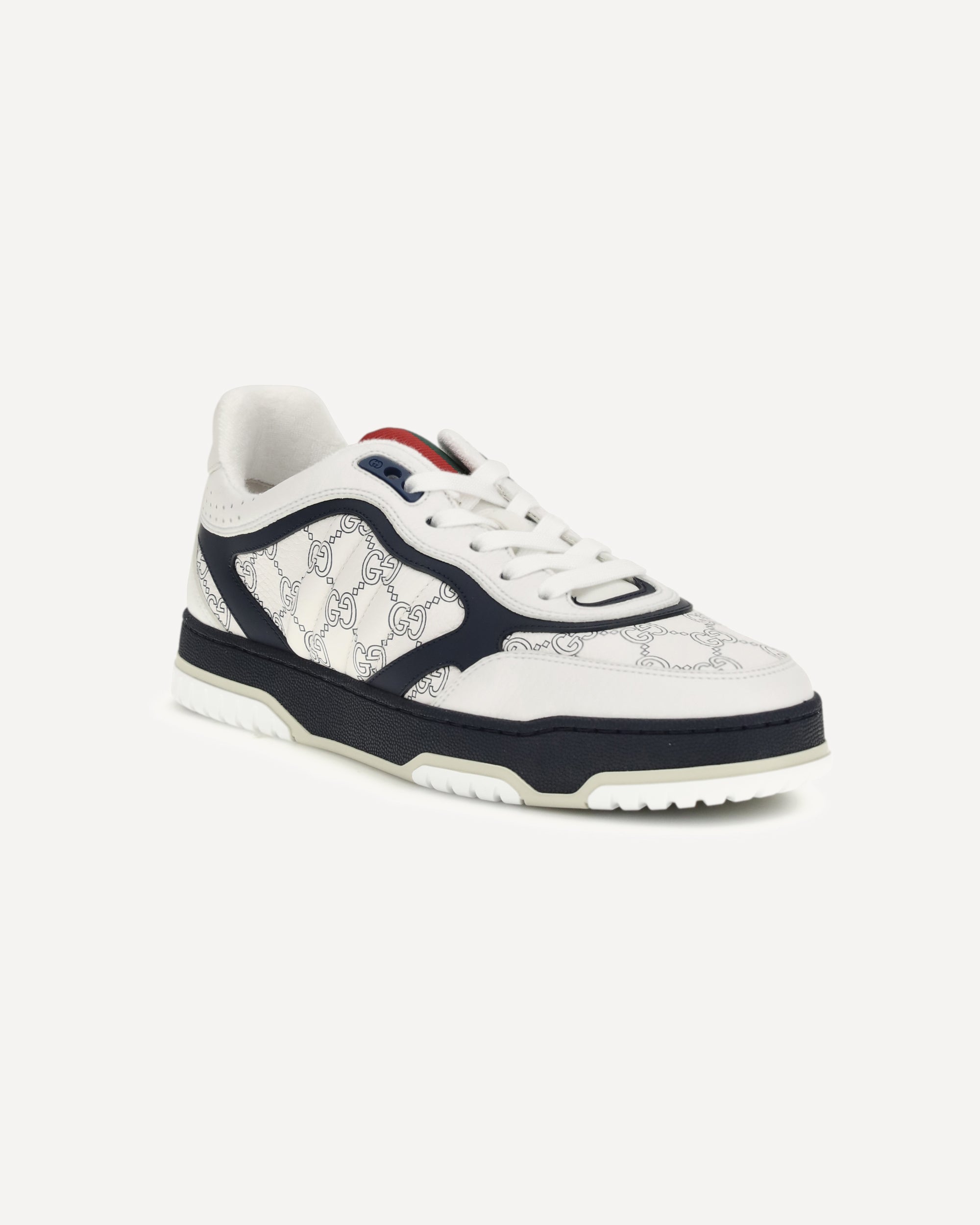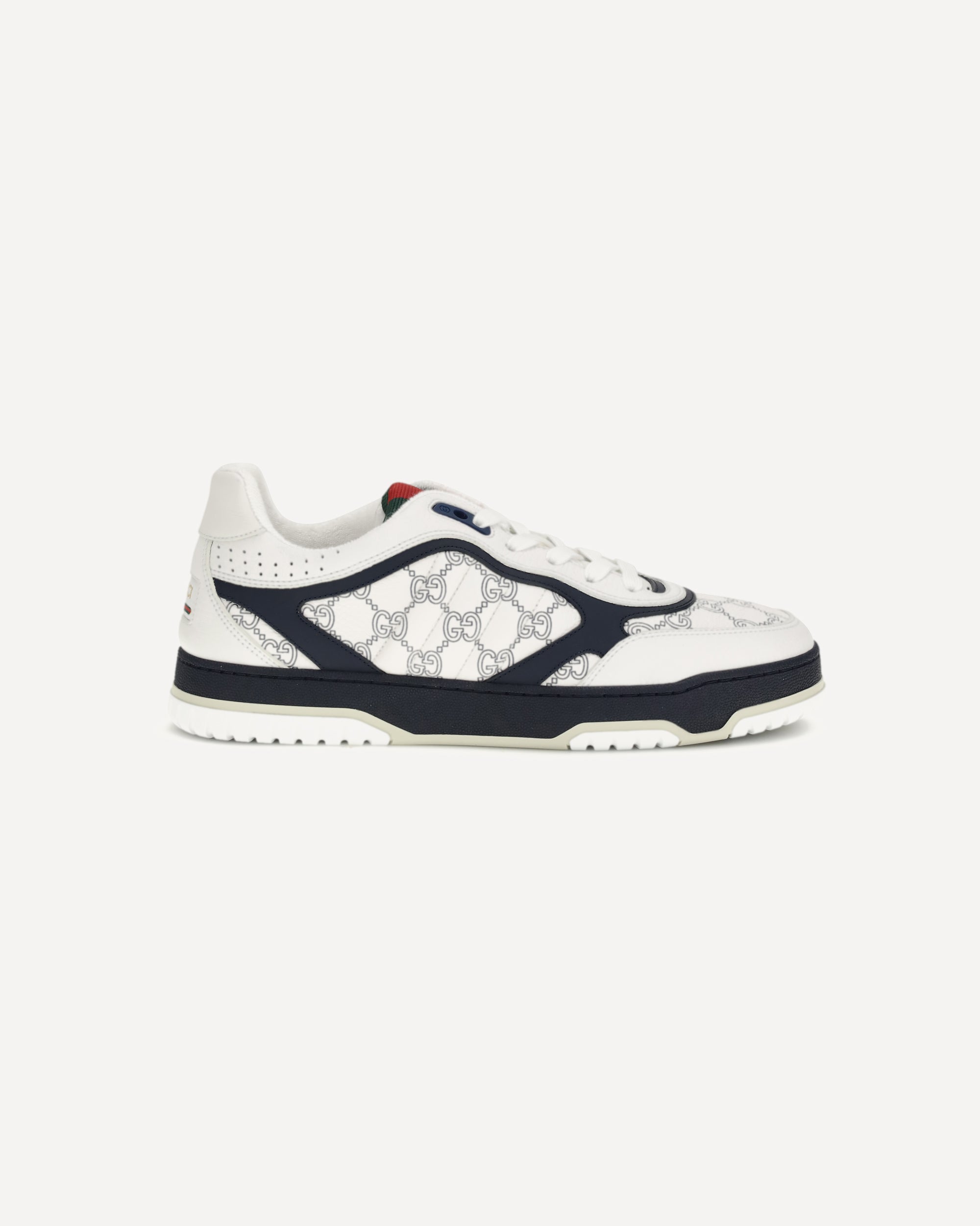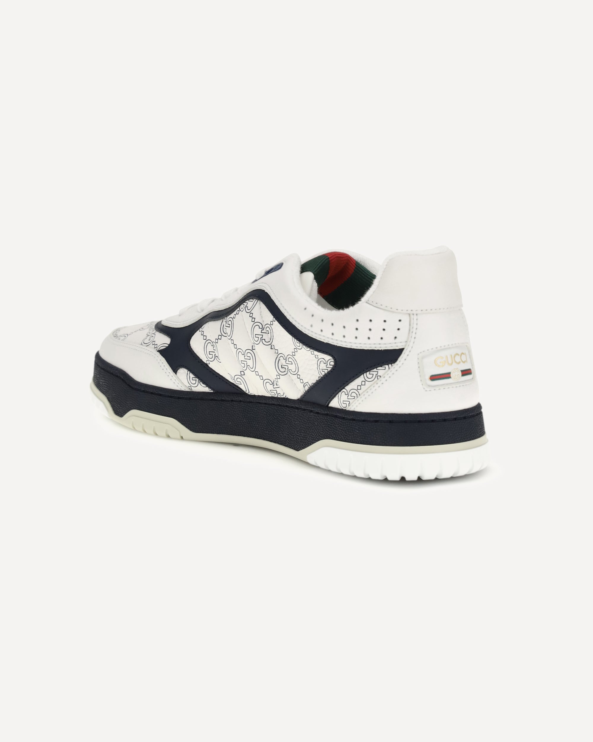 The Re-Web Sneakers by Gucci combine a classic and contemporary aesthetic, crafted in white and forest green grained leather with GG motif piping and forest green leather trim. The fabric lining ensures comfort, while the Web tag with Gucci and GG Crossing lettering, eyelet details and Web ribbon on the tongue enhance the design. The rubber sole features Incrocio GG logo and Gucci lettering.
