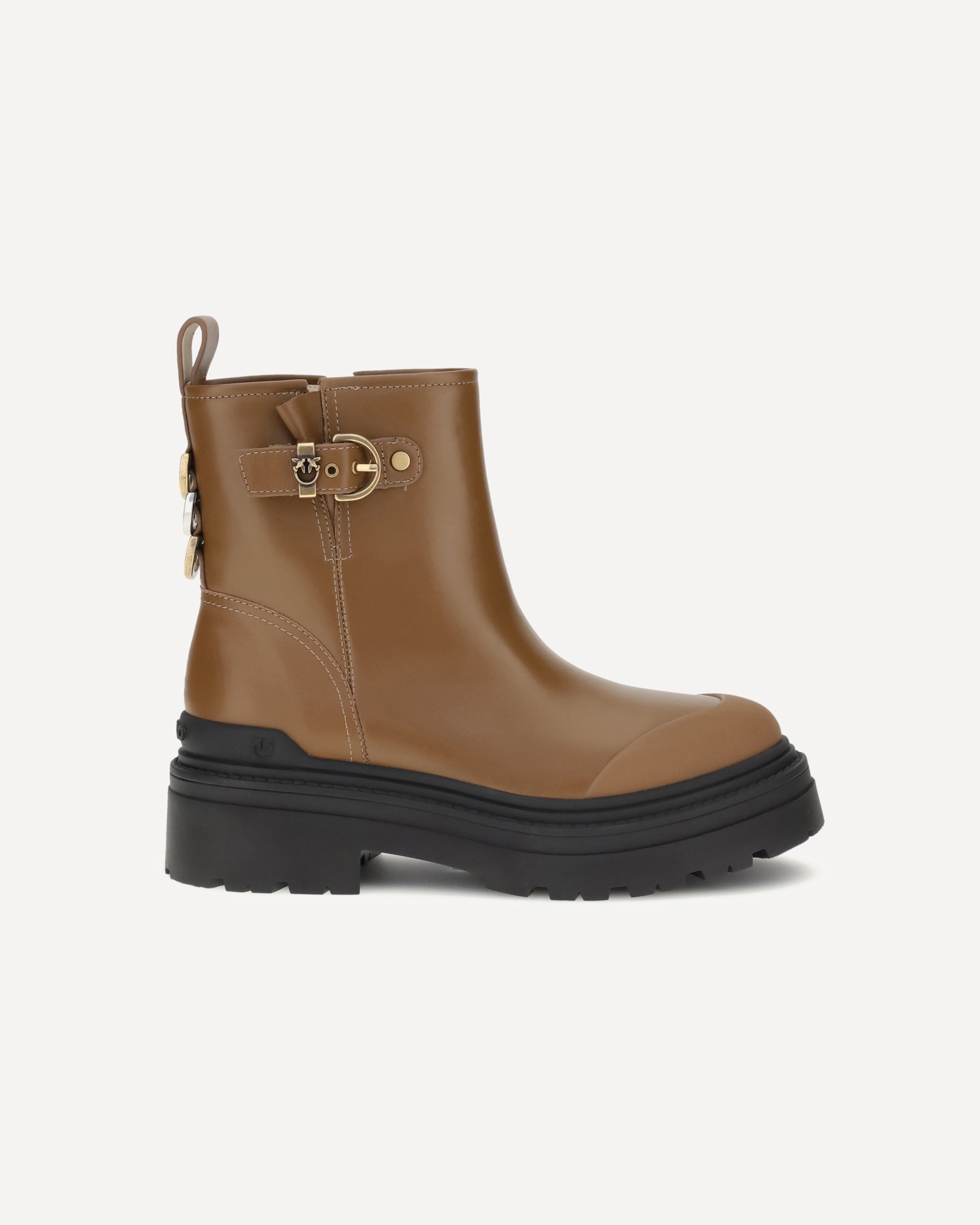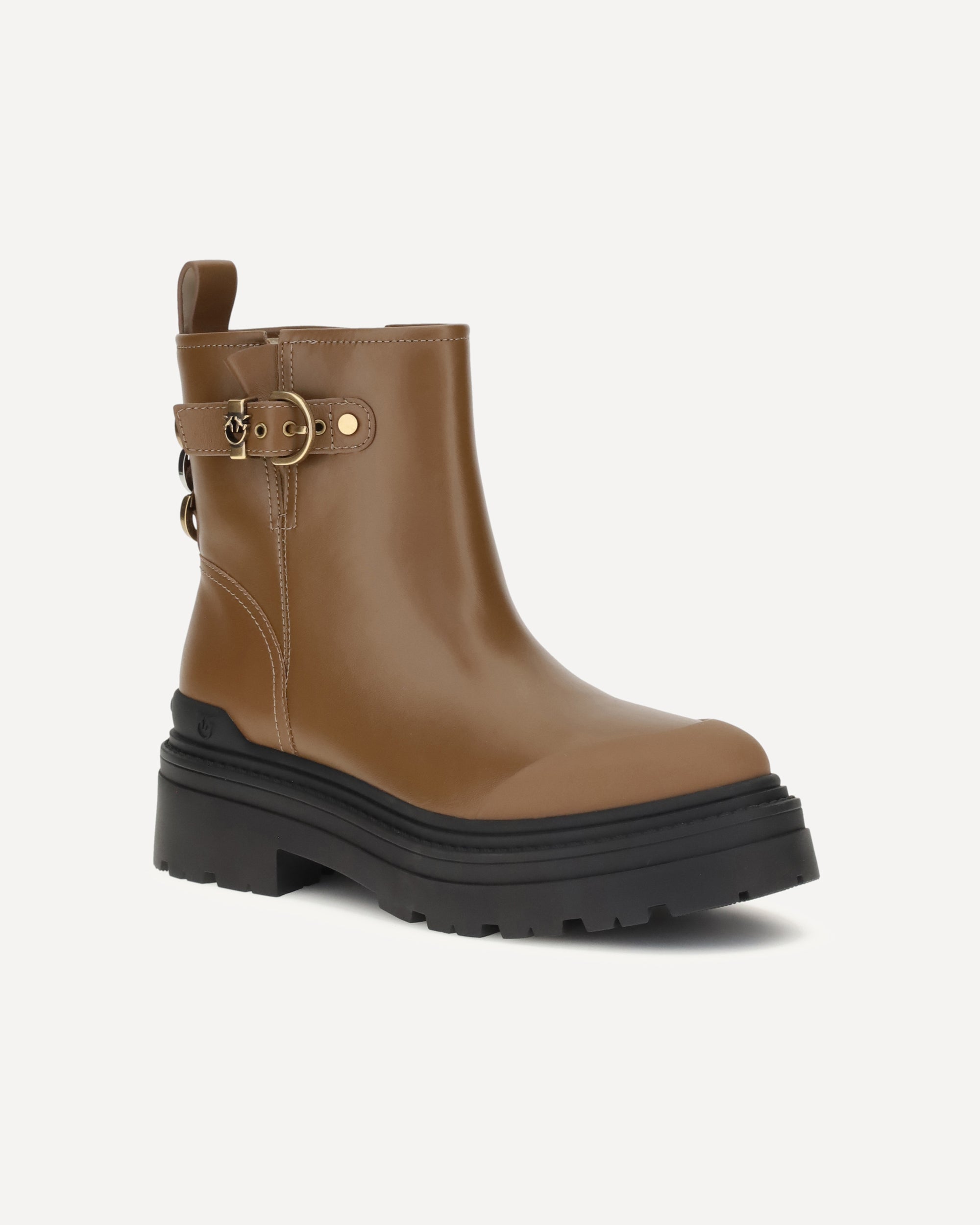 Pinko's Mia Ankle Boots are made of leather and feature a round toe. They feature a buckle and side zipper closure, an elegant metal Love Birds detail on the side and decorative applique rings on the back. The rubber sole ensures comfort and grip.