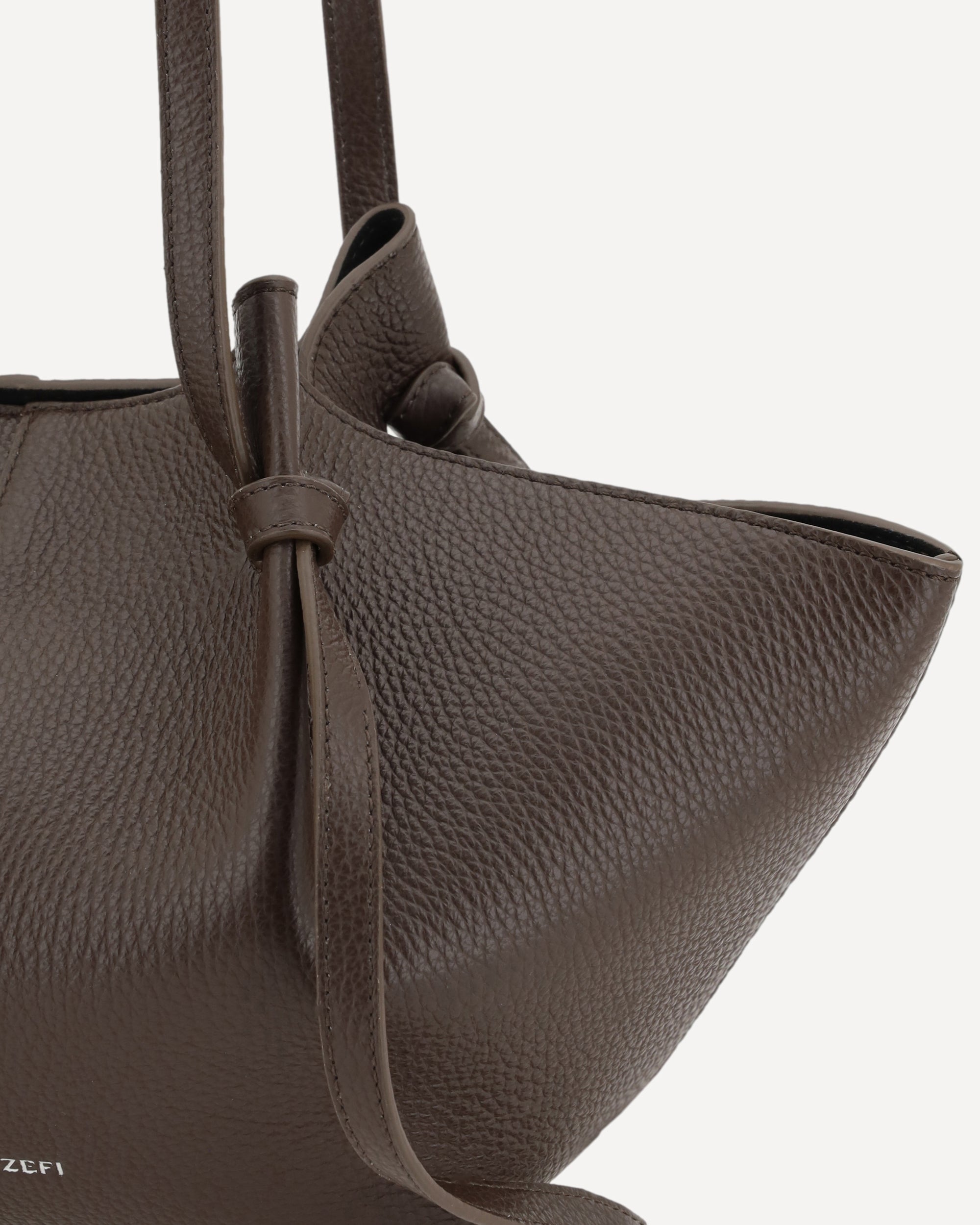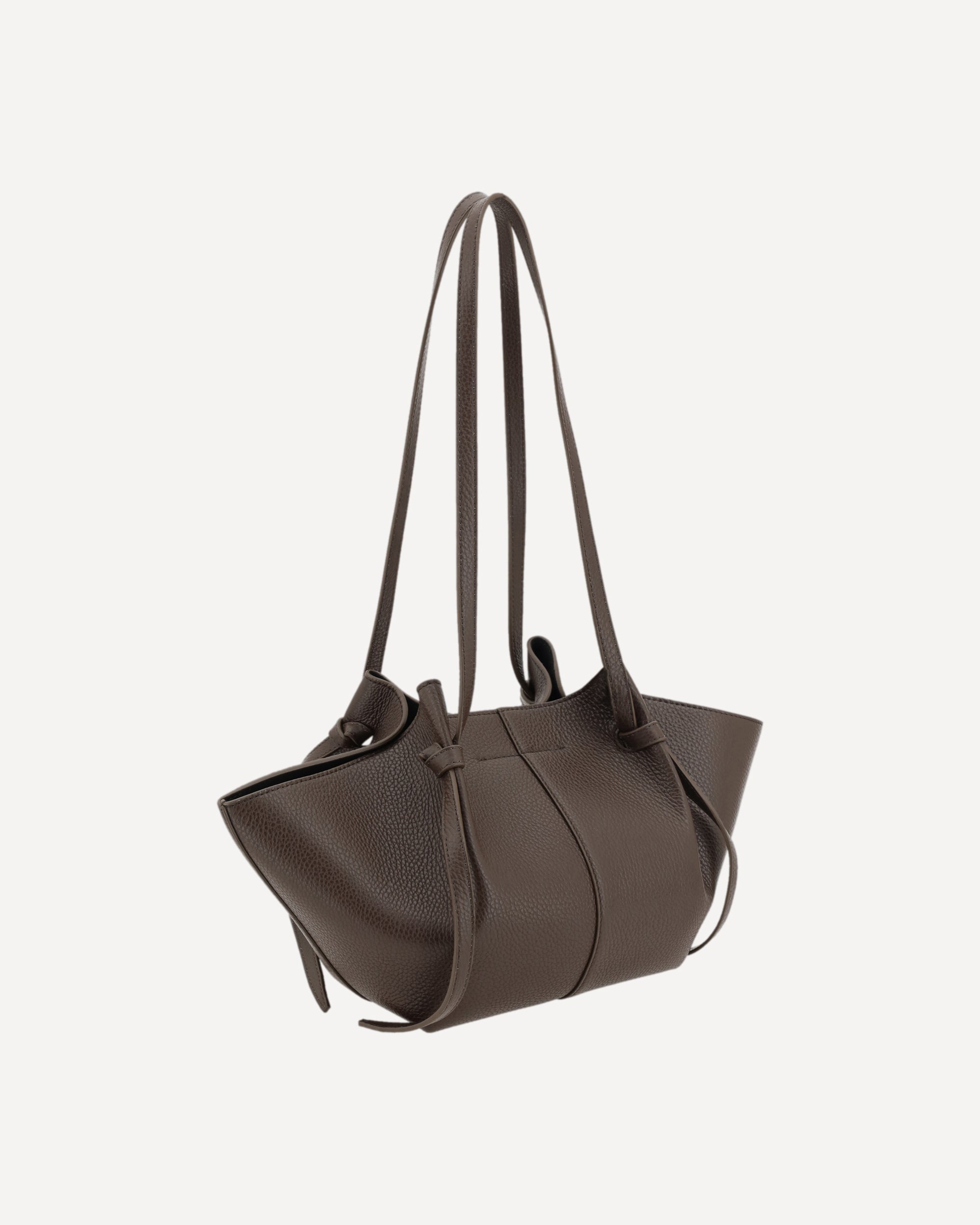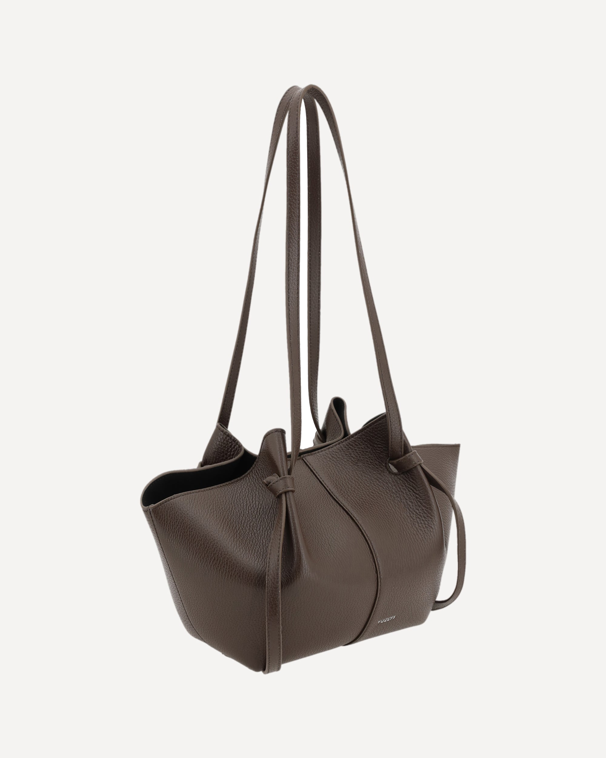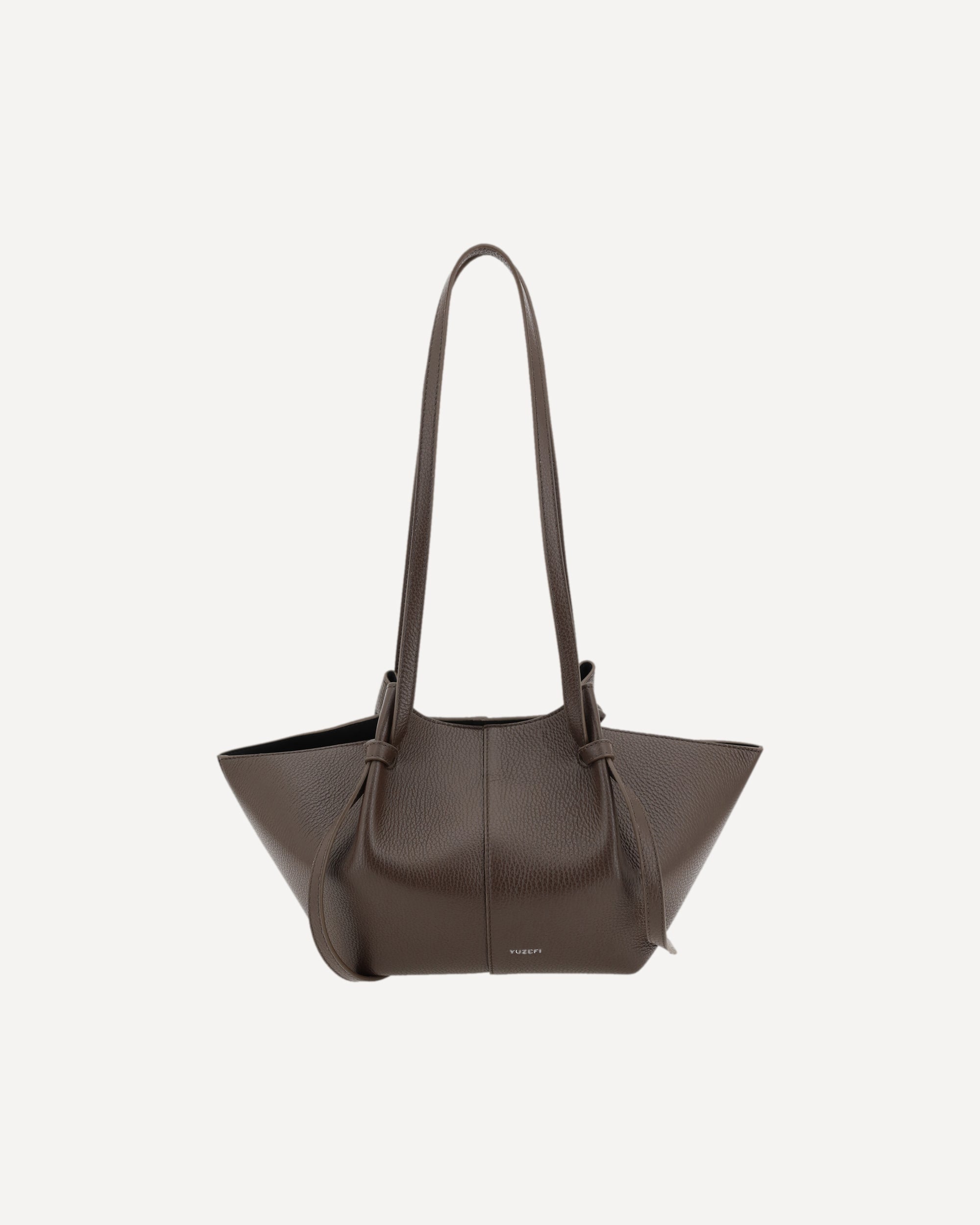 The Mochi leather Shoulder Bag by Yuzefi features a stylish leather design with a magnetic button top closure. Double flat handles ensure practicality, while the interior, with a single compartment, offers ample space. The brand's iconic signature is contrastingly printed on the front. The soft, fold-over geometric design adds a touch of modernity and versatility to this refined accessory.
