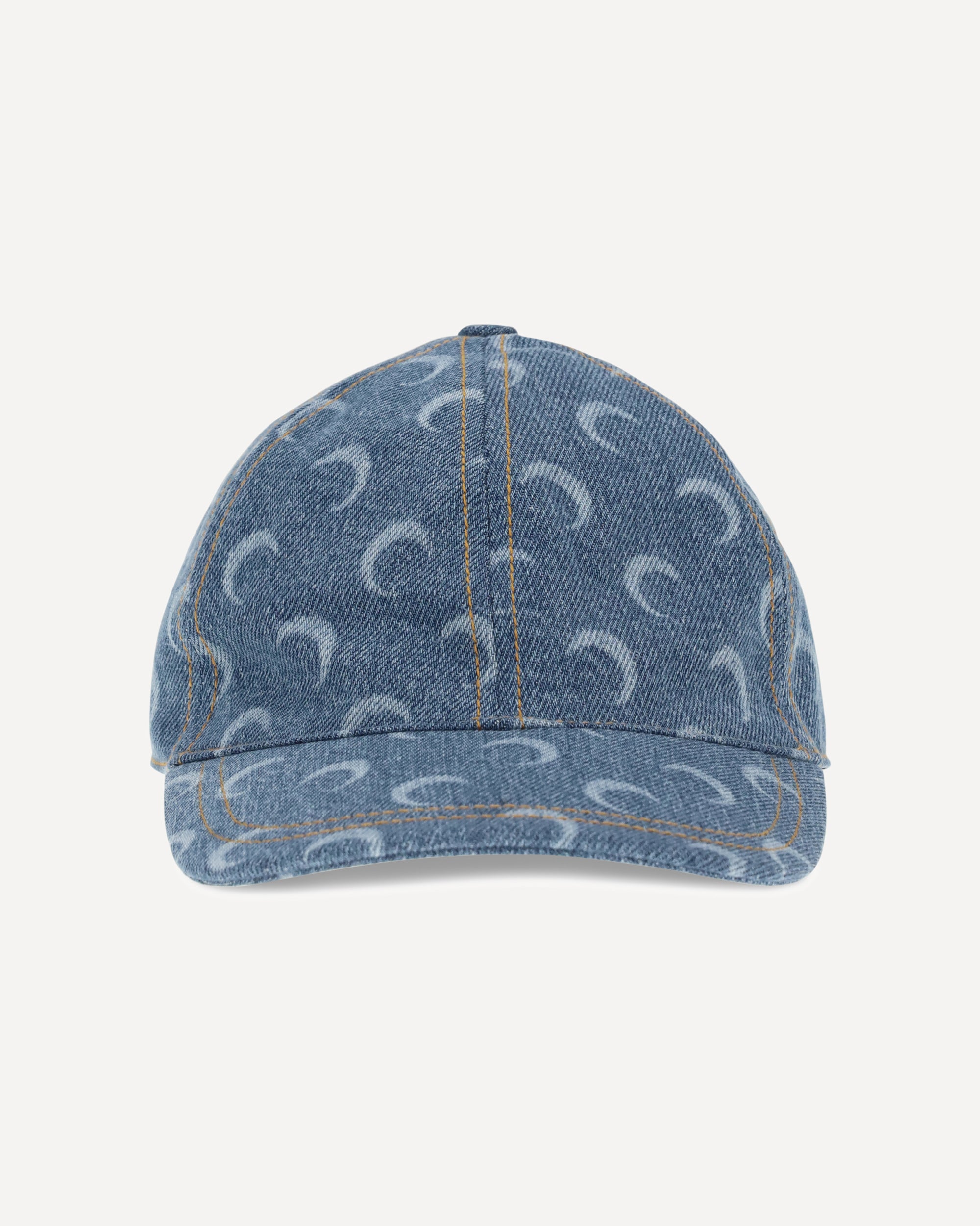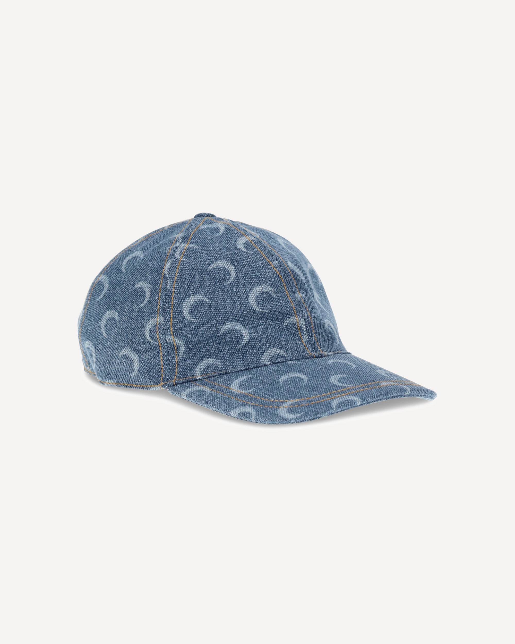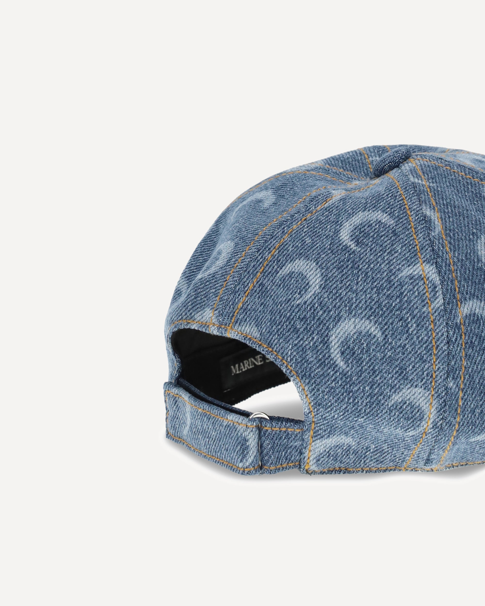 Moon Laser Denim Baseball Hat by Marine Serre is made of denim with an all-over moon pattern obtained by laser processing. Equipped with a cotton lining, it features an adjustable Velcro strap with buckle and a logo label sewn on the inside. A distinctive accessory with an urban and contemporary style.