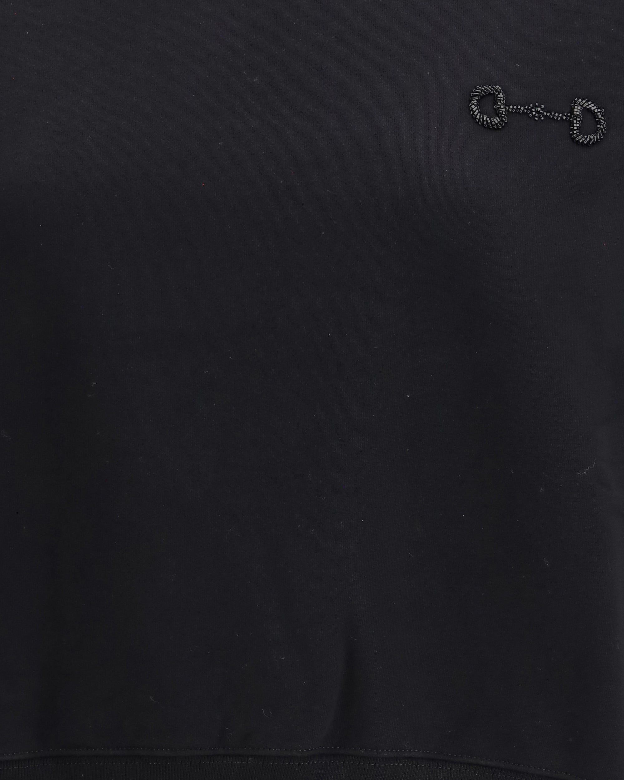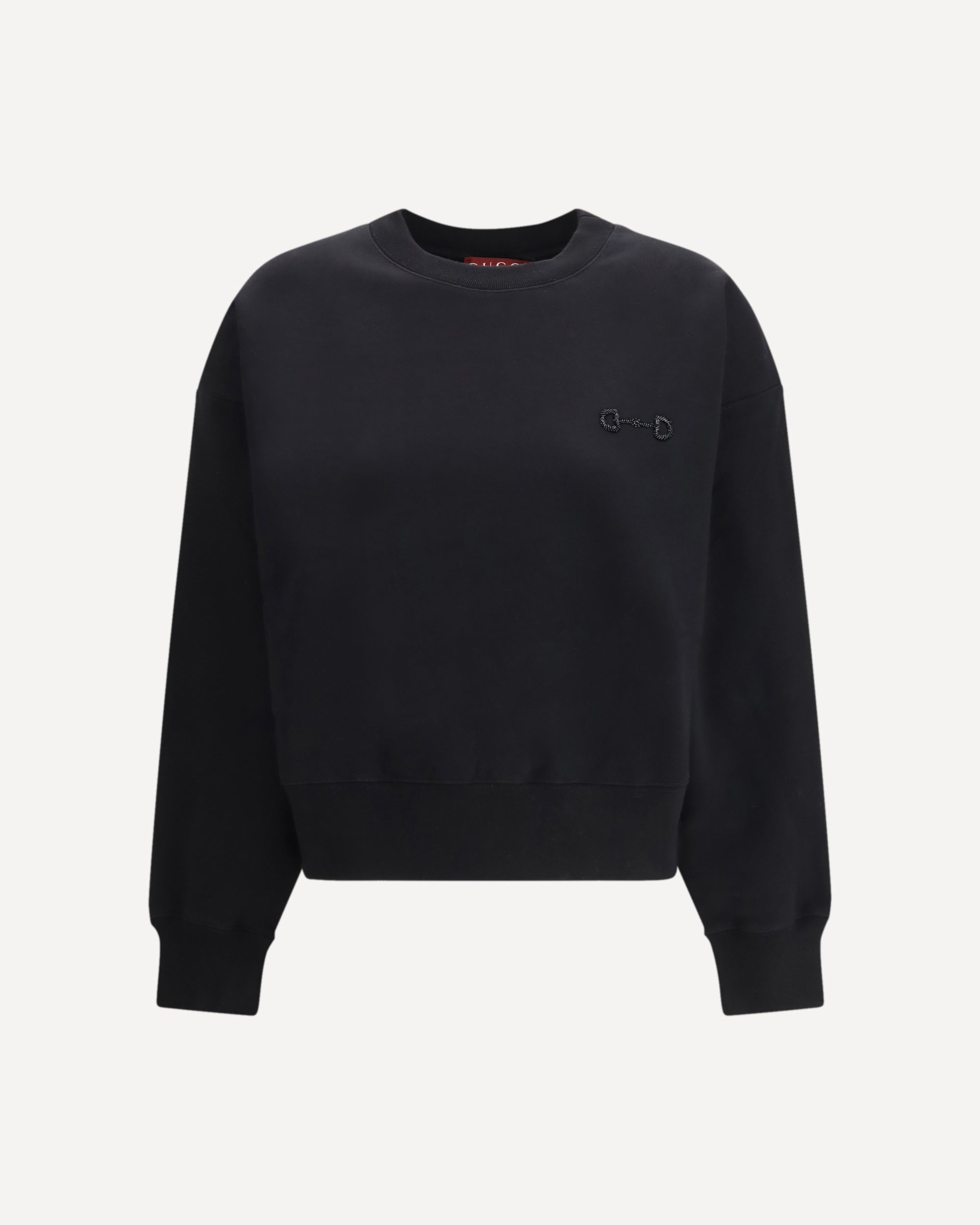 The brushed cotton jersey Sweatshirt by Gucci revisits the Maison’s iconic codes through a contemporary and luminous approach. The brushed jersey shapes a relaxed silhouette with a crew neckline and dropped shoulders, while ribbed trims define the structure. The Horsebit embroidery crafted in thread and embellished with beads stands out as a focal detail, adding a subtle sparkle that elevates everyday wear.