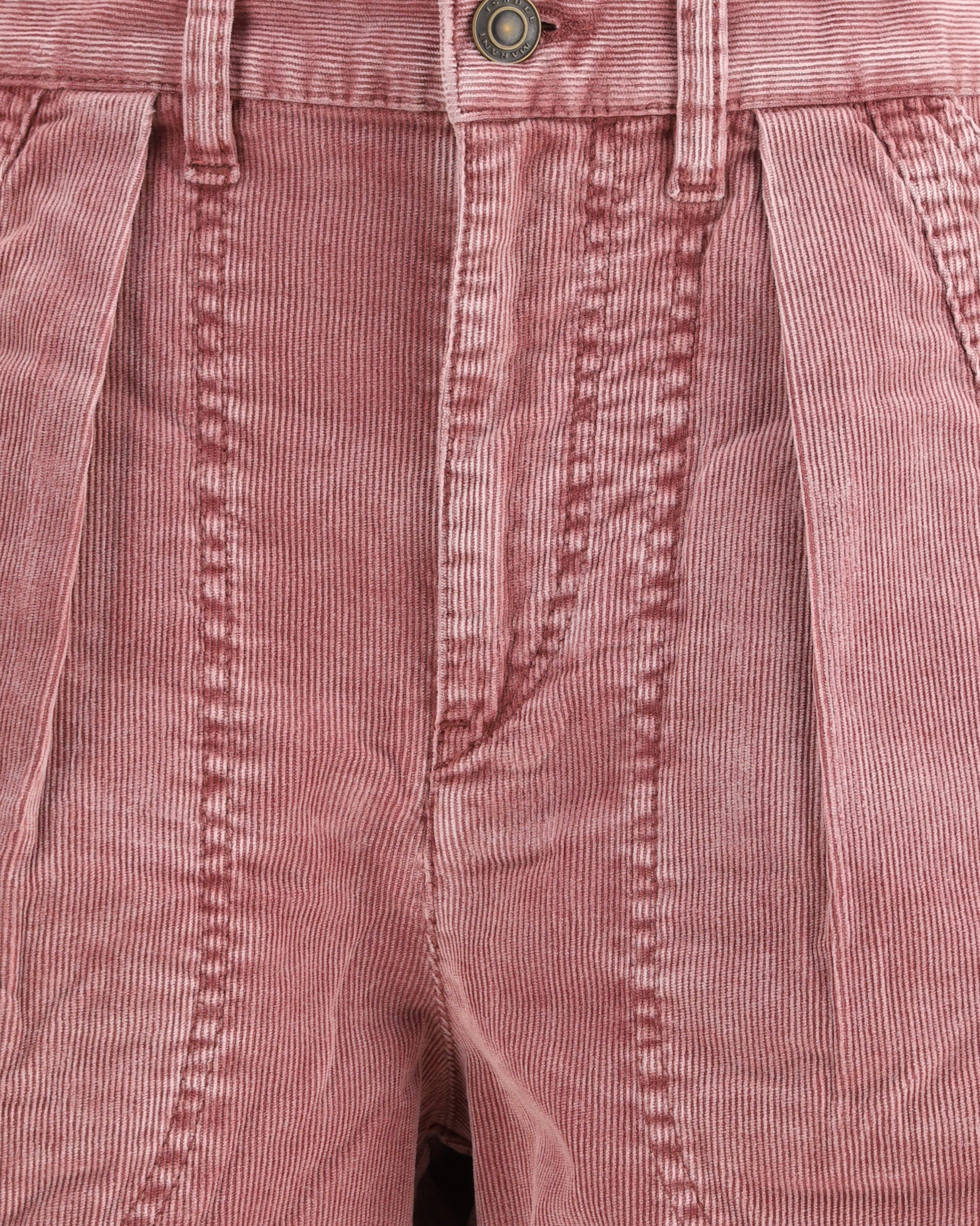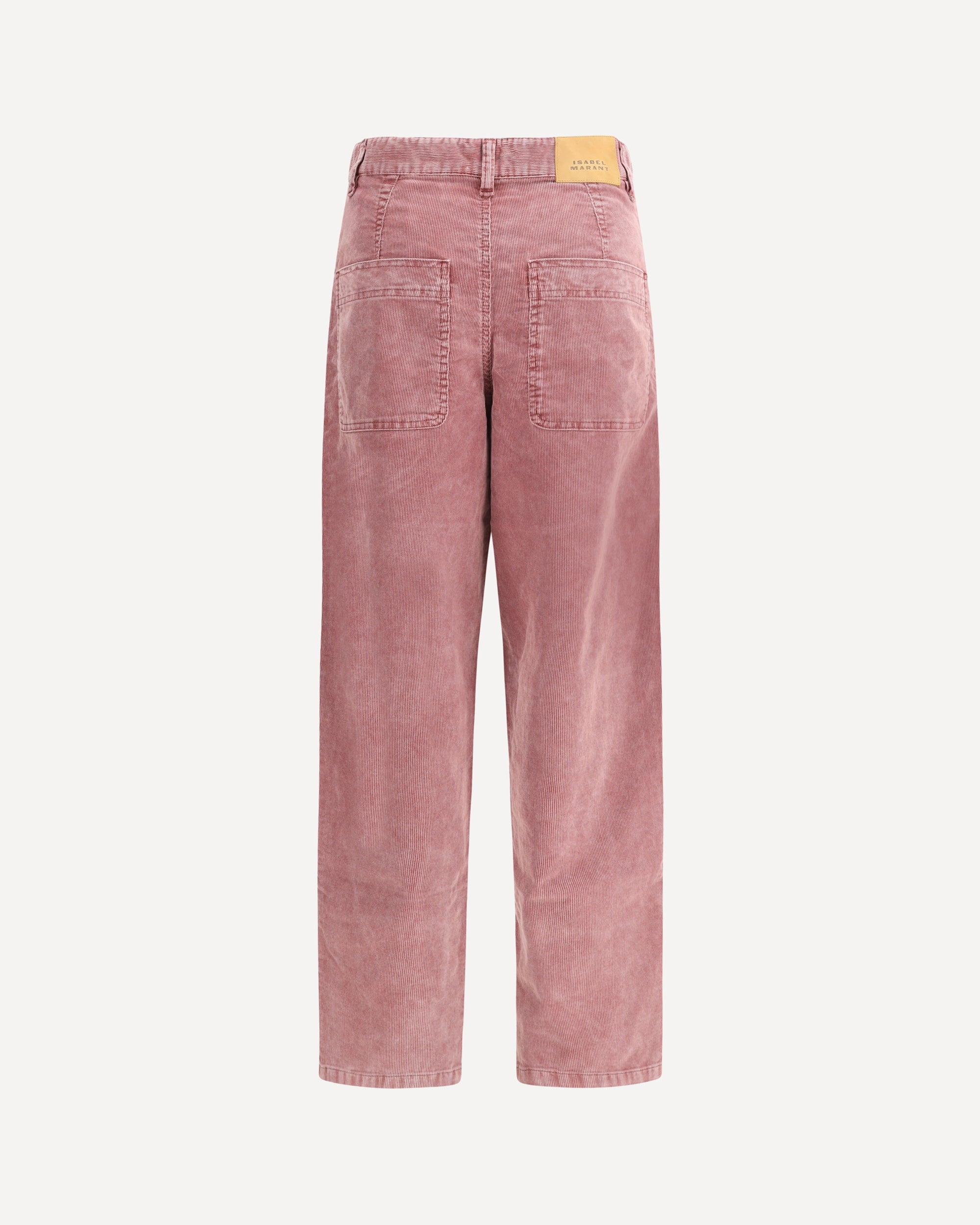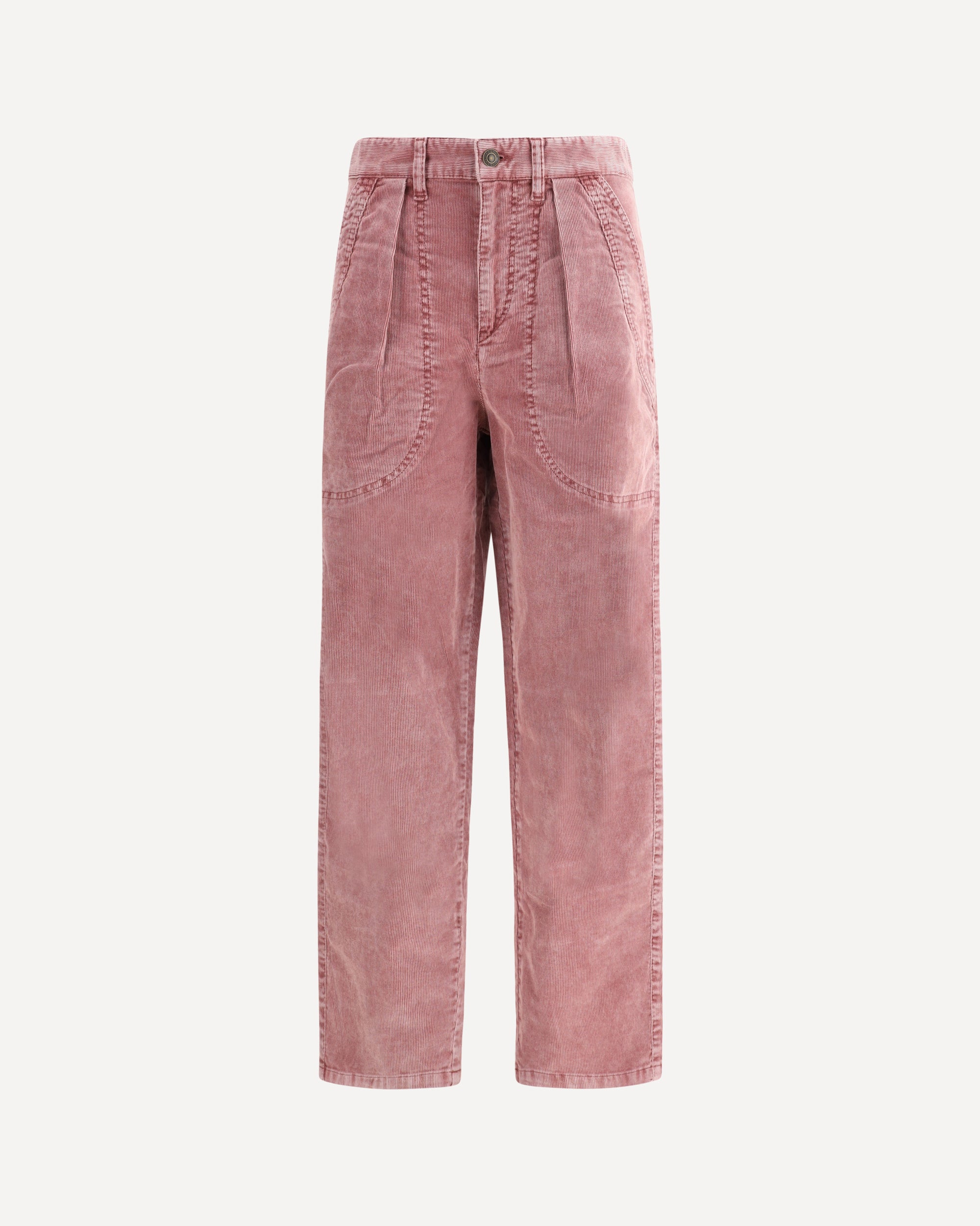 Marant Étoile's ribbed velvet Pants are made of délavé velvet and are distinguished by their refined casual style. They feature a waistband with belt loops, a metal button and covered zipper closure, and delicate pleating at the front. Side pockets with rounded topstitching and patch pockets on the back add a functional touch. The design is completed by a leather label with embossed "Isabel Marant" logo on the back, a regular waist, and a wide, tapered cut.