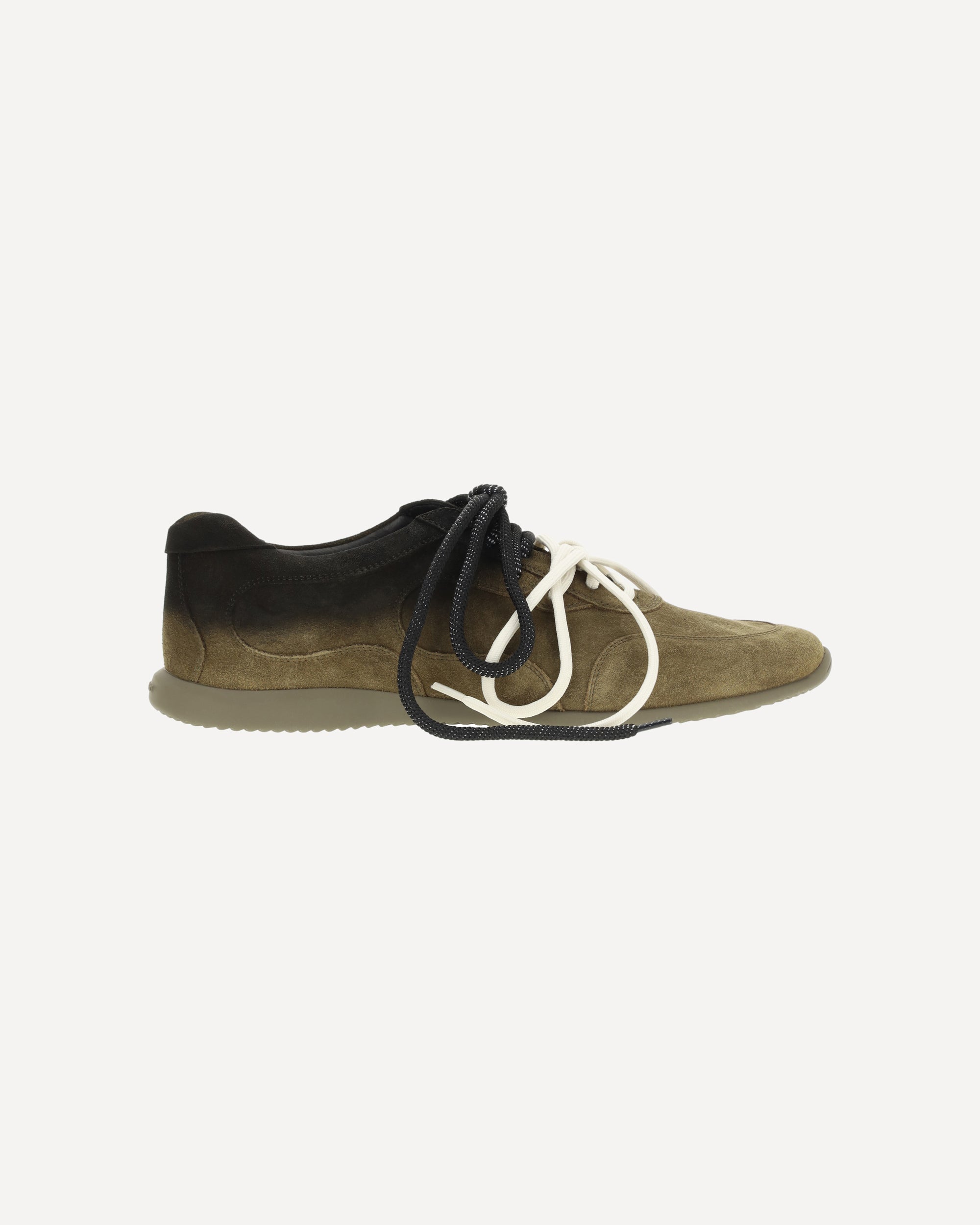 Namacheko's Osterly Sneakers are made of soft suede, with a lace-up closure and curved stitching on the upper that enhances the design. A padded detail at the back of the shoe adds comfort and style. This model features an internally developed custom last and a thin rubber sole with the logo imprinted on the back. In addition, a handmade spray painting technique around the collar of the upper gradually fades, giving it a unique and distinctive touch.
