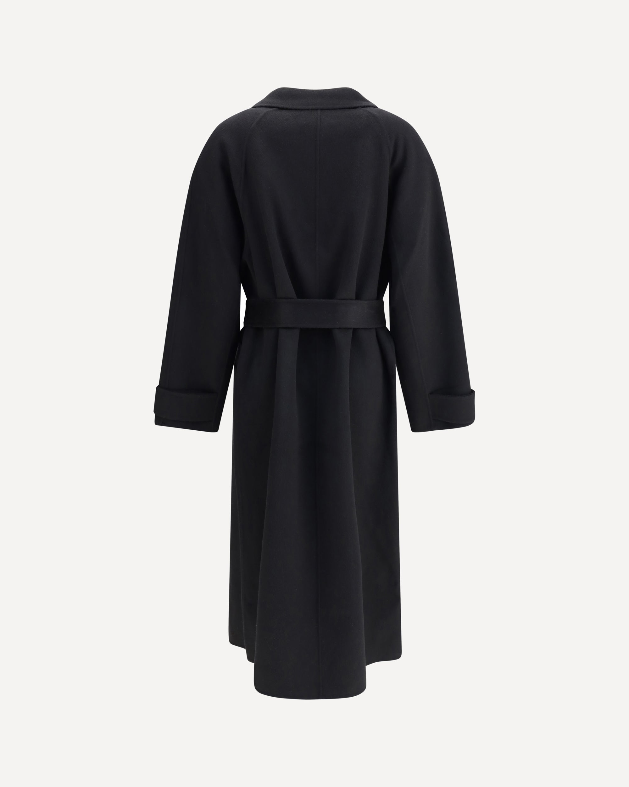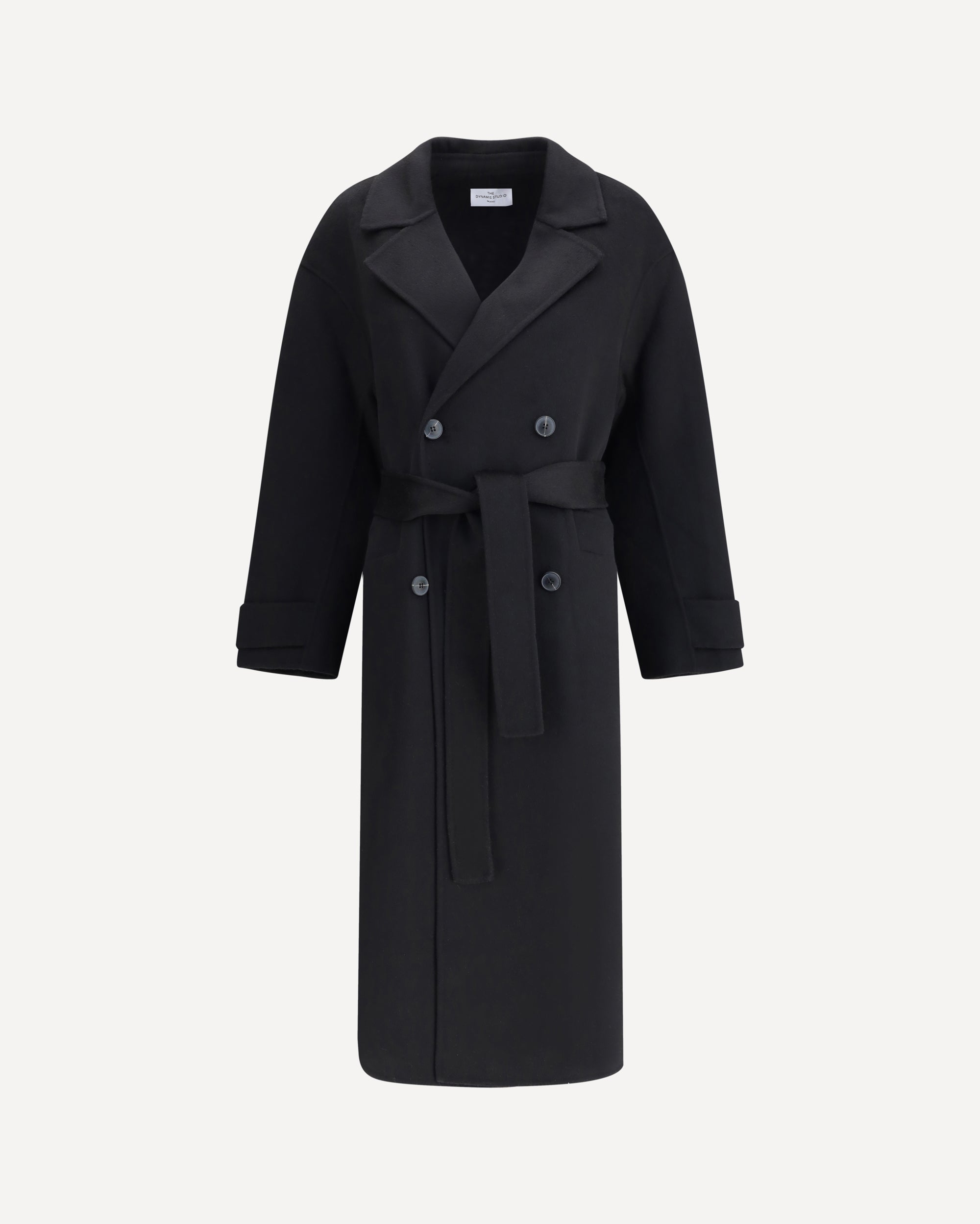 Dynamis Studio's double-breasted long Coat is a timeless classic revisited with an essential and refined style. Featuring classic lapels and a front button closure, it has a built-in belt to tie at the waist that enhances the silhouette. Two welt pockets complete the design, making it a versatile garment ideal for any occasion.