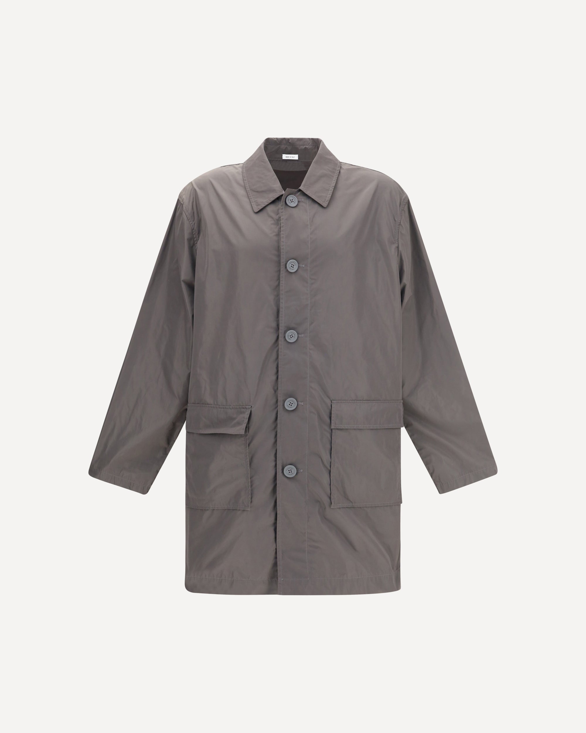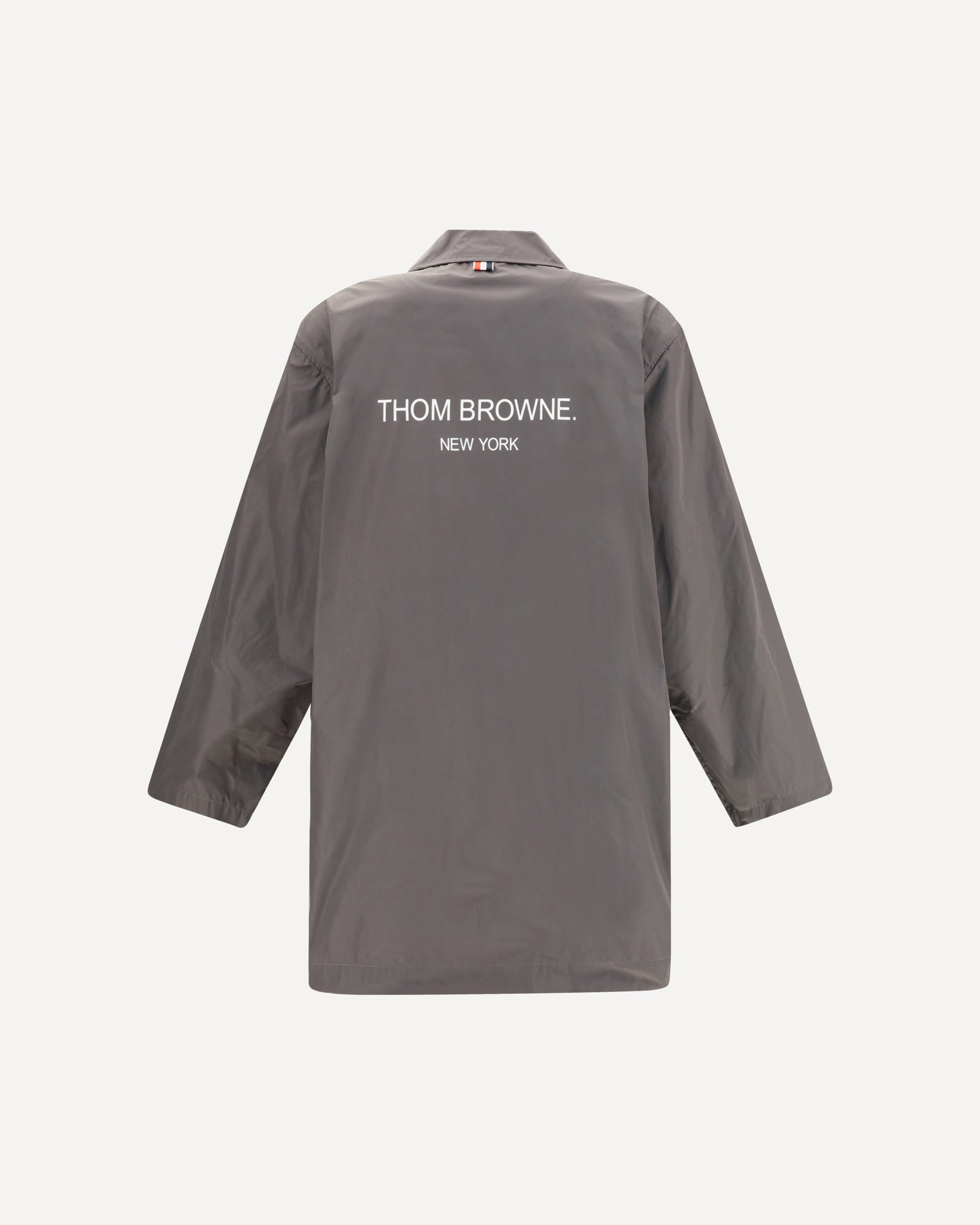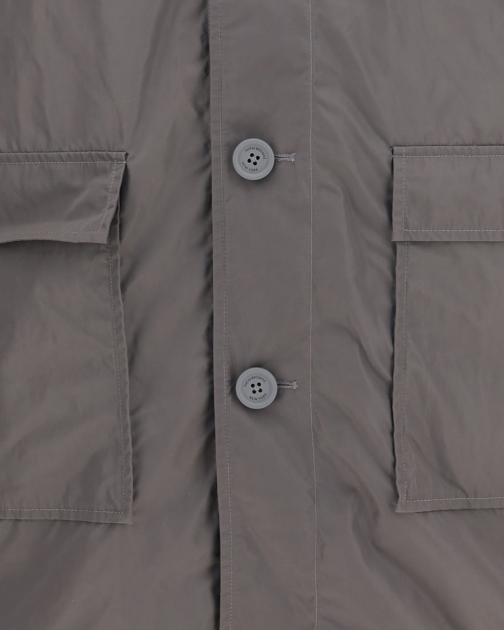 The Memory Tech Packable Smock by Thom Browne combines functionality and style in a lightweight, versatile piece that can be easily packed away into its removable pouch. It features a front button closure, two front flap pockets, and an interior pocket with name tag, along with a detachable interior pocket. Side button vents are finished with the brand’s signature striped grosgrain trim, while the back loop tab pays tribute to athletic heritage.