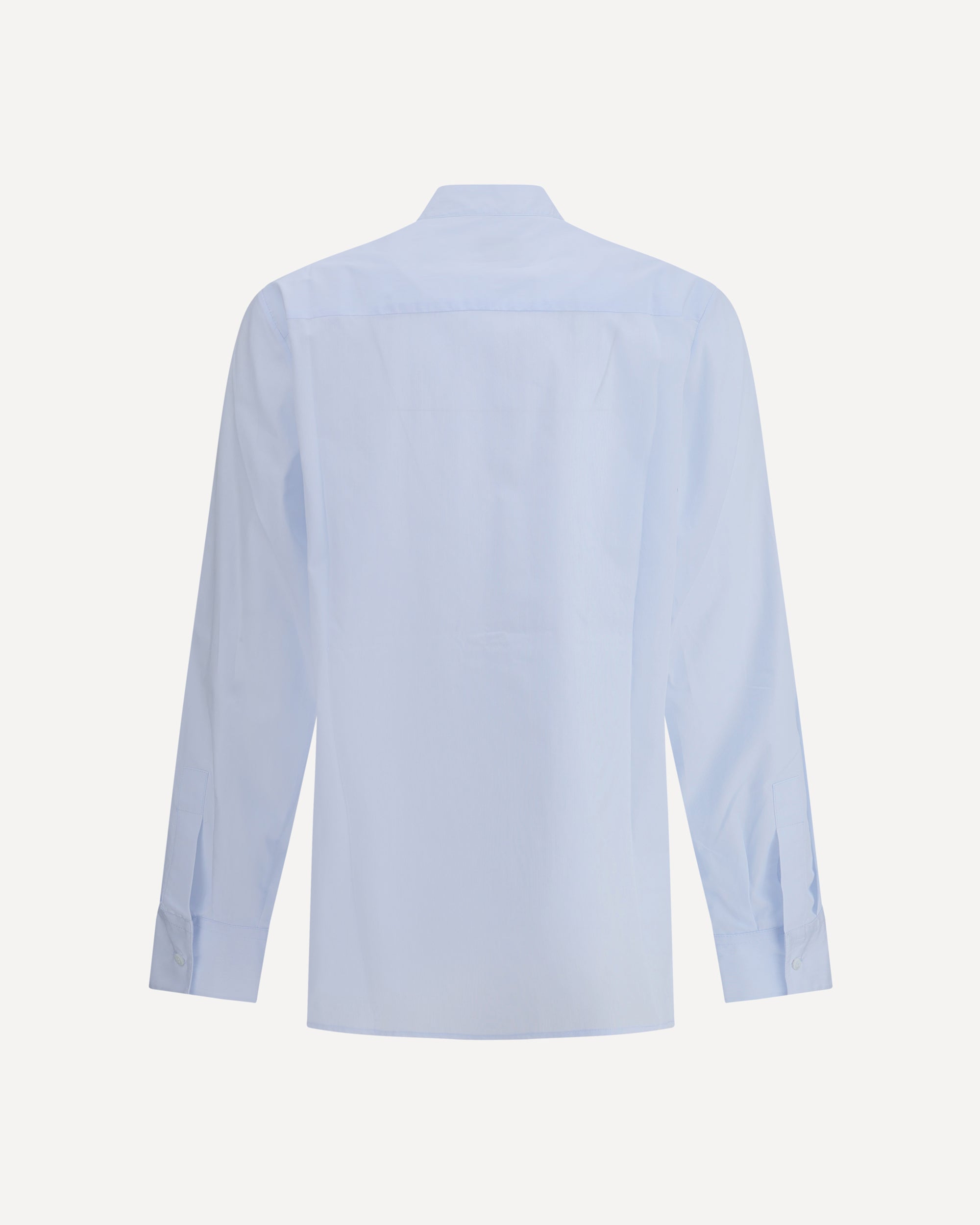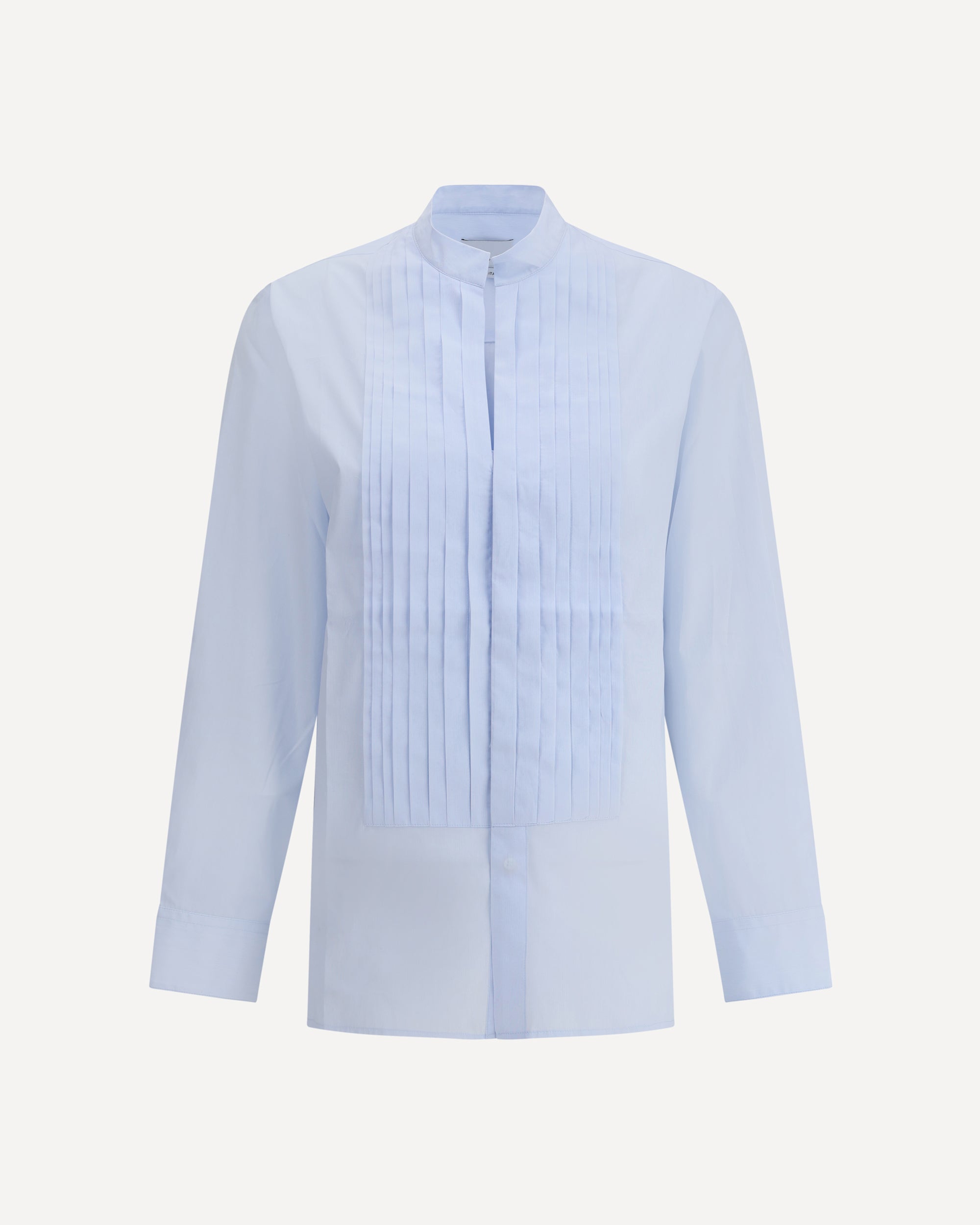 Sa Su Phi's Petra Tuxedo Shirt by Sa Su Phi is an elegant and refined garment designed for a sophisticated look. The front closure with concealed buttons gives a clean, minimalist look, while the mandarin collar adds a touch of modernity and class. The pleat detail on the front enriches the design with an element of texture that enhances the silhouette, creating an elegant and structured effect. Perfect for those seeking a versatile shirt with a distinctive style, ideal for both formal occasions and more contemporary looks.