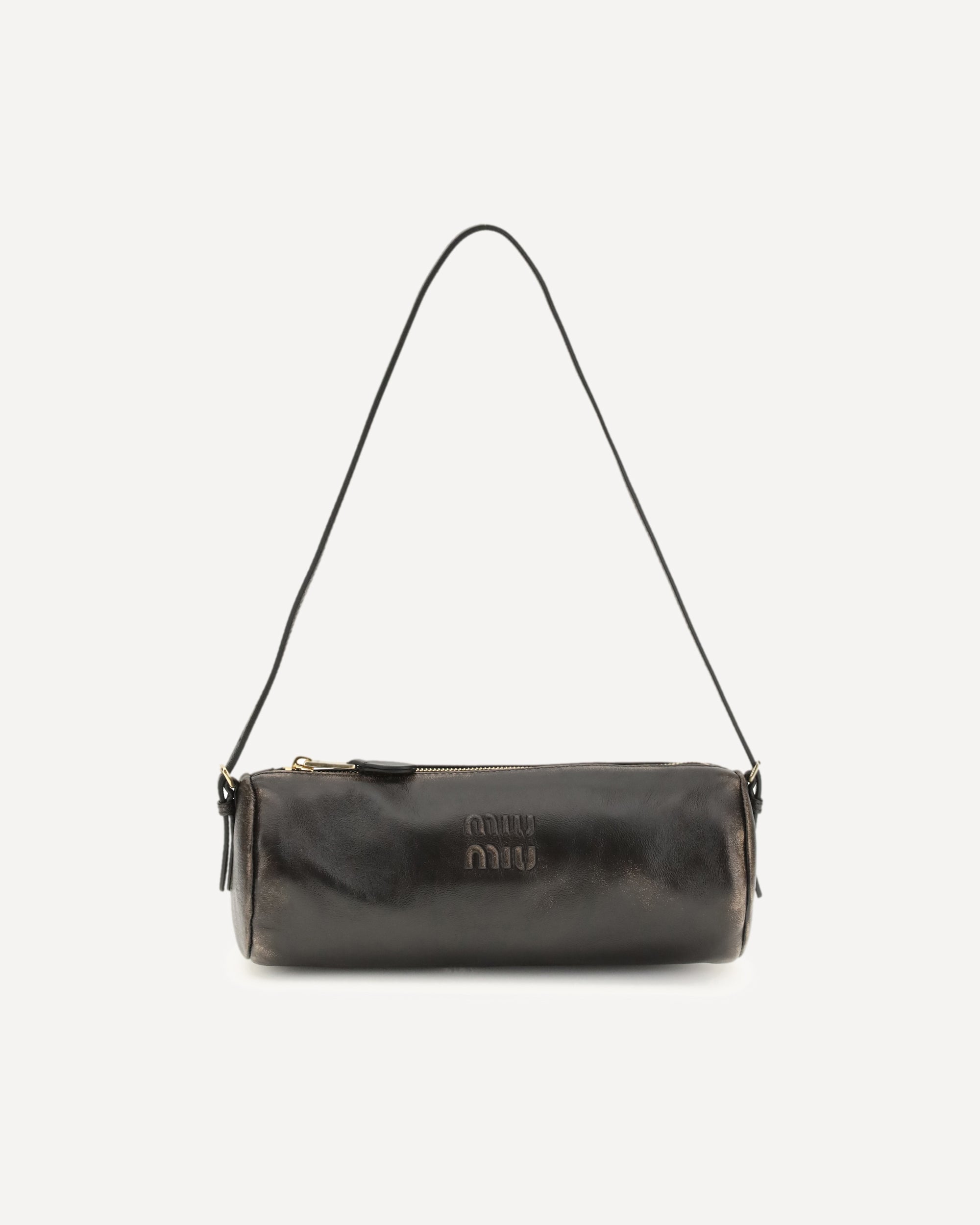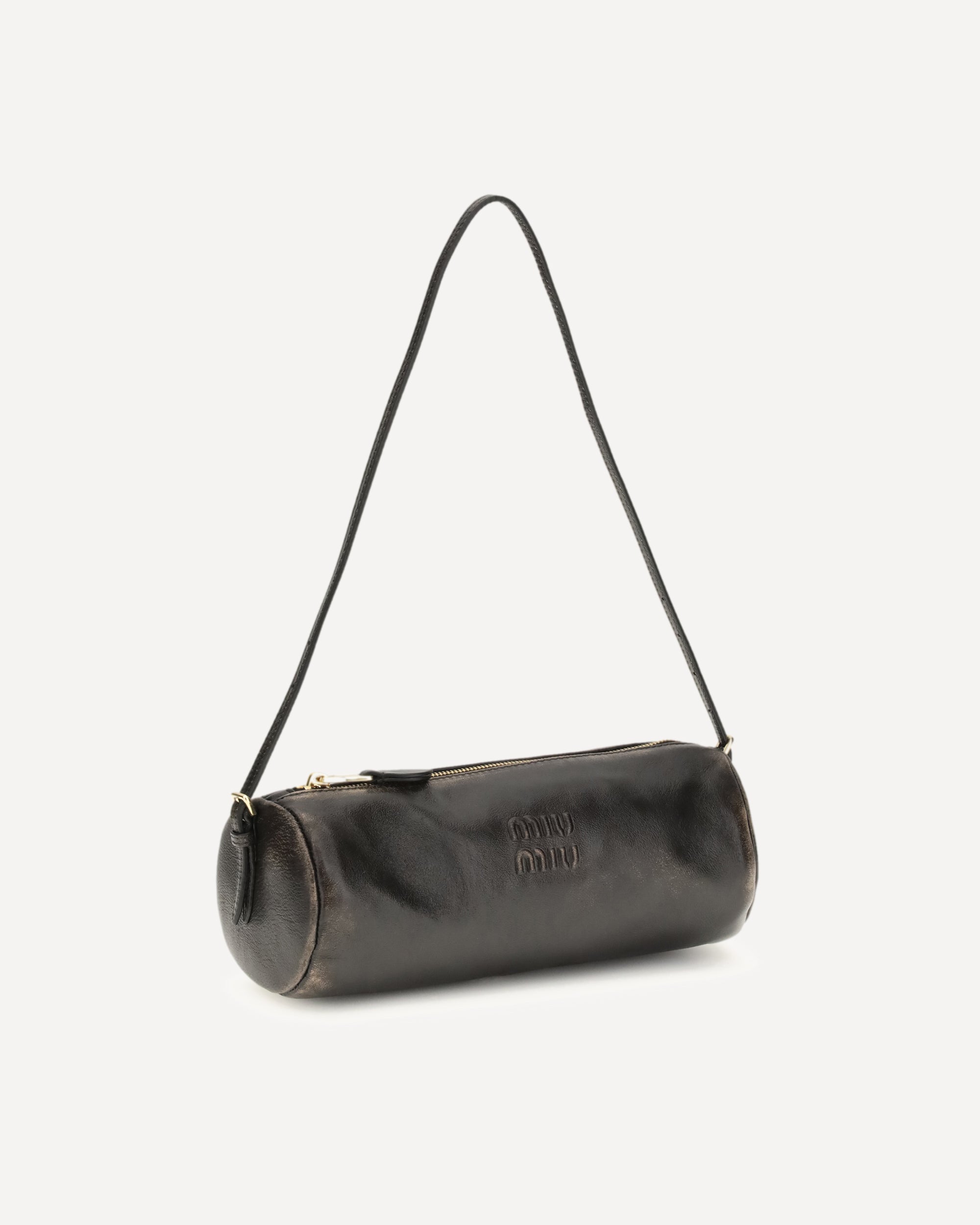 The Pouch crafted in aged-effect nappa leather by Miu Miu, featuring a soft, refined silhouette. The adjustable and removable shoulder strap allows it to be worn on the shoulder or crossbody, while the tone-on-tone embossed logo on the front adds an iconic yet understated touch. The zip closure is complemented by gold-tone hardware for a luminous finish. The interior, lined in cotton satin, provides a luxurious and comfortable feel.
