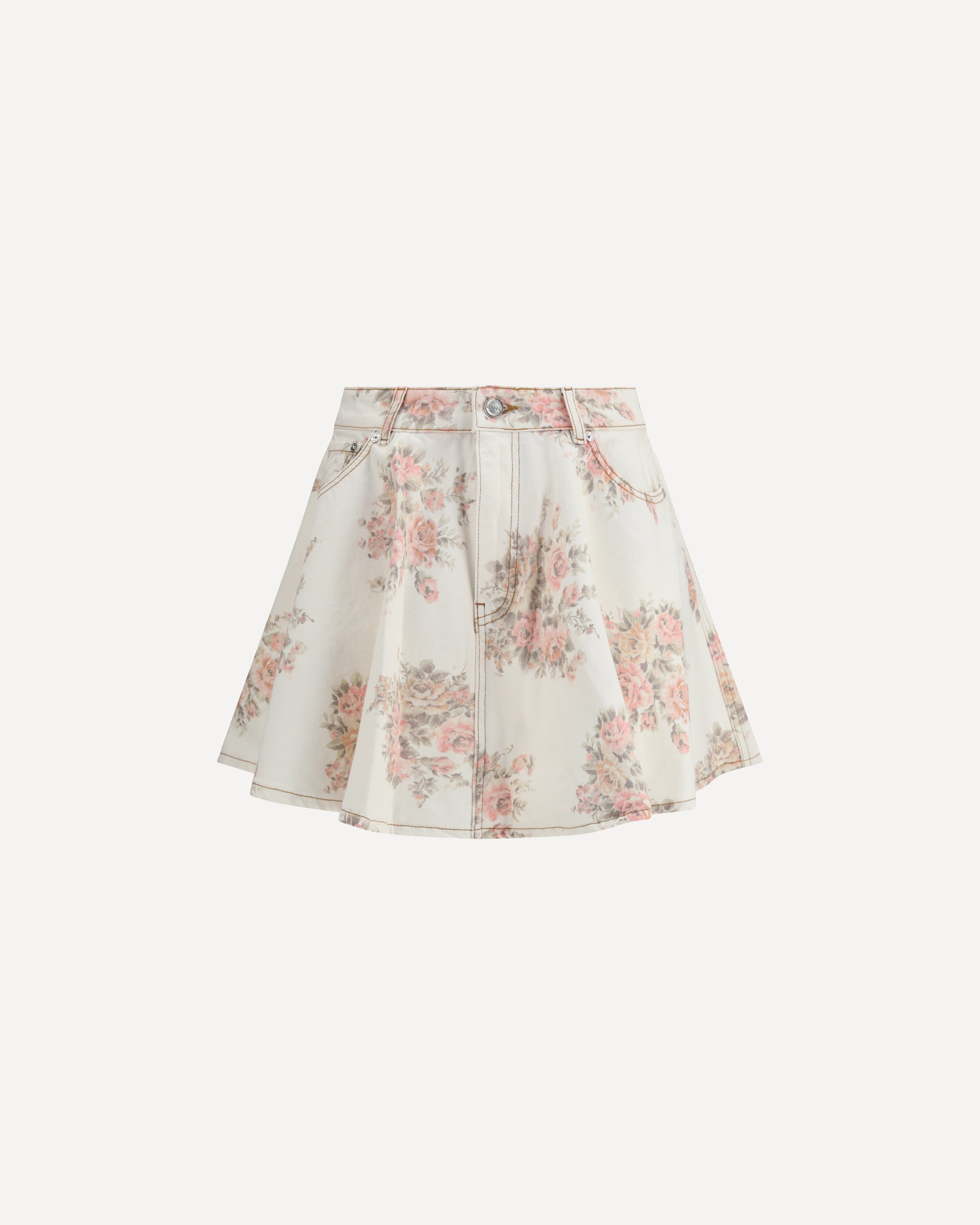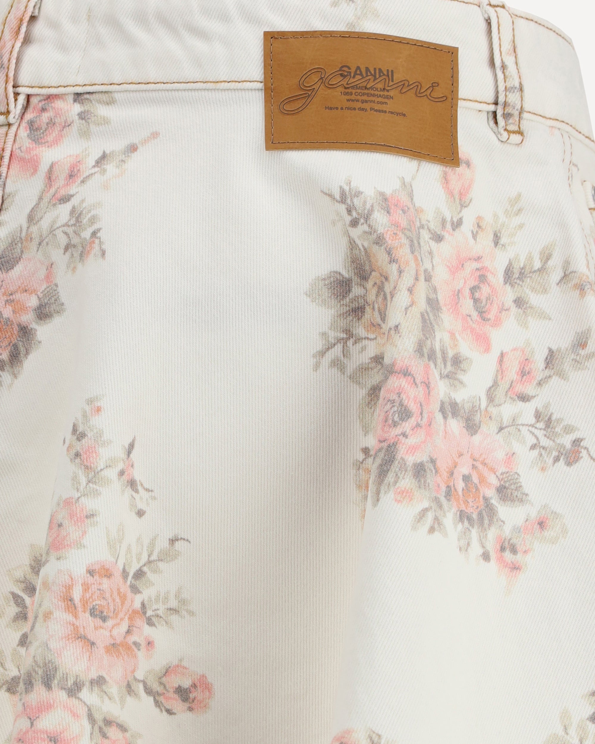 Ganni's floral print denim Miniskirt features a button and zipper closure, five pockets and belt loops at the waist, combining a classic design with a fresh, feminine pattern.