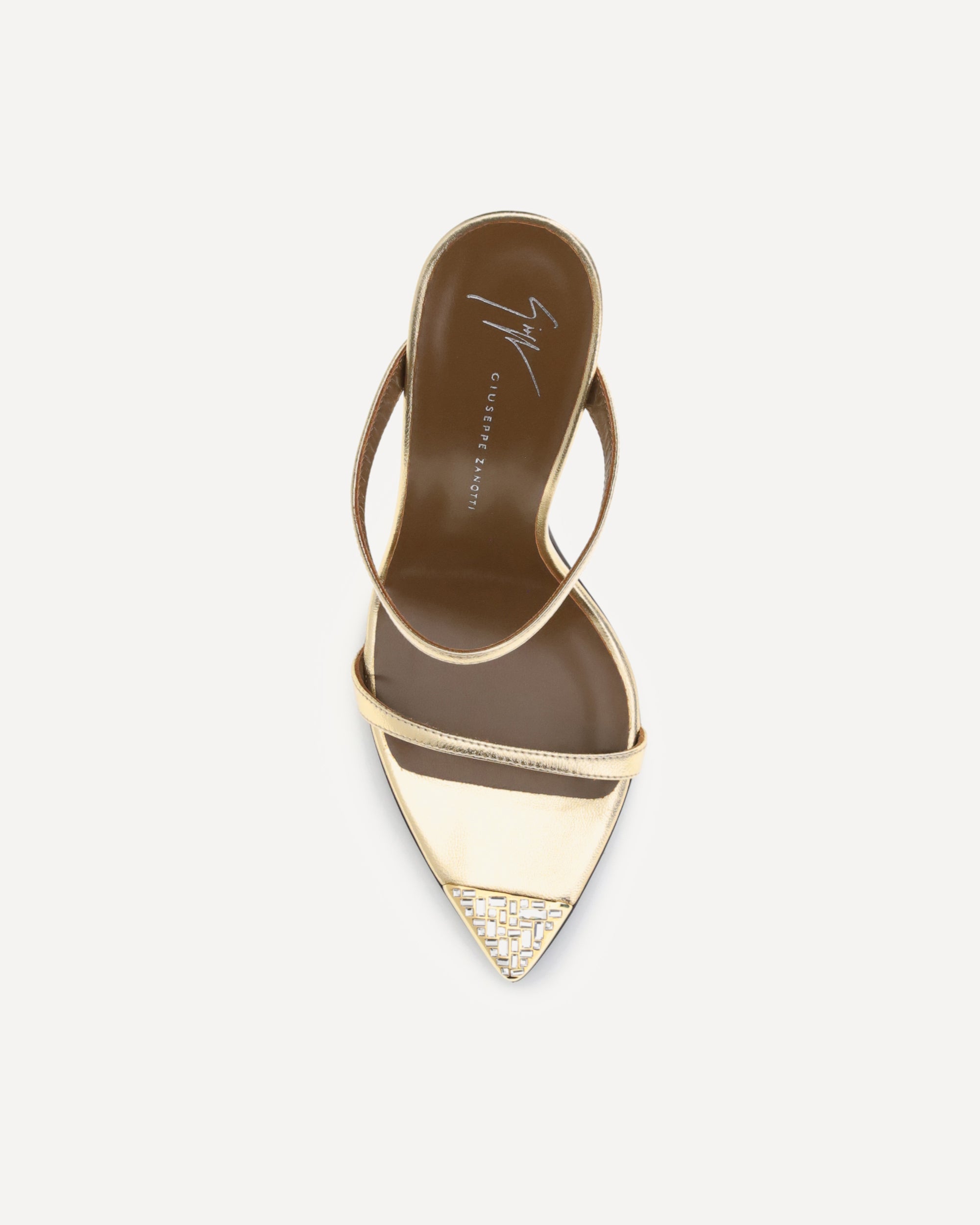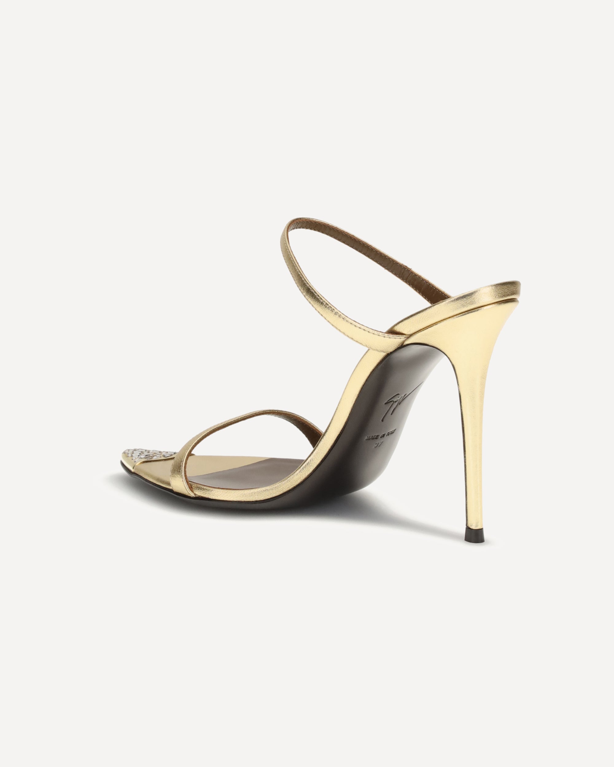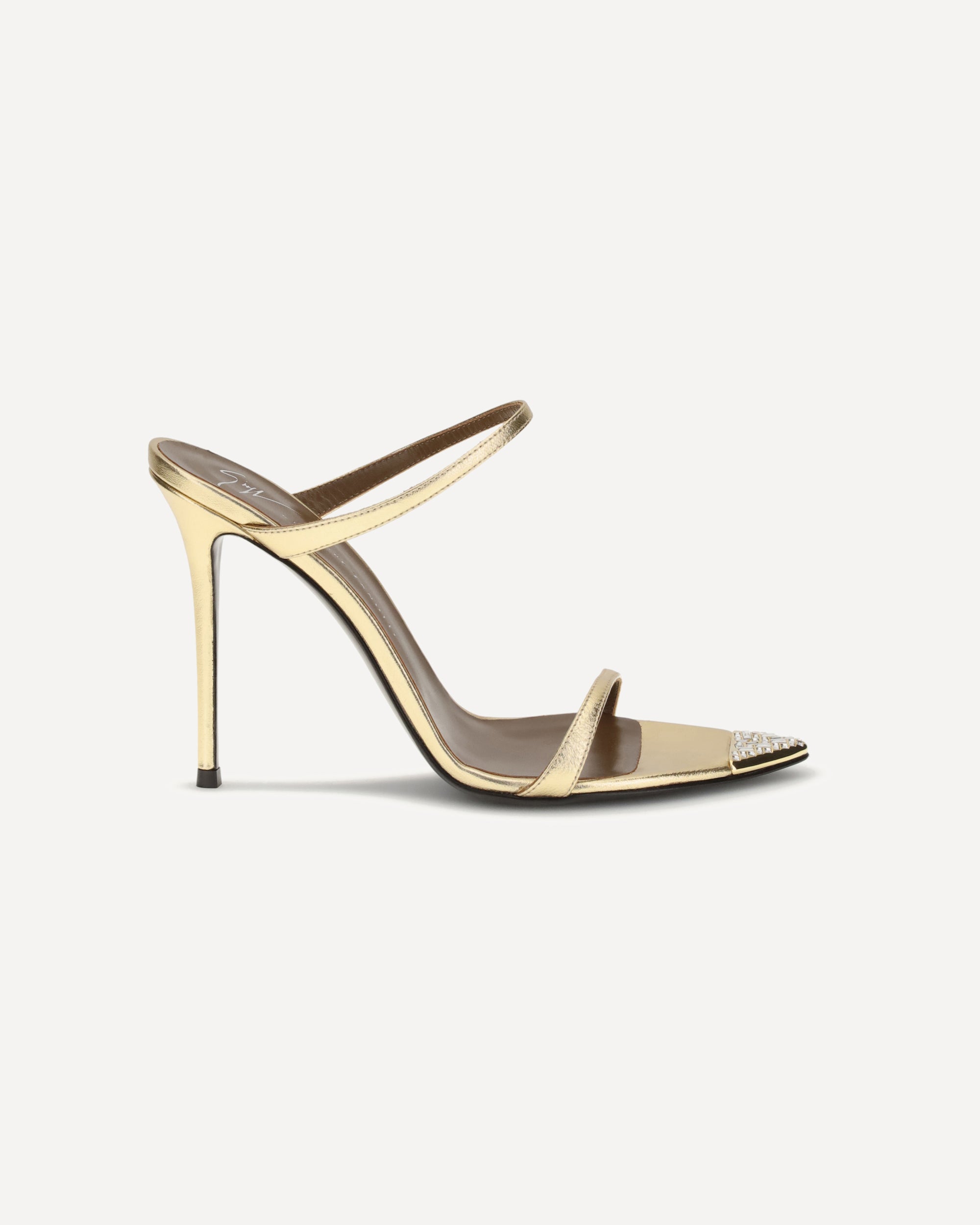Giuseppe Zanotti's Intriigo Jewelry Sandals are a blend of boldness and contemporary elegance. An open-toe mule model crafted in laminated leather, they feature a toe decorated with a metal ferrule embellished with rhinestone-encrusted carrè and baguette rhinestones, giving a luminous and sophisticated touch. The stiletto heel completes the design, giving momentum and femininity to every step.
