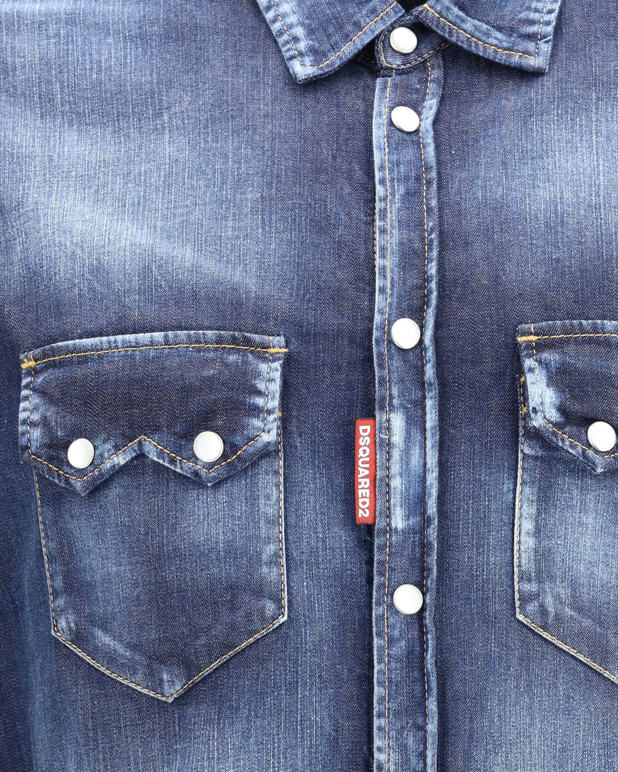Cotton Shirt with a denim-effect design by Dsquared2, with a classic collar and front closure with press studs. The model features two welt pockets with flap on the chest and adjustable cuffs with a button. A utility-inspired garment, perfect for casual looks with a bold character.