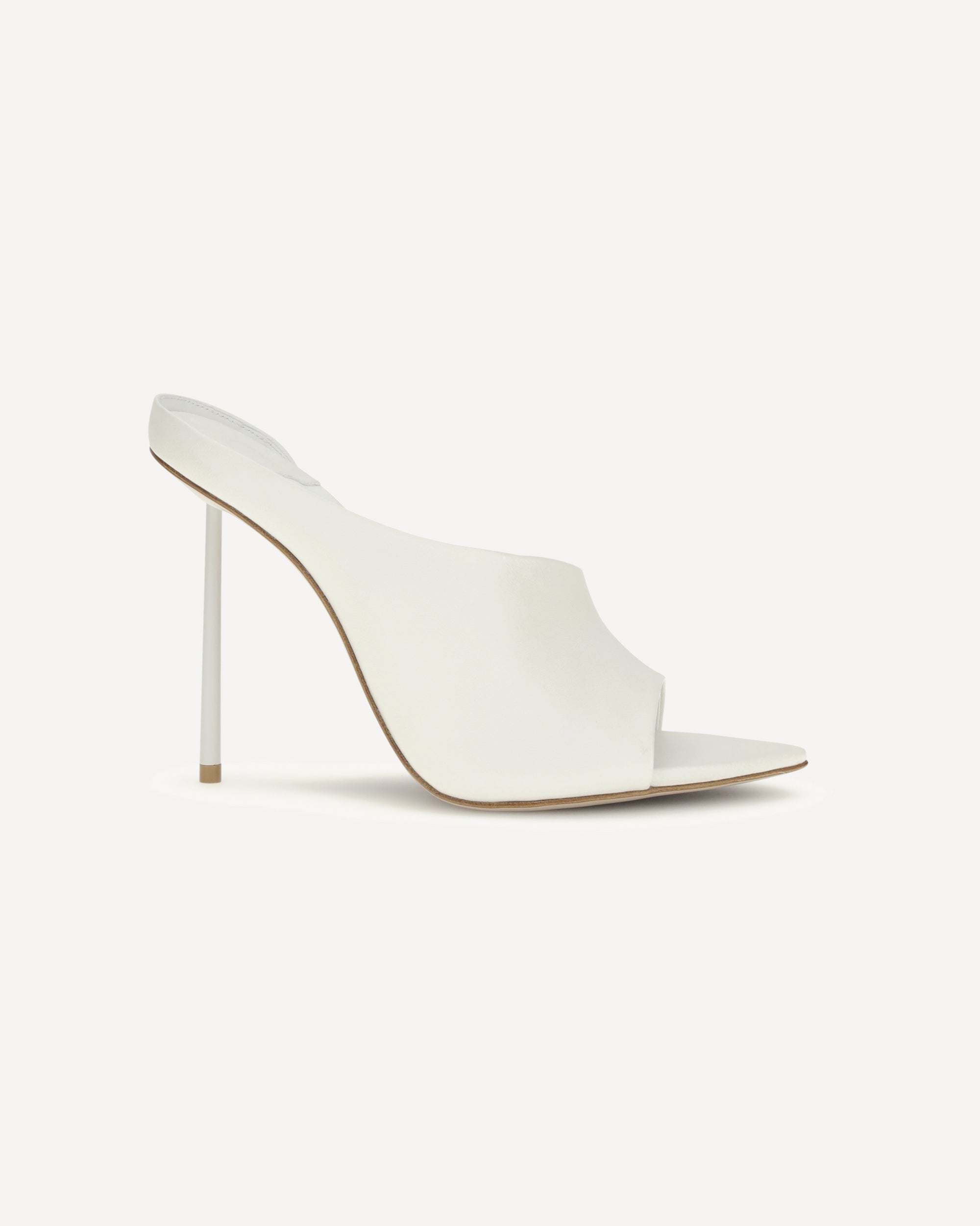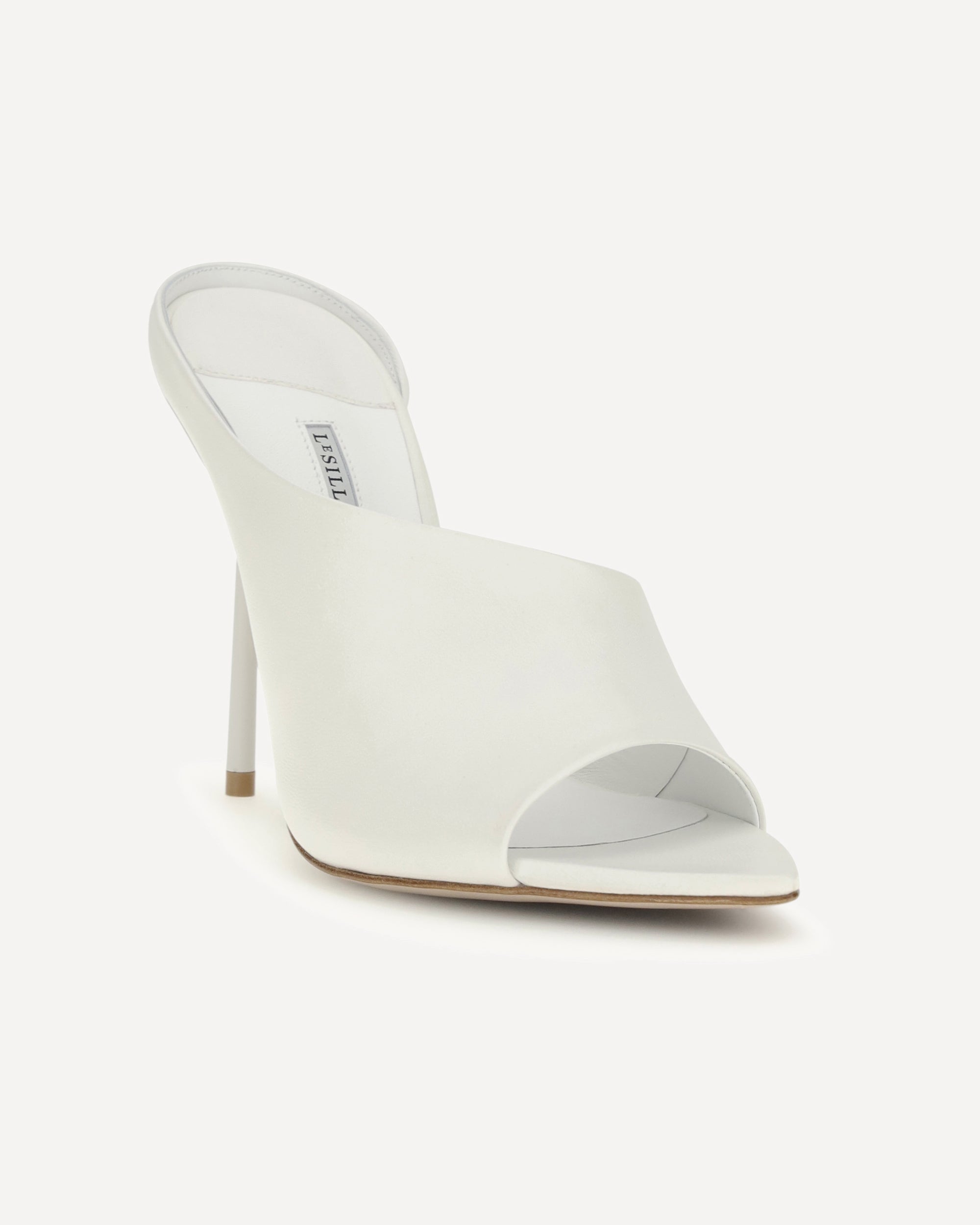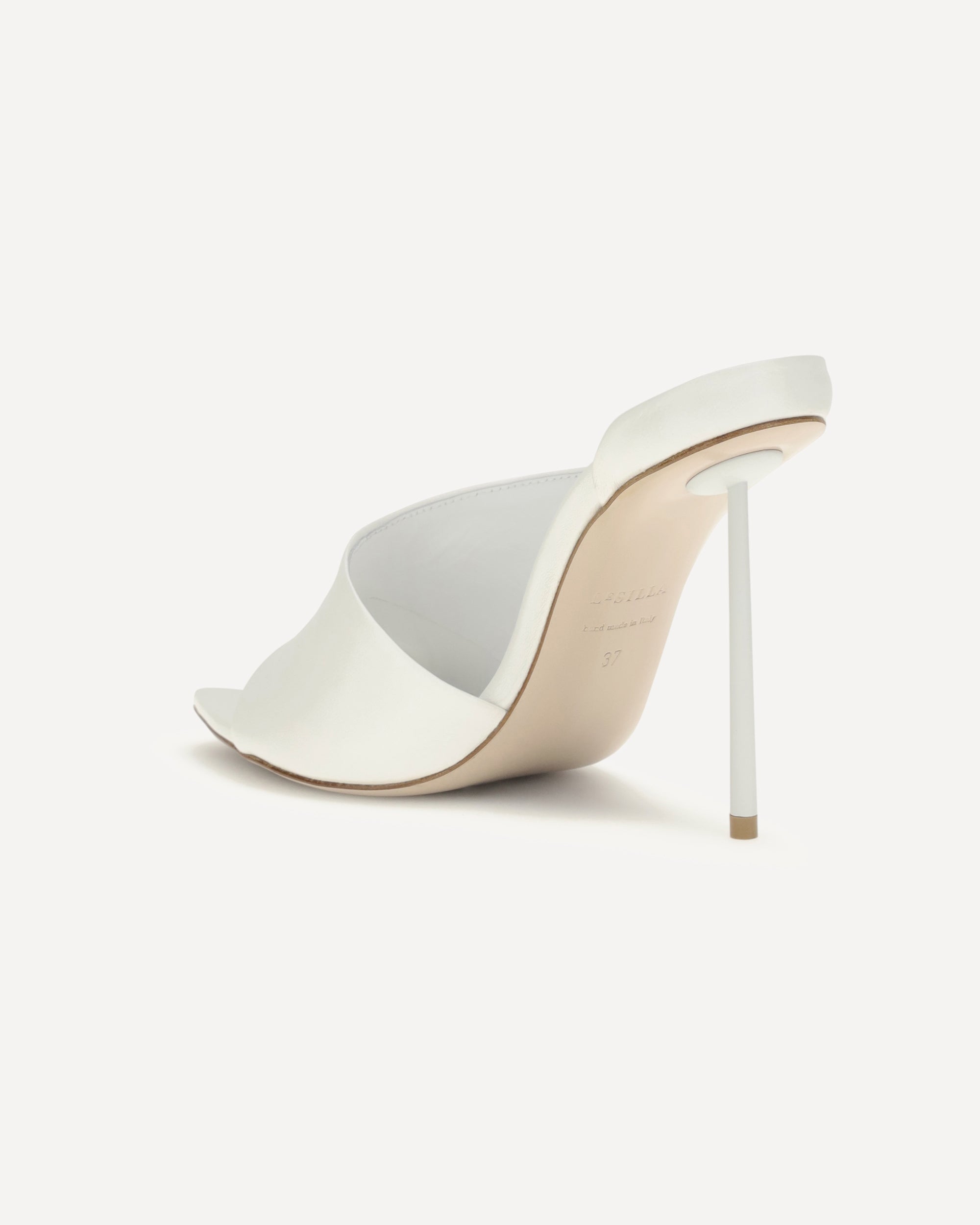 The Futura Sandals by le Silla are essential mules featuring an asymmetrical strap in semi-gloss lambskin. The stiletto heel adds height and rhythm to the silhouette, making these sandals perfect for evening looks that focus on modern elegance. The clean and bright design expresses Italian craftsmanship with a contemporary and sophisticated character.