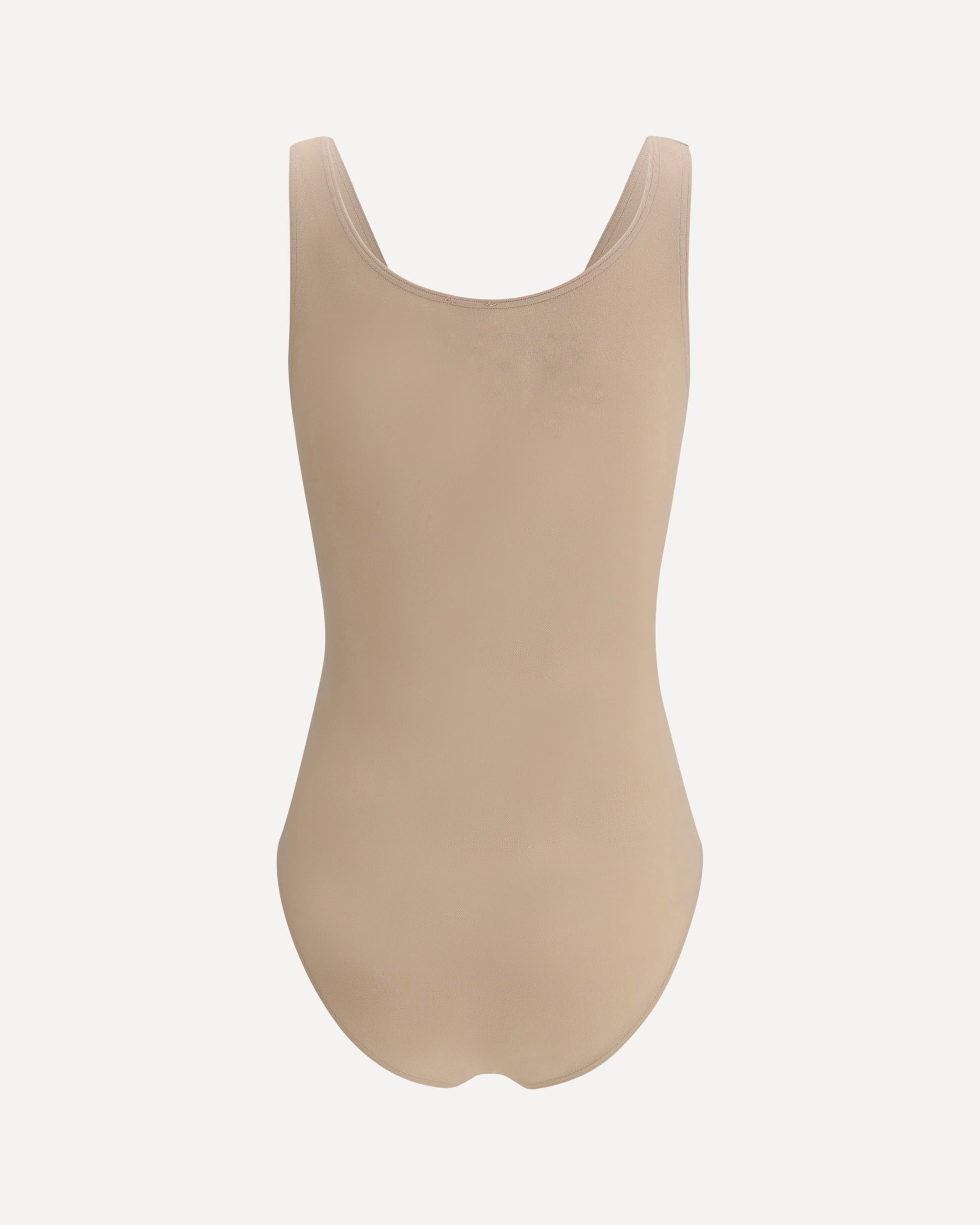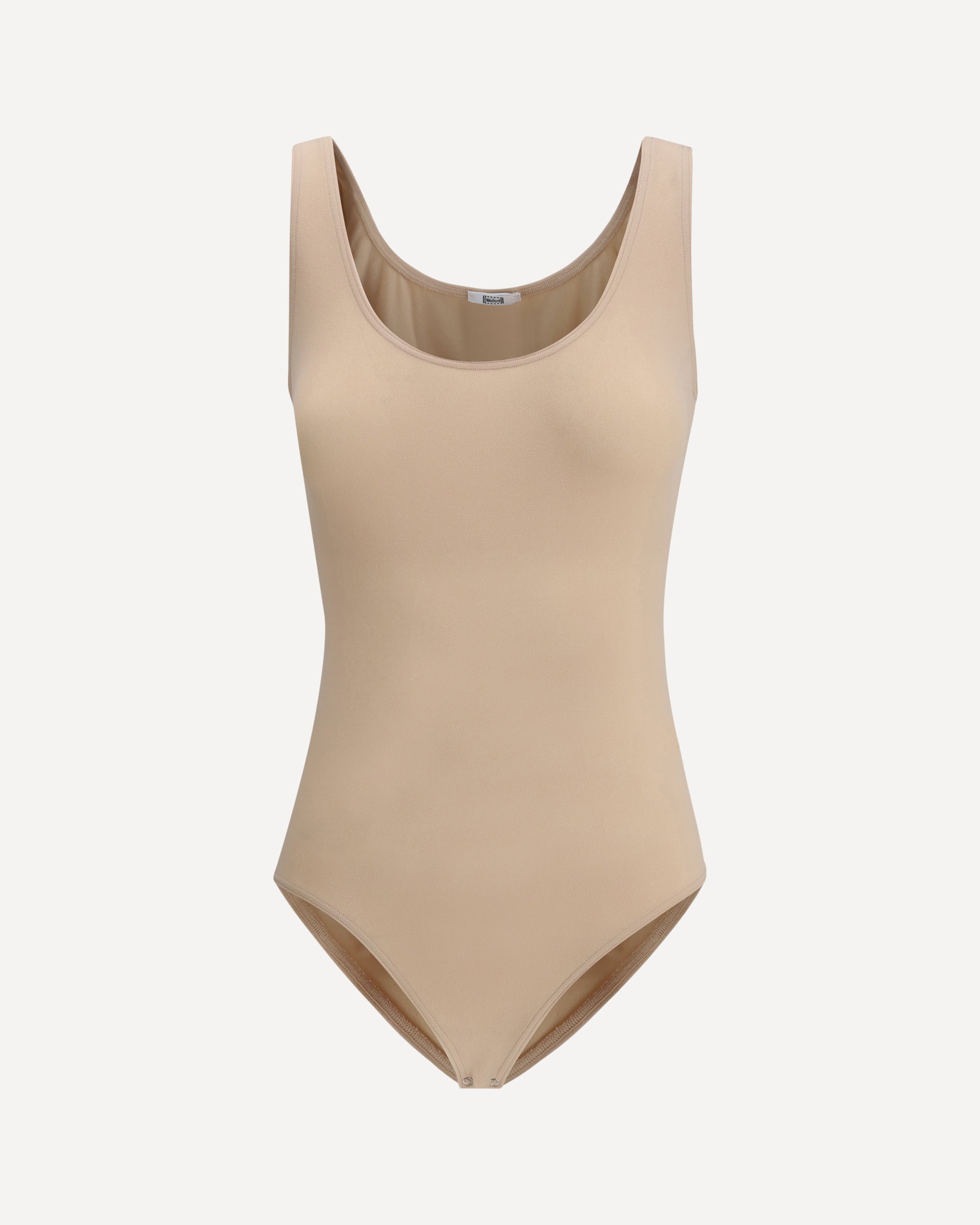 The minimal sleeveless Jamaika Bodysuit by Wolford is an iconic garment designed to sculpt and enhance the figure with elegance. Made of the exclusive Velvet circular knit fabric, which is soft, opaque and seamless, it provides a comfortable shaping effect. The BLUFIBRE® yarn used, recycled from discarded tires, reflects the brand's commitment to sustainability. A deep round neckline and practical snap closure at the bottom complete the design. A refined and functional essential.