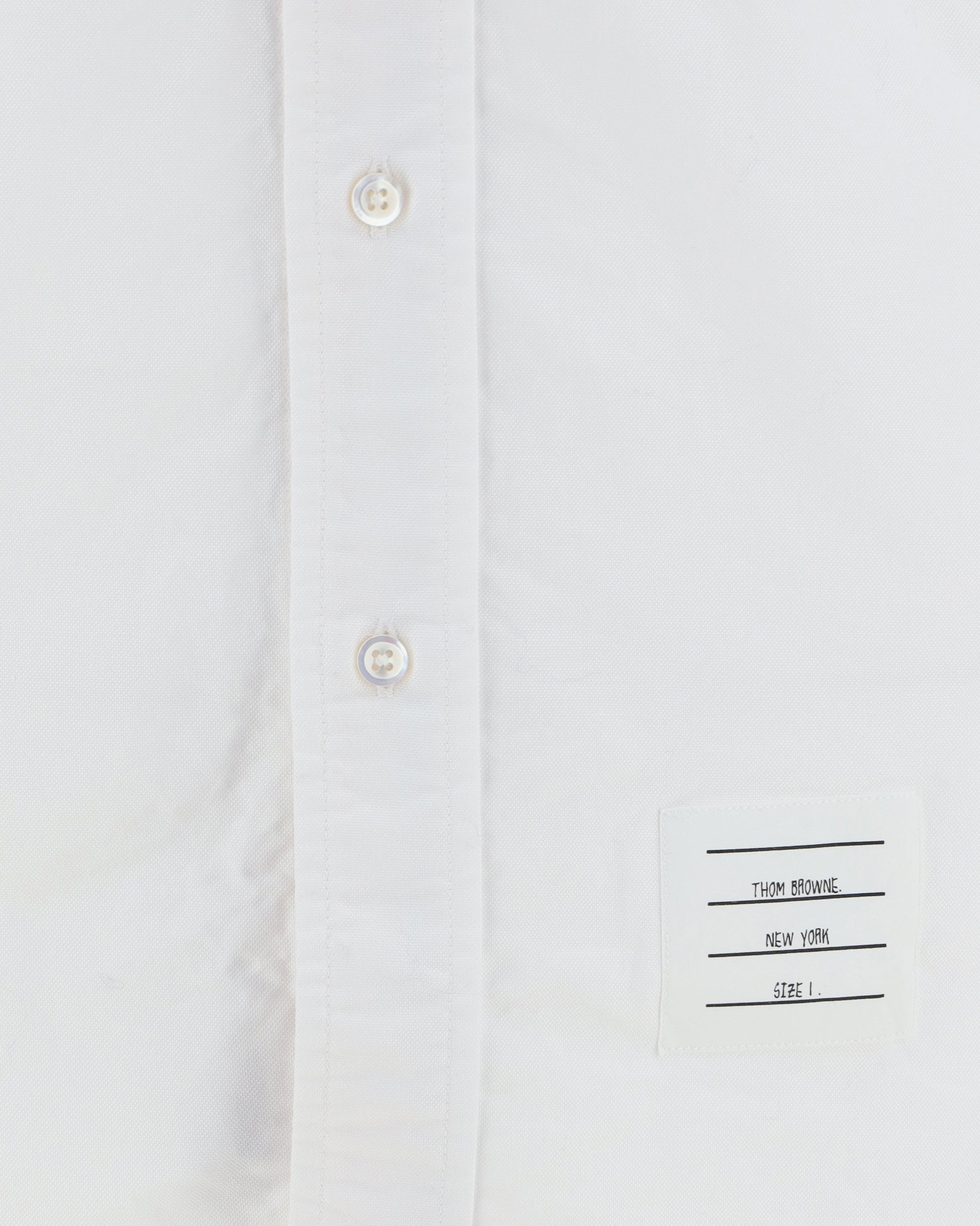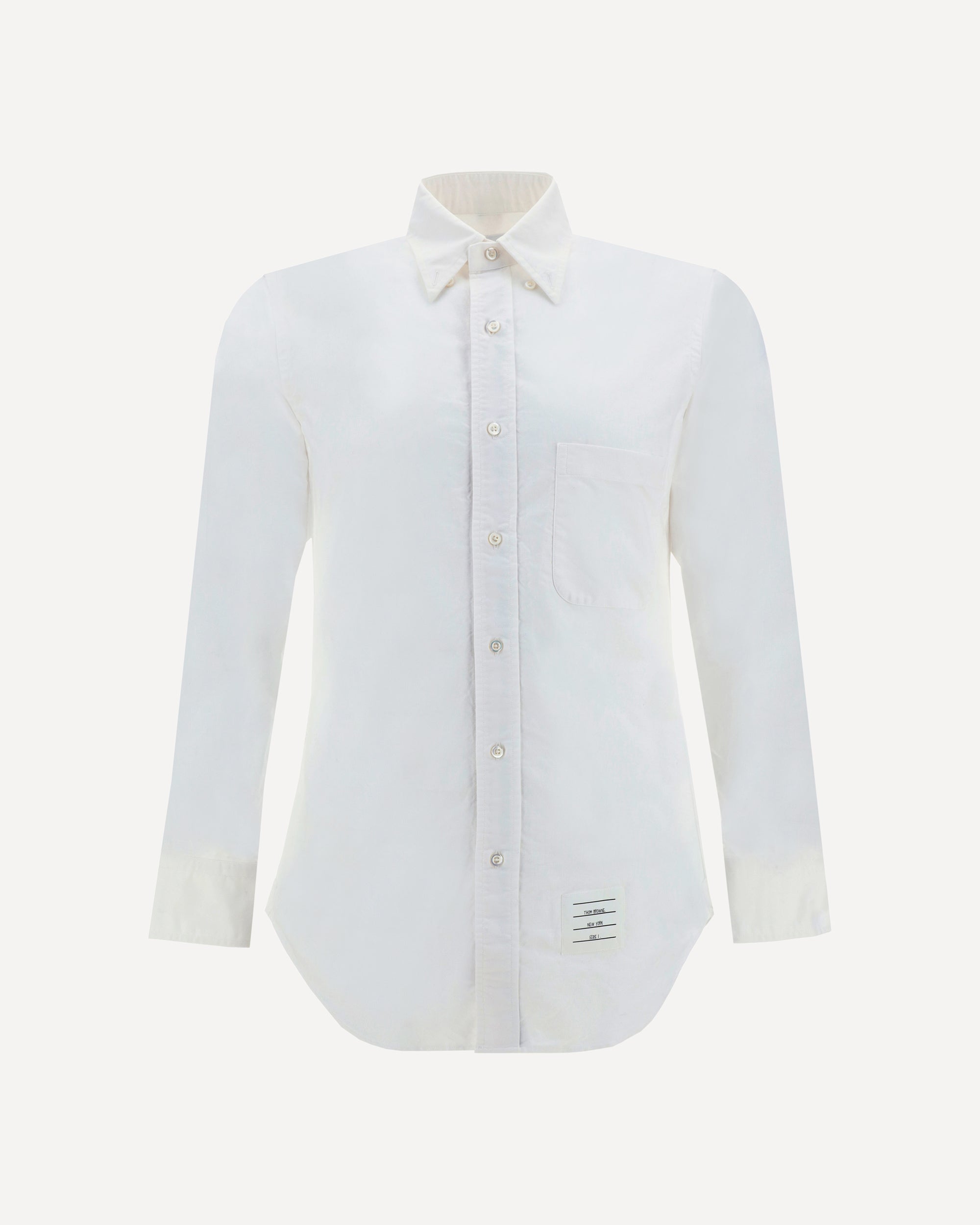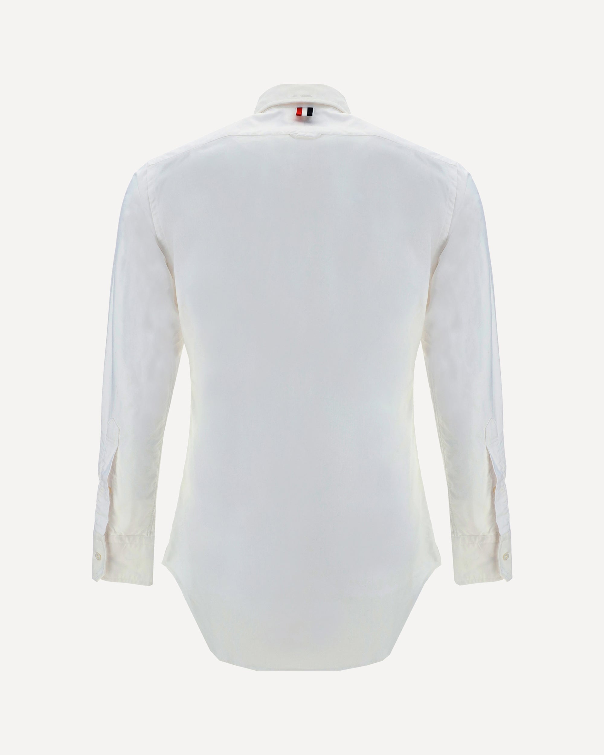 Cotton Shirt by Thom Browne, classic collar, long sleeves with button cuffs, front button closure, patch pocket on front, iconic brand logo patch on front, monochrome pattern, regular fit.