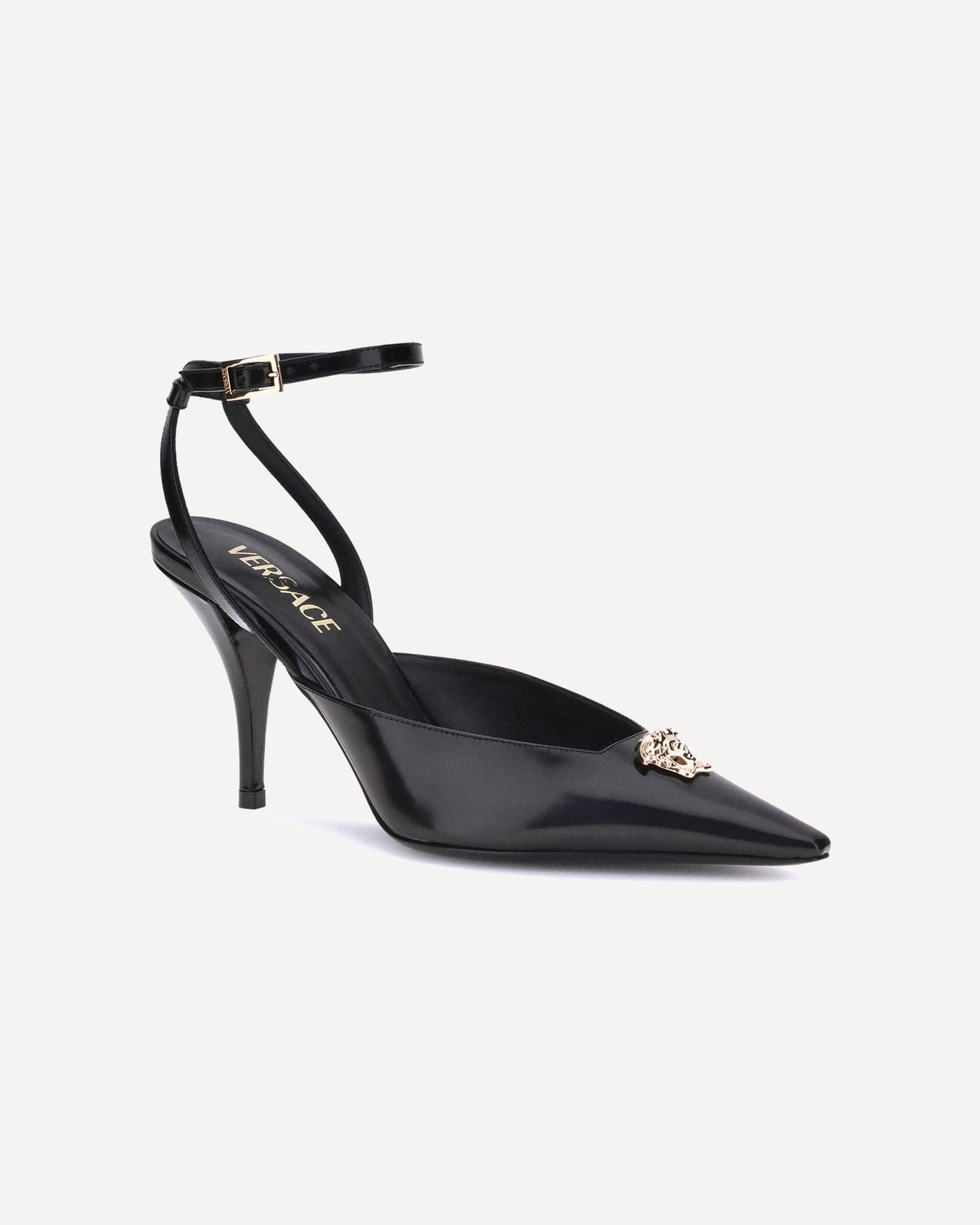 Versace's Medusa Décolleté is an elegant and bold slingback made of patent calfskin with a tapered toe. The sleek stiletto heel enhances femininity, while the iconic La Medusa accessory on the upper adds a distinctive and recognizable touch, symbolizing the brand's unmistakable signature.