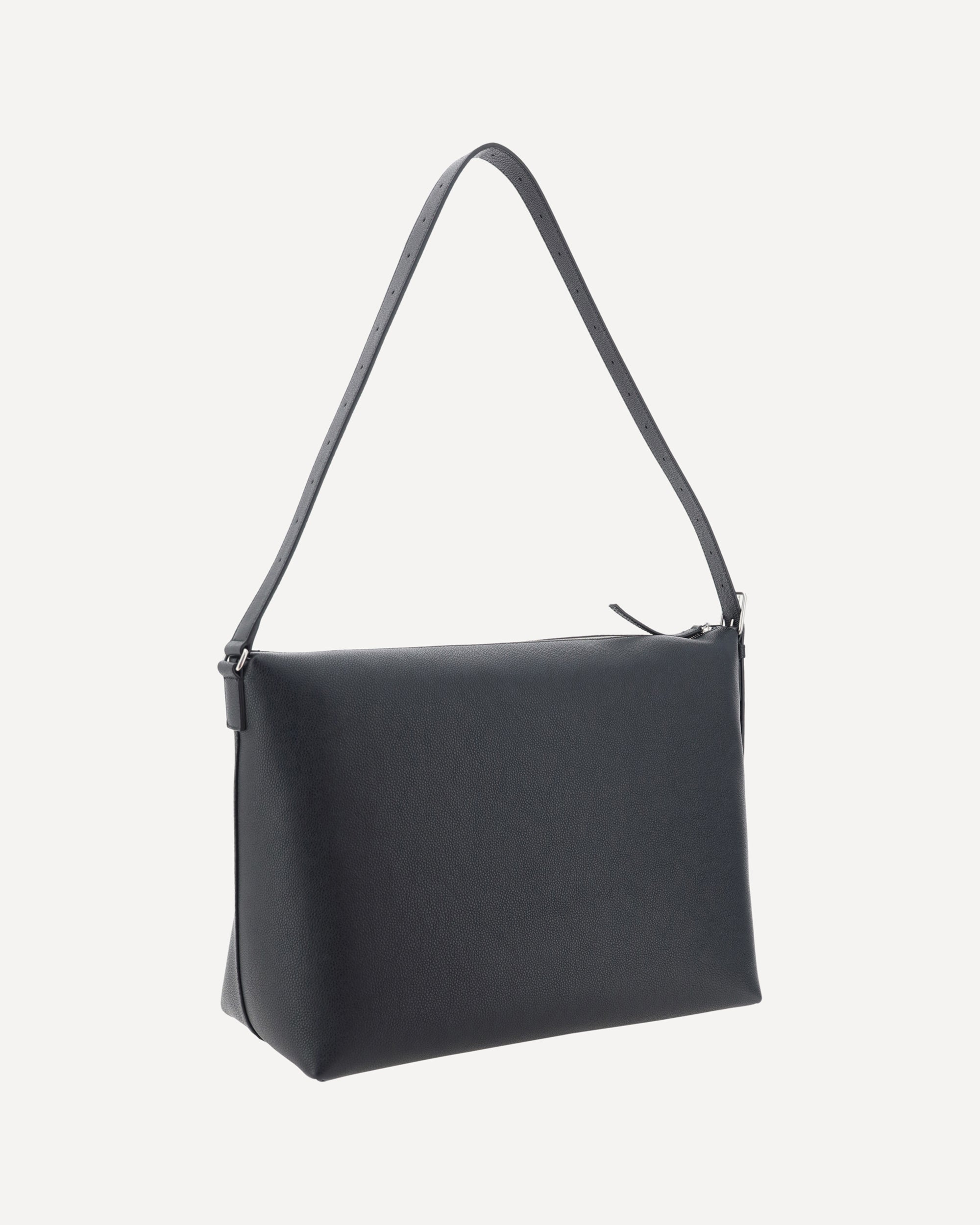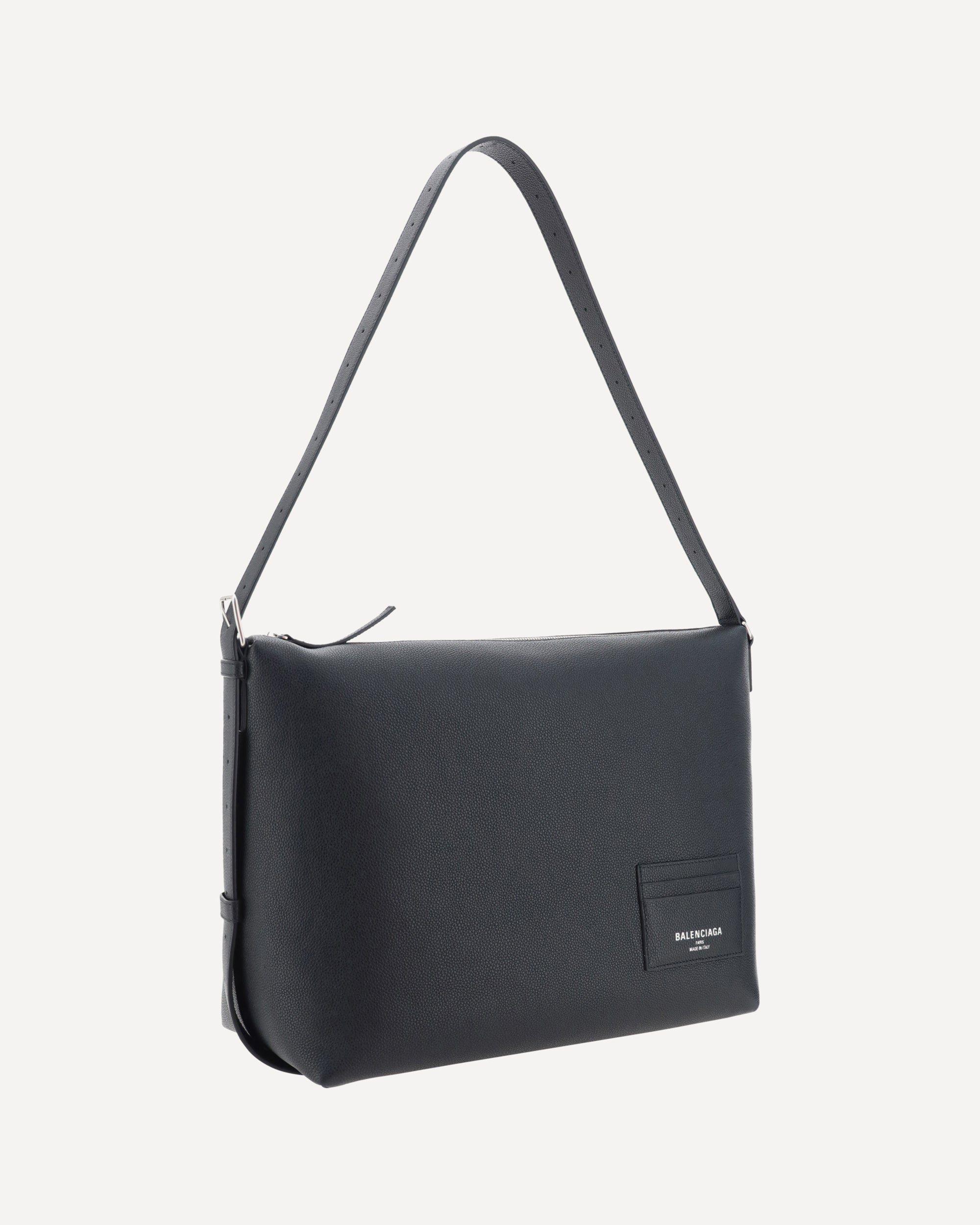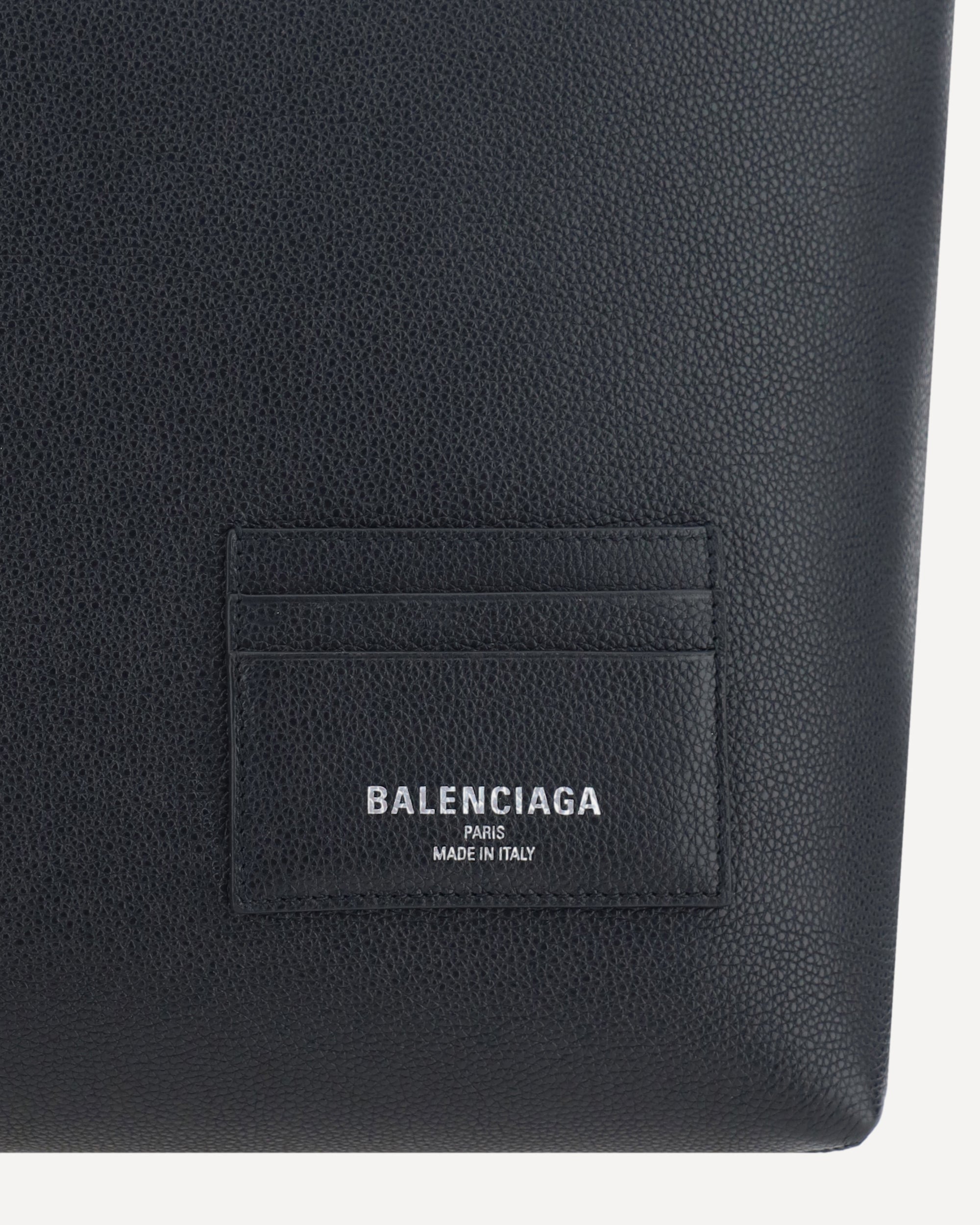 Leather Shoulder Bag by Balenciaga, grained leather design, adjustable flat shoulder strap, top zipper closure, three applied card slots on front with contrasting iconic brand monogram detail on front, single interior compartment.