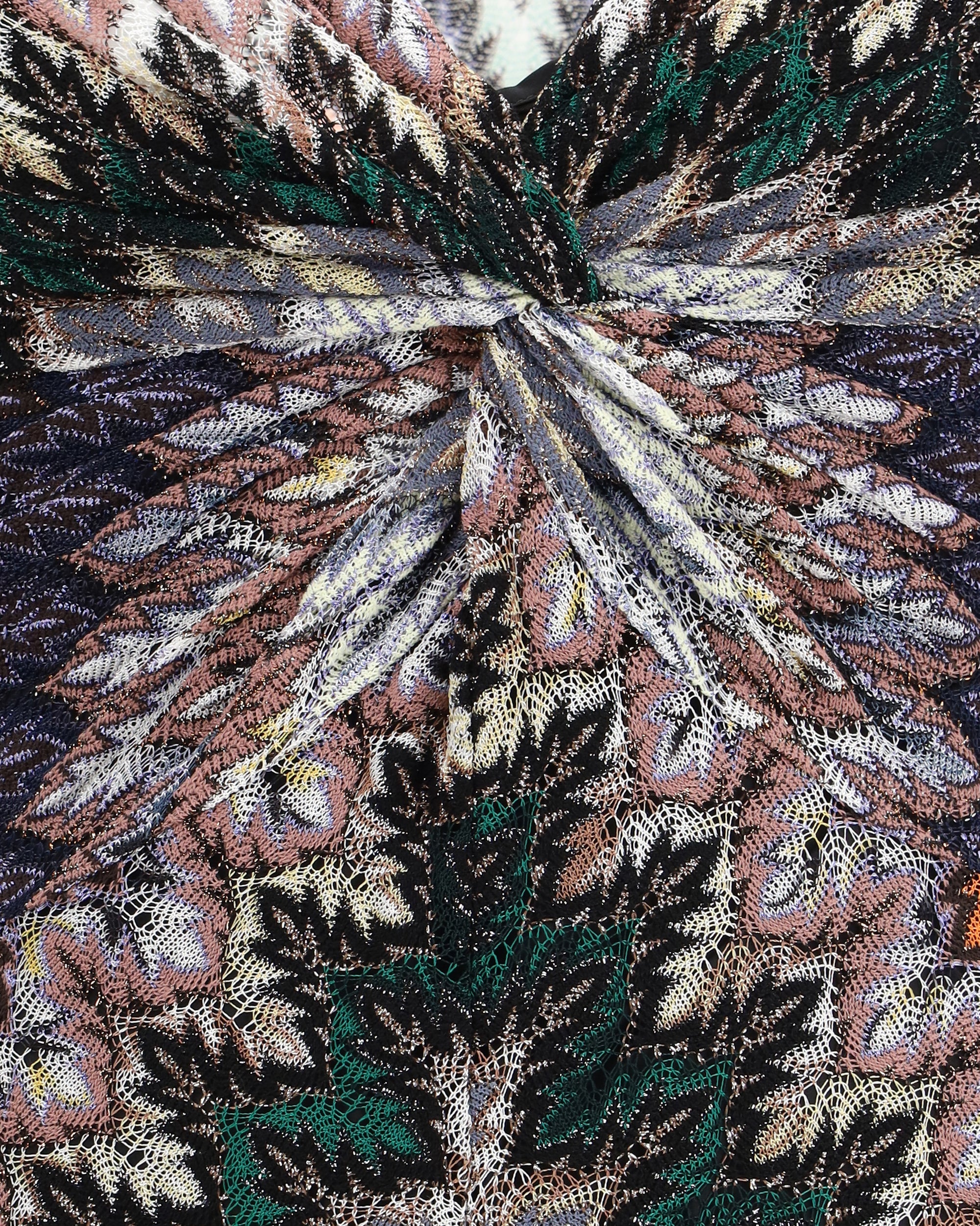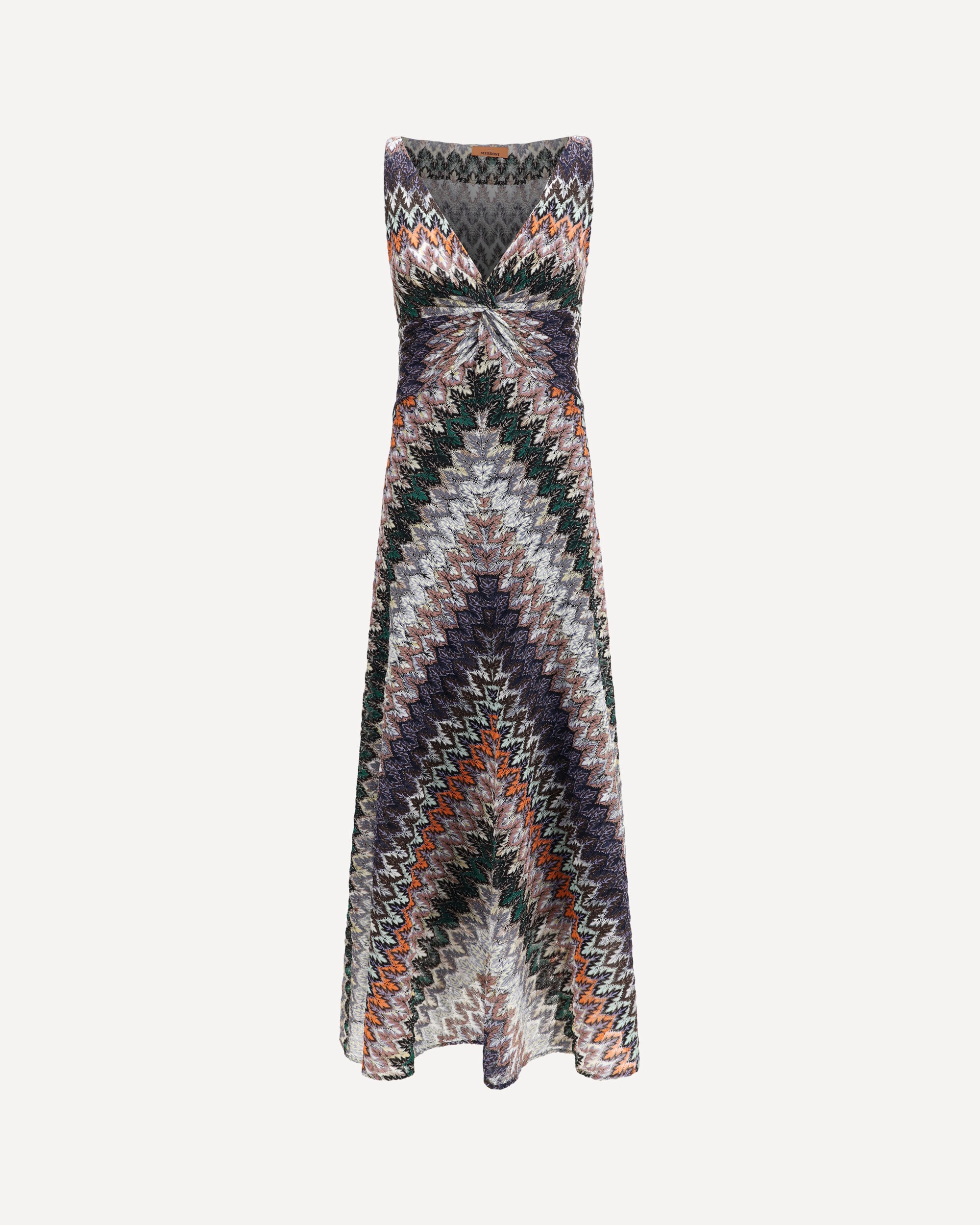 The sleeveless lond Dress by Missoni features iconic chevron knit, a signature element of the brand’s aesthetic. Designed with a deep V-neckline that elongates the silhouette, it is tailored in a slim fit to enhance the figure with refined femininity. The zigzag pattern adds movement and texture, making it ideal for a sophisticated yet contemporary look.