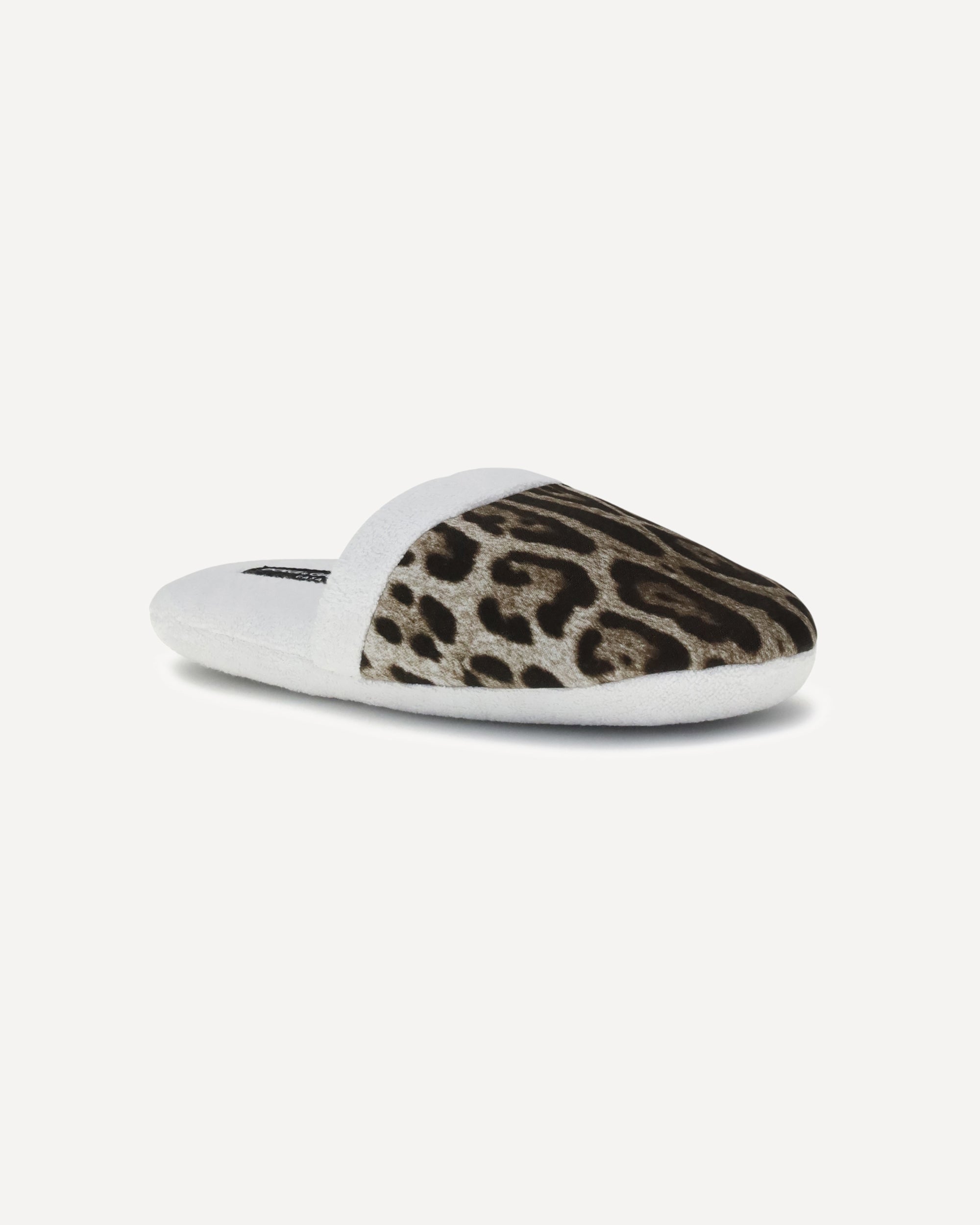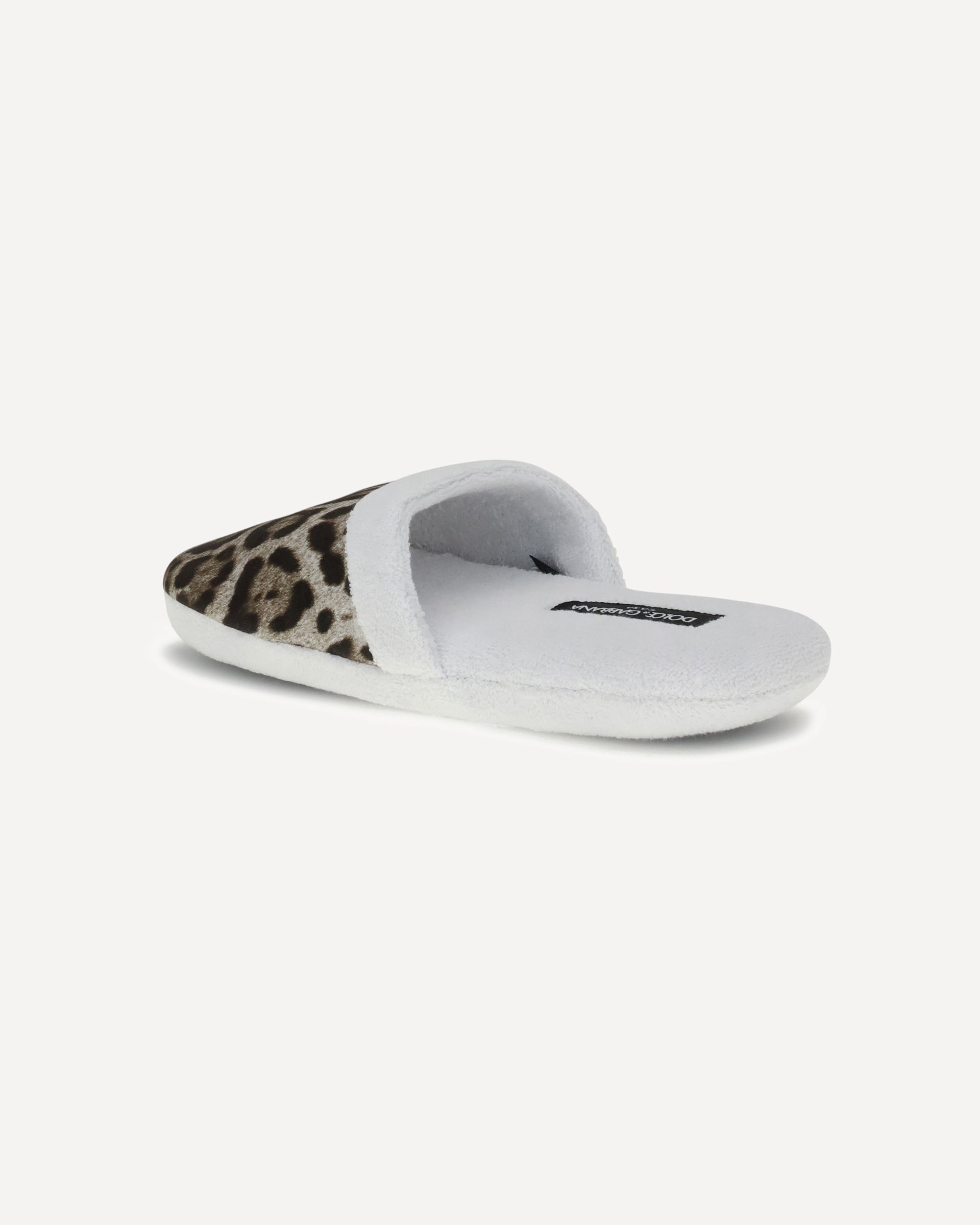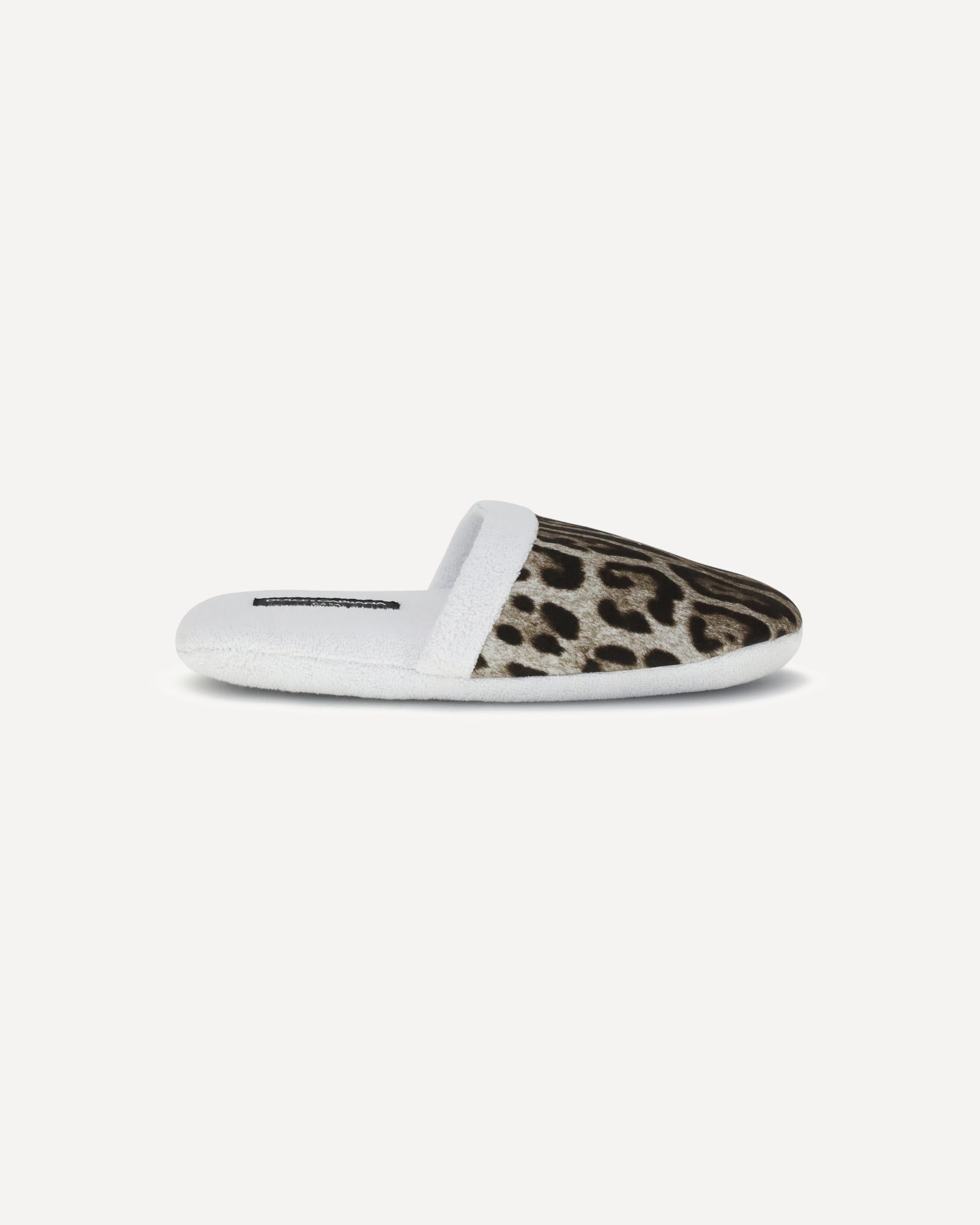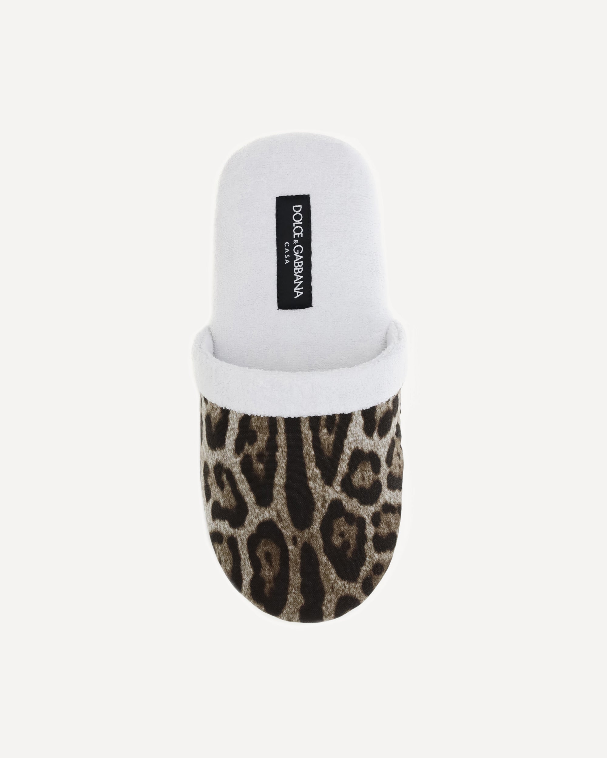 Leopard-print cotton by Dolce&Gabbana terry slippers bring the house's iconic style to the bathroom. The solid-color insole is paired with a linen and cotton upper decorated with the collection's leopard pattern. A comfortable and sophisticated accessory, perfect for experiencing relaxation with a touch of luxury.