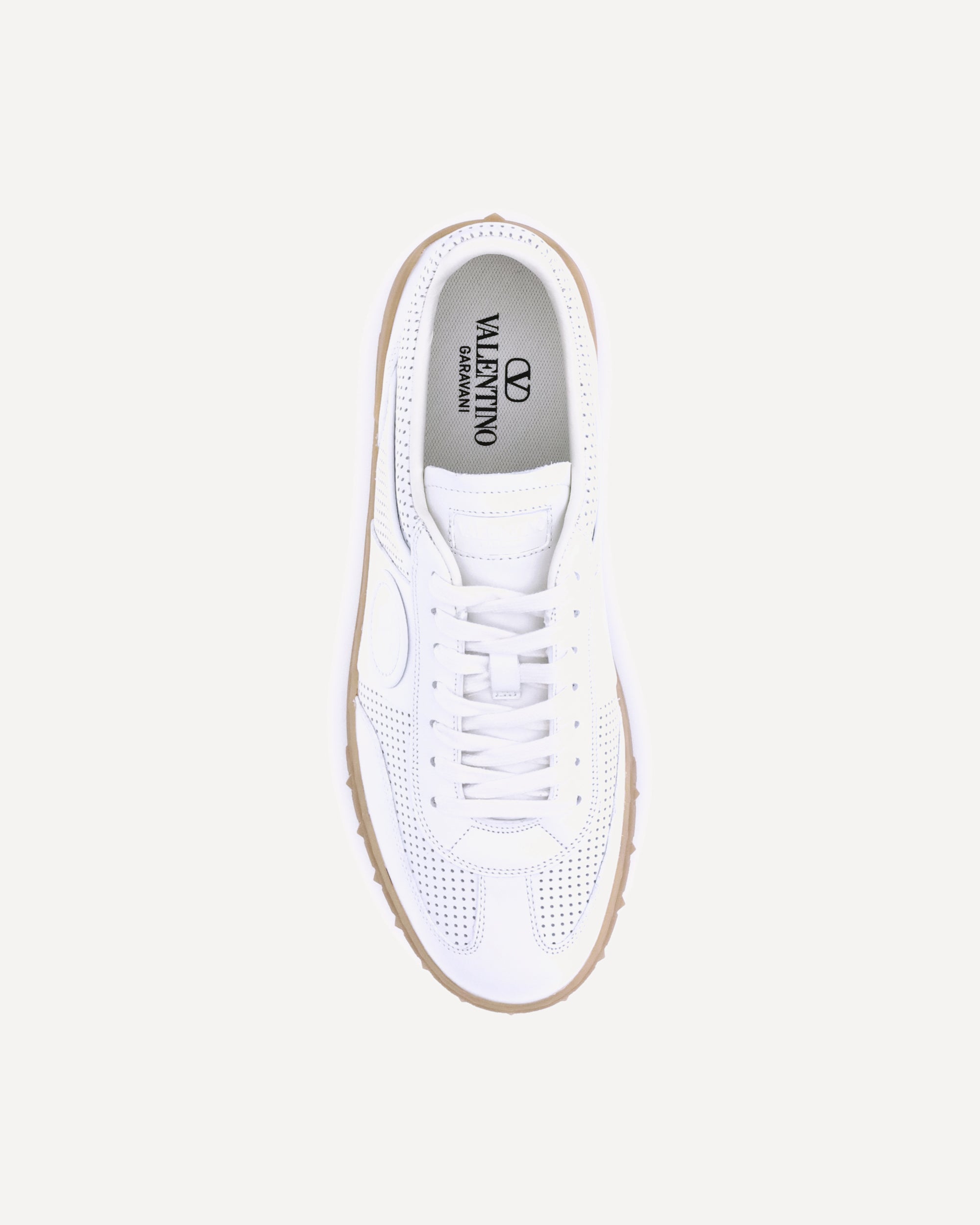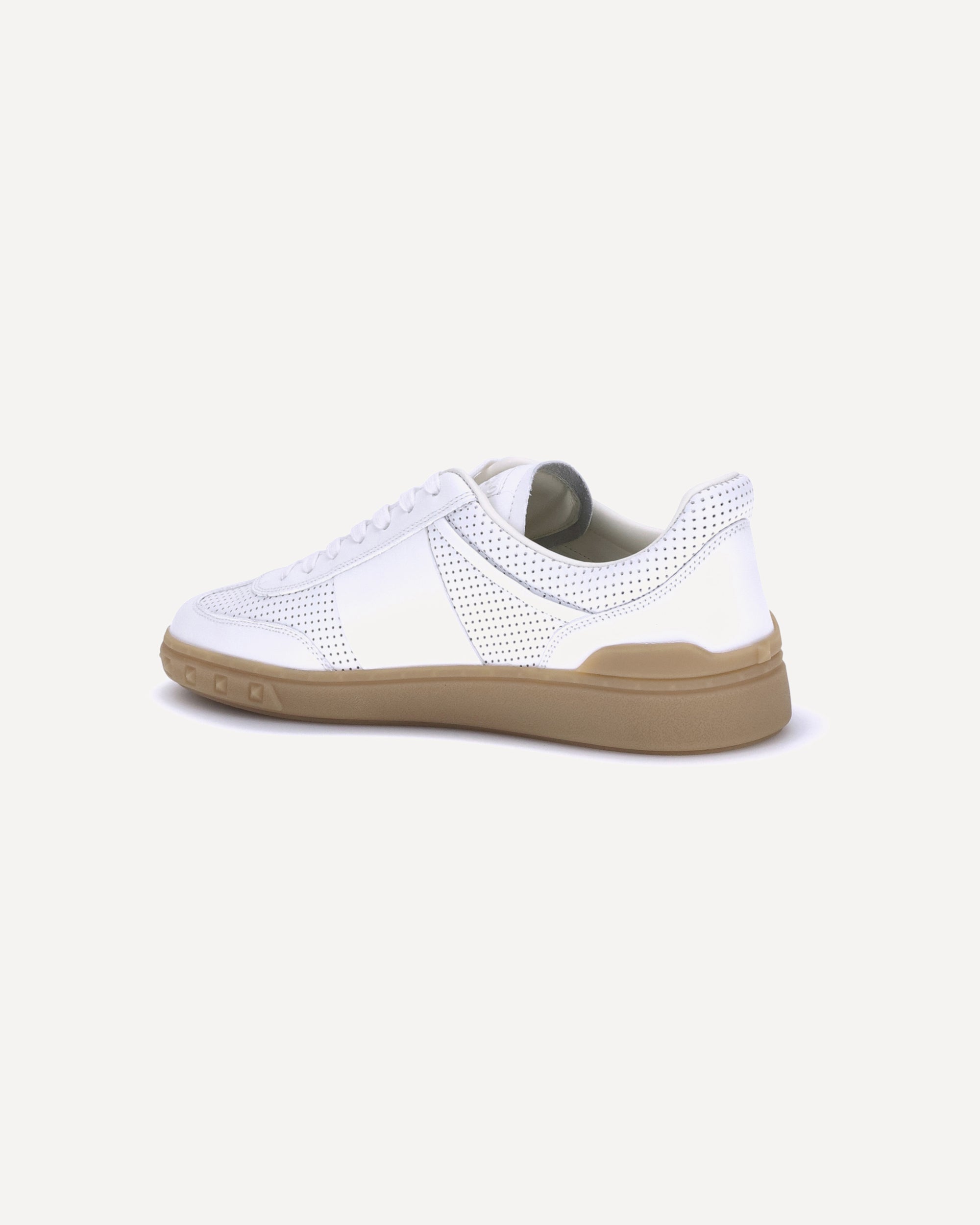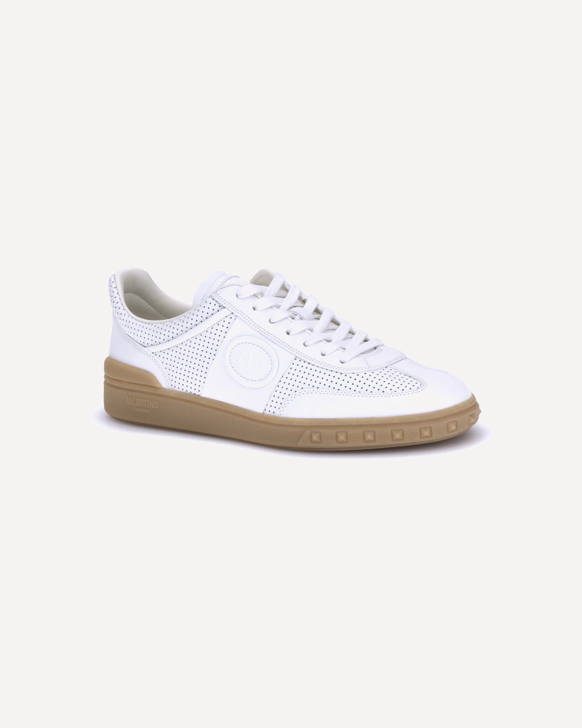 Valentino Garavani's Upvillage leather Sneakers combine elegance and street style spirit in a contemporary design. The all-over perforated upper is paired with a tasseled calfskin band that harmoniously complements the leather patch, embellished with the iconic Signature VLogo detail. The screen-printed Valentino Garavani logo on the tongue underscores the brand's distinctive identity. The rubber sole, enriched with studded details, adds a bold and gritty touch. A perfect shoe for those looking for style, personality and comfort in a single model.