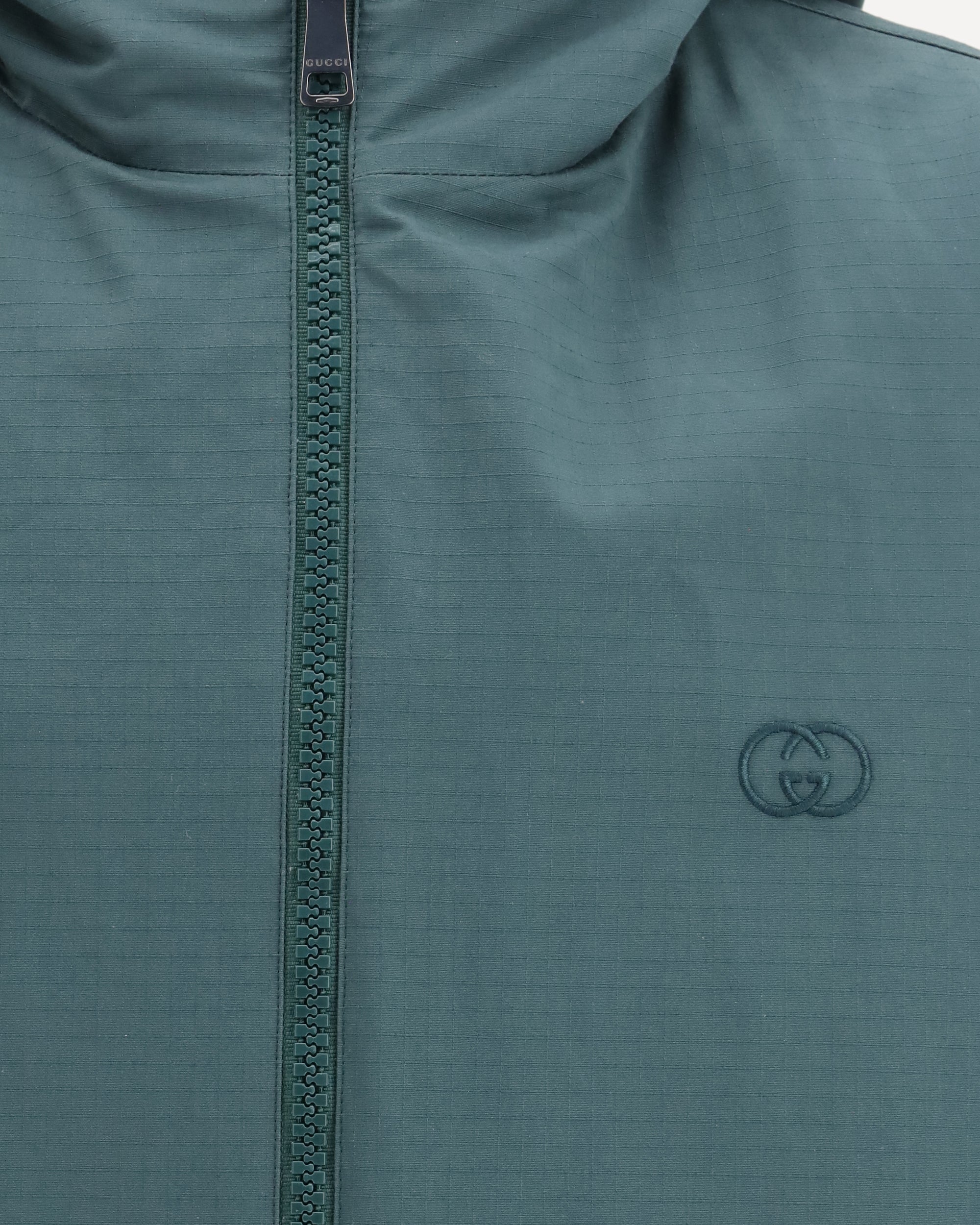 The reversible cotton ripstop Jacket by Gucci blends practicality with unmistakable house codes. One side features a clean dark green ripstop cotton, while the reverse showcases the same fabric enriched with the iconic GG motif, adding visual depth and signature appeal. Designed for versatility, it features a high collar, a concealed hood, long sleeves, and a zip fastening, finished with elasticated cuffs and side pockets. A modern, adaptable outerwear piece that shifts effortlessly between understated and statement looks.