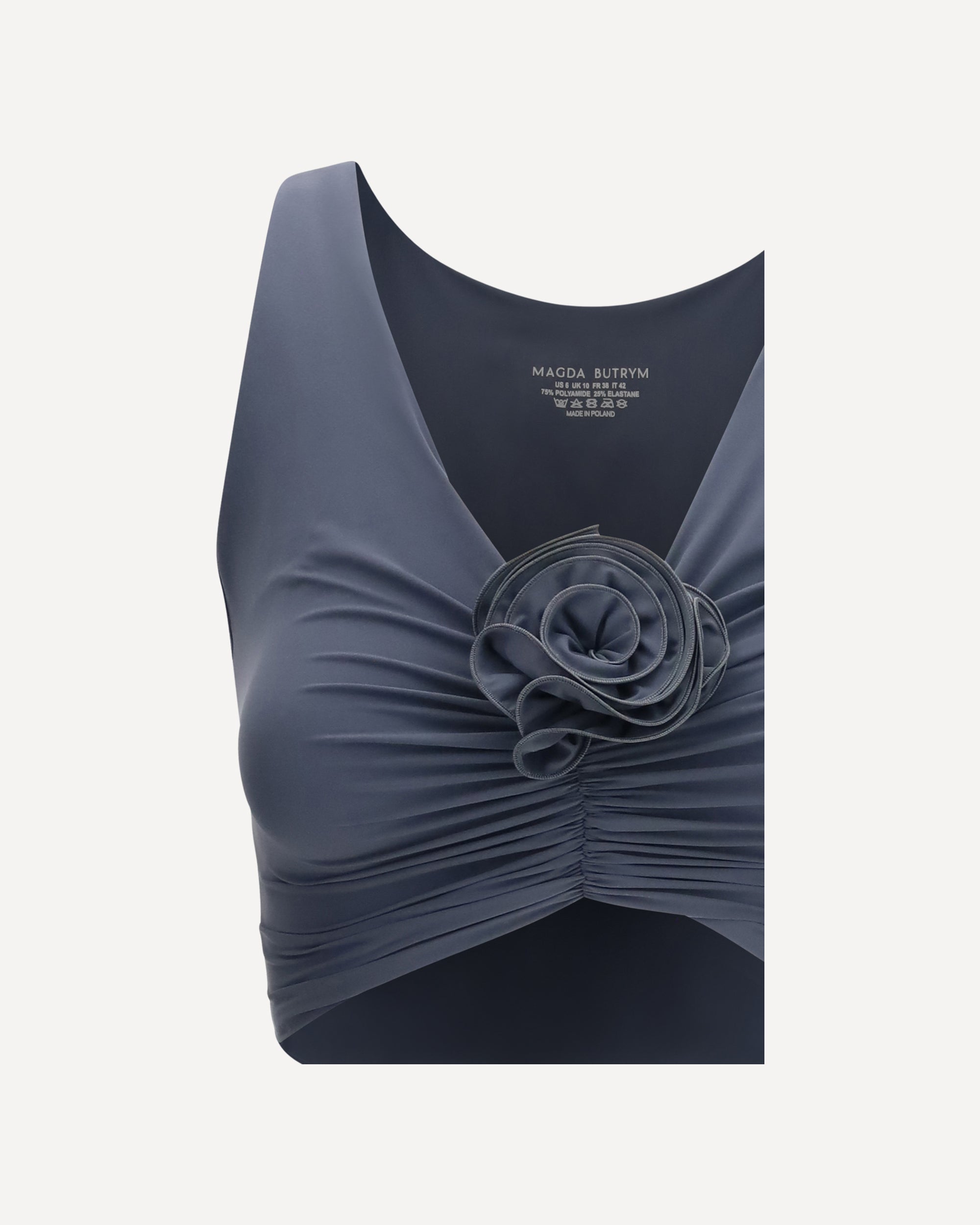 The Ruched Flower Top by Magda Butrym is a stylish and feminine swim top featuring a plunging neckline that enhances the décolletage. The front is defined by ruched detailing, highlighted by a signature floral accent at the center an iconic element of the brand’s aesthetic. The back is clean and provides full coverage, ensuring a perfect balance between sensuality and refinement.