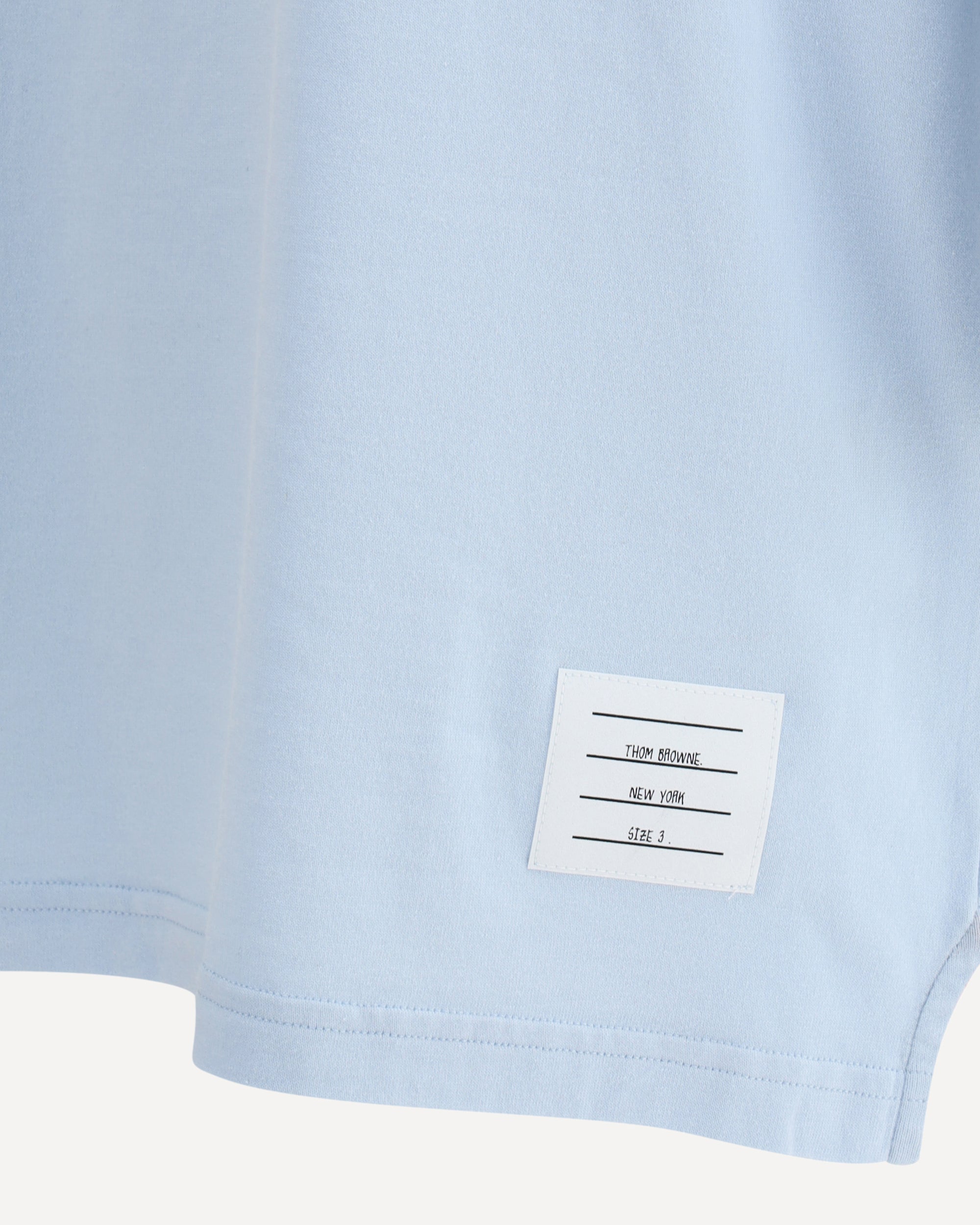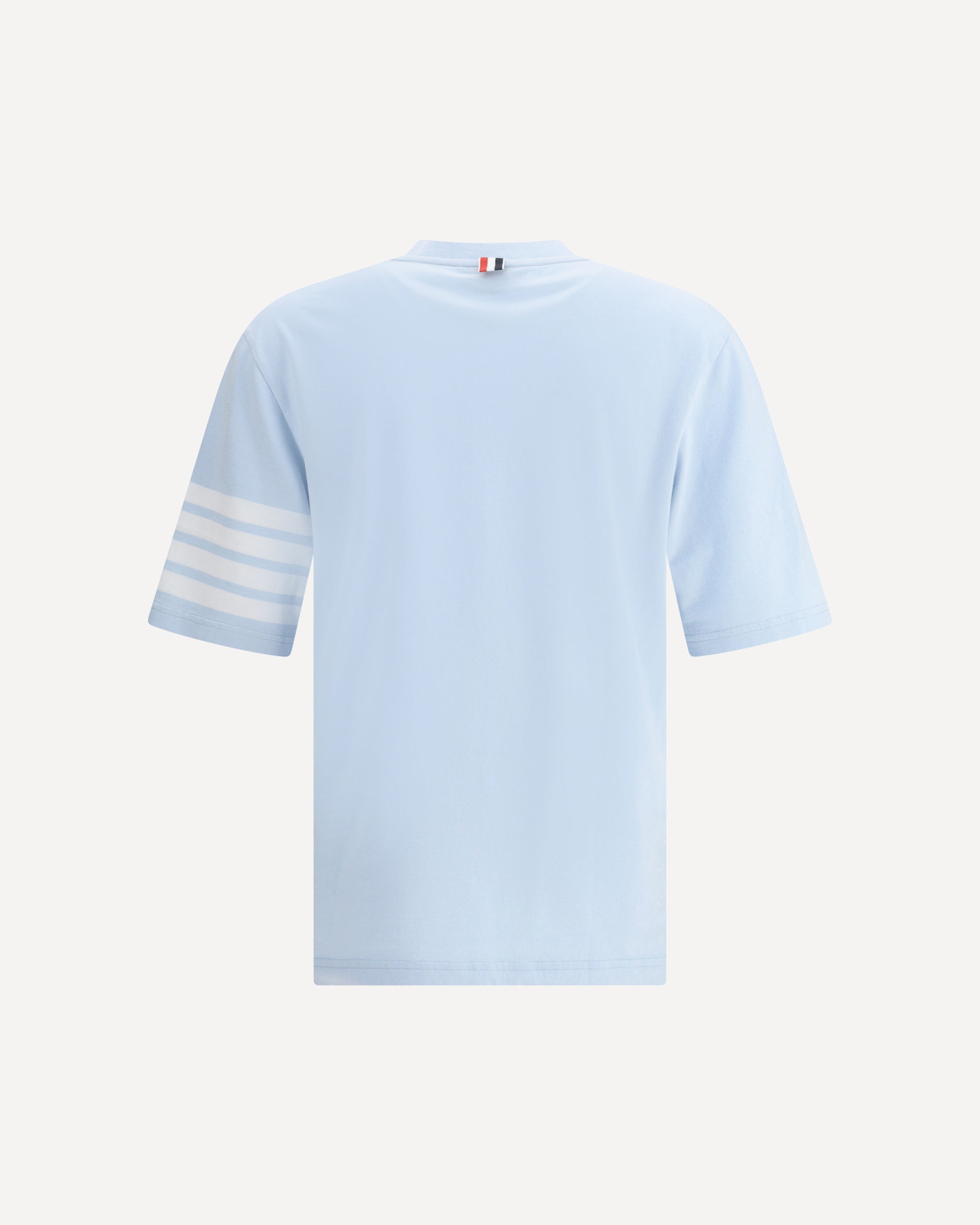The Striped T-Shirt by Thom Browne features a classic and elegant design with a distinctive striped detail. Complemented by a logo plaque, a ribbed crew neck and a straight hem, this T-shirt combines simplicity and sophistication, making it a versatile garment for any occasion.