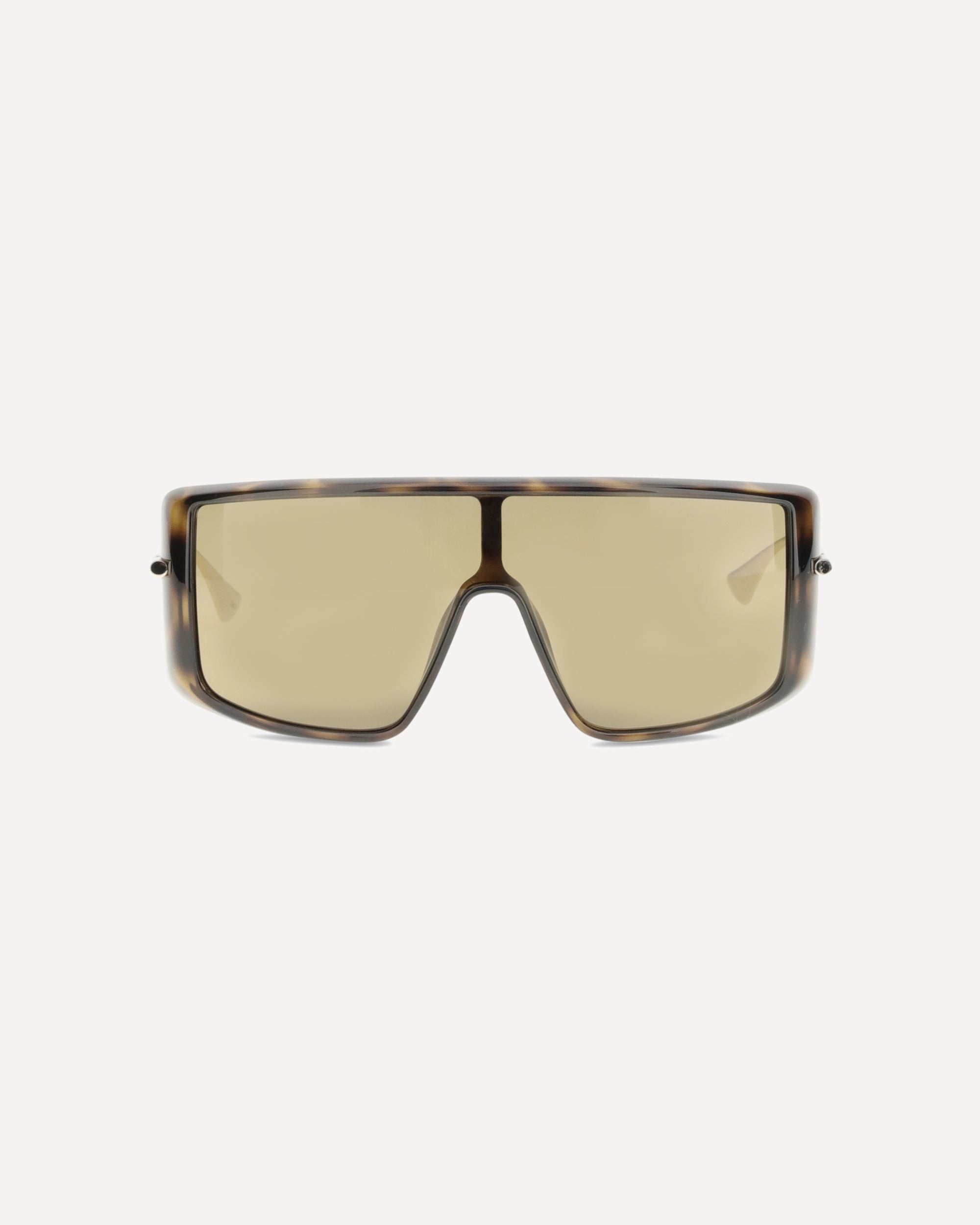 The Havana T-Bar sunglasses by Alexander McQueen feature a bold silhouette, with a warm-toned tortoiseshell acetate frame paired with brown gradient lenses. The oversized visor shape is enhanced by gold-tone metal temples, designed as elegant T-Bars and engraved with the McQueen logo.