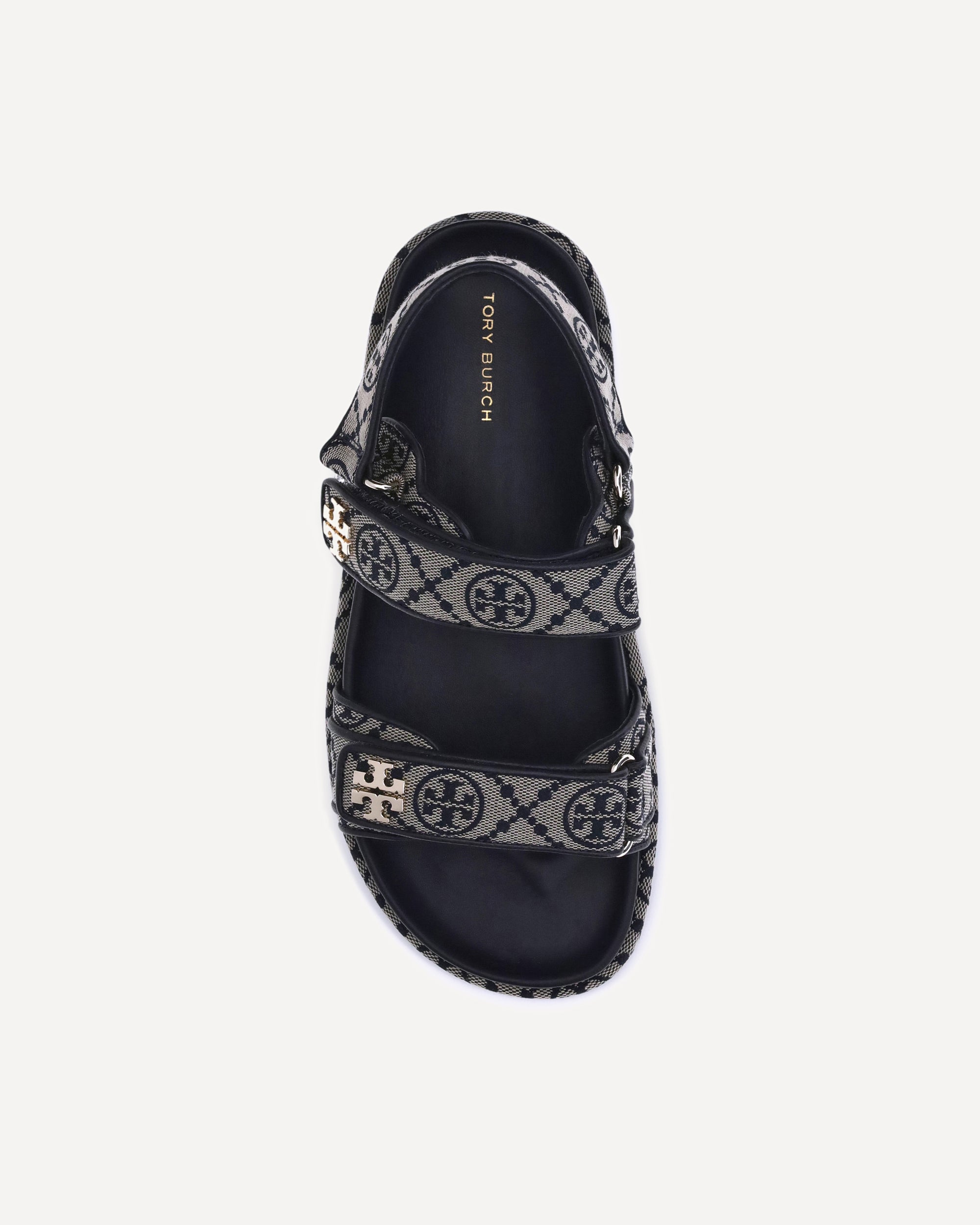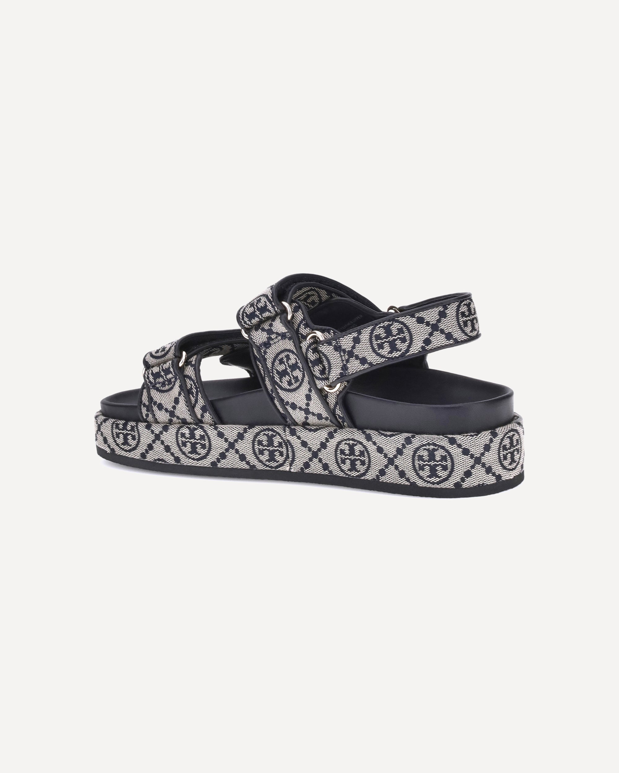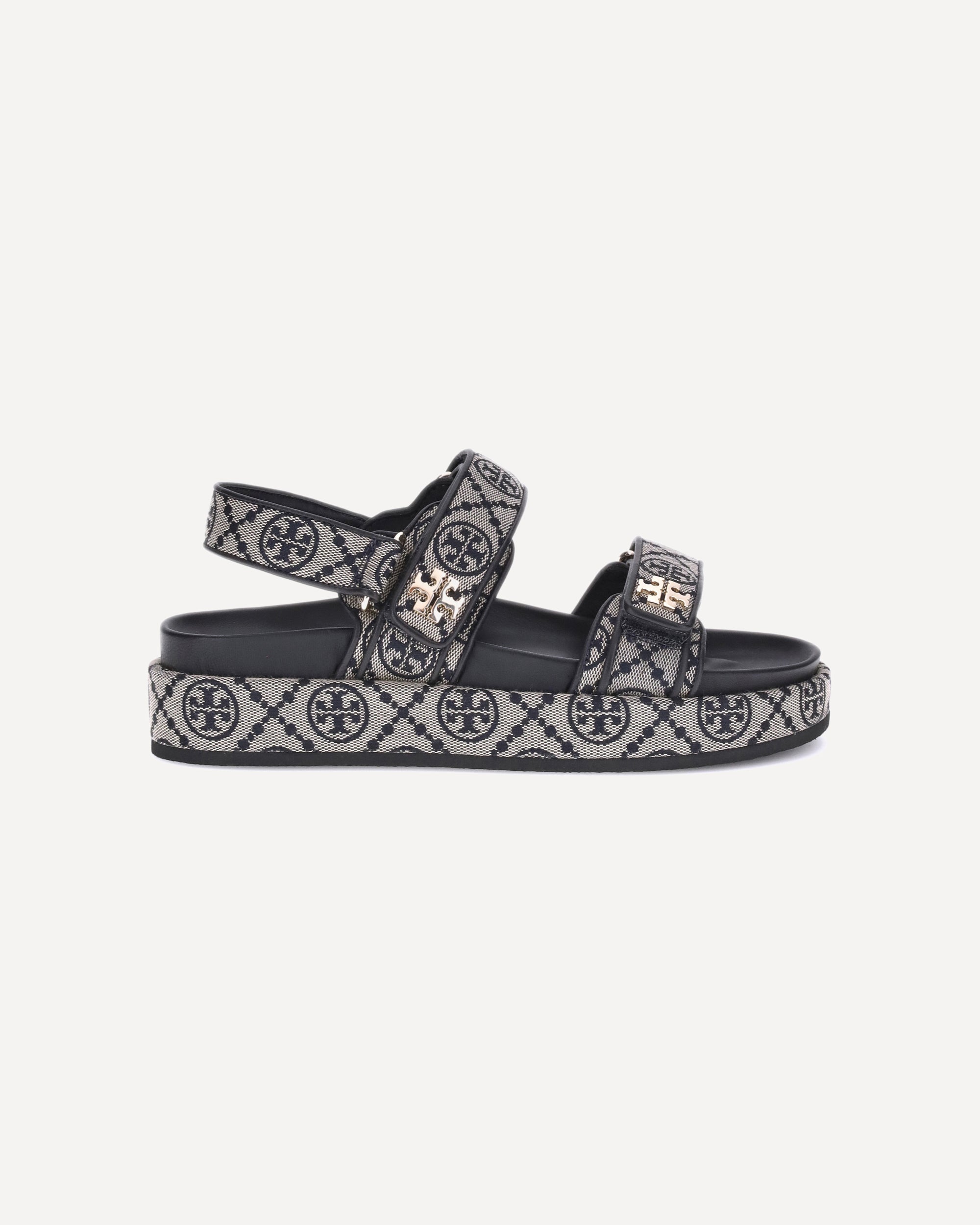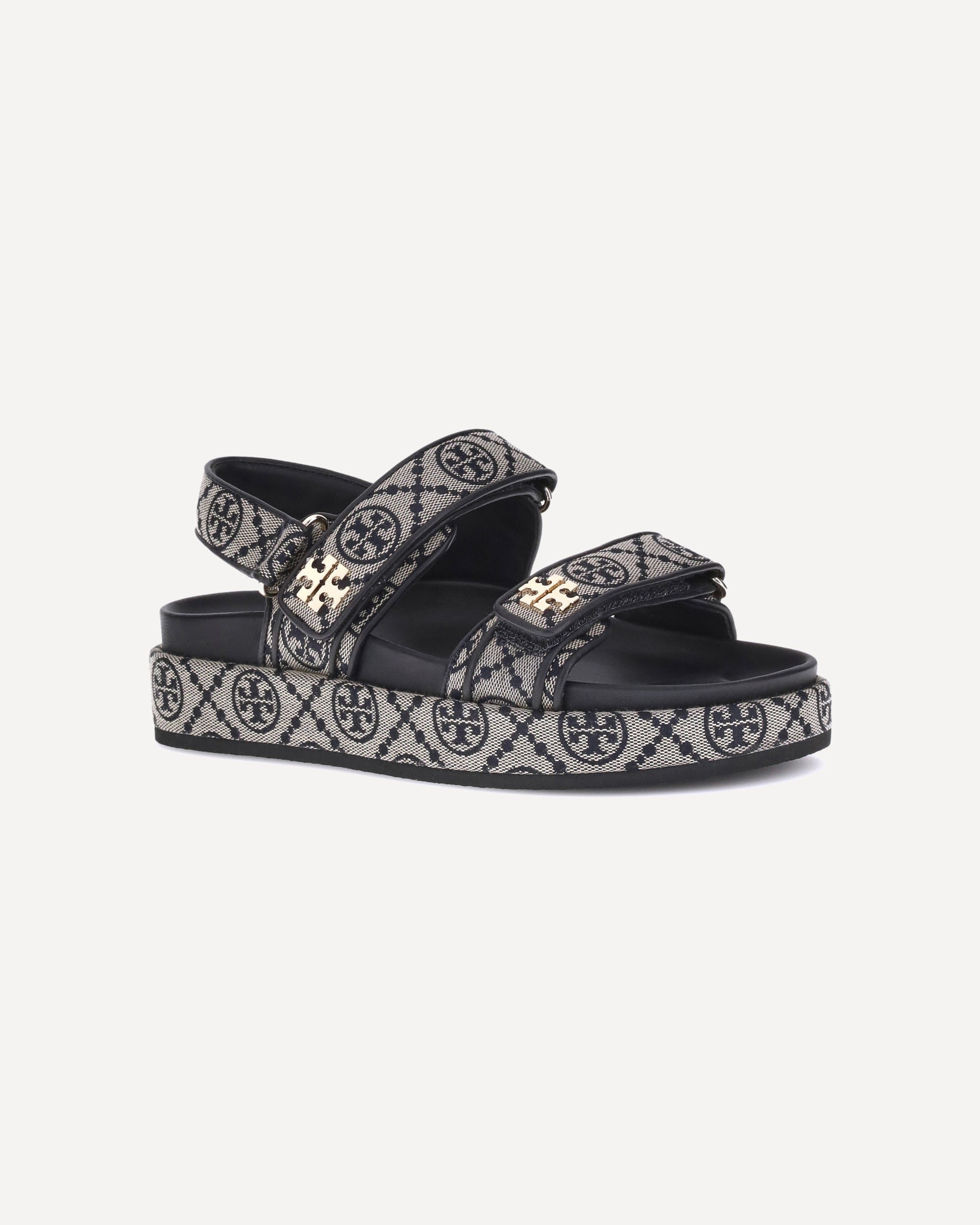Tory Burch's Kira Sandals offer a refined take on the classic sporty sandal. Made of jacquard with the unmistakable Monogram T, they combine style and functionality. Equipped with an extremely comfortable insole and rubber sole, they ensure all-day comfort. The practical laces with Velcro closure are embellished with the iconic logo for a distinctive touch in even the most casual looks.
