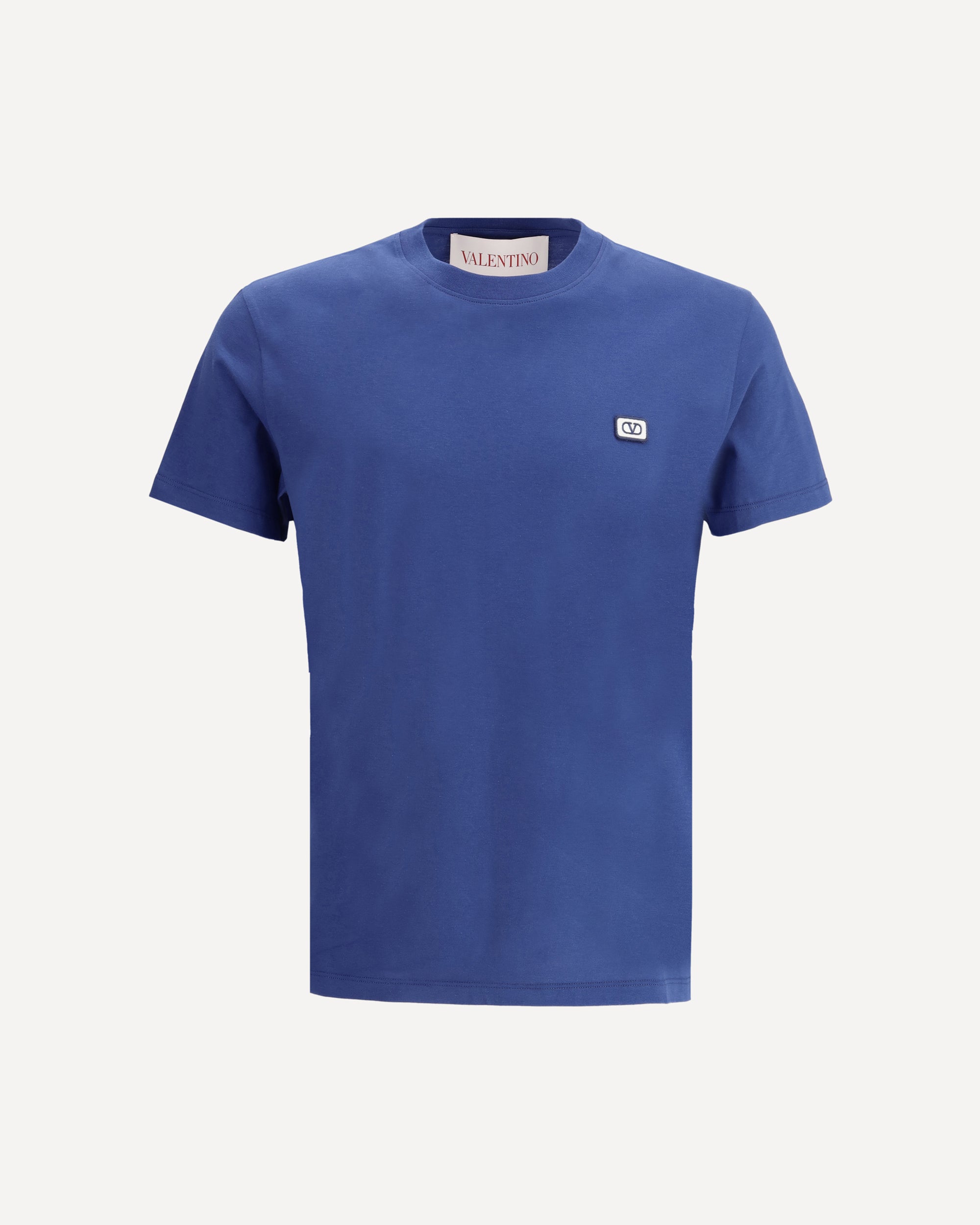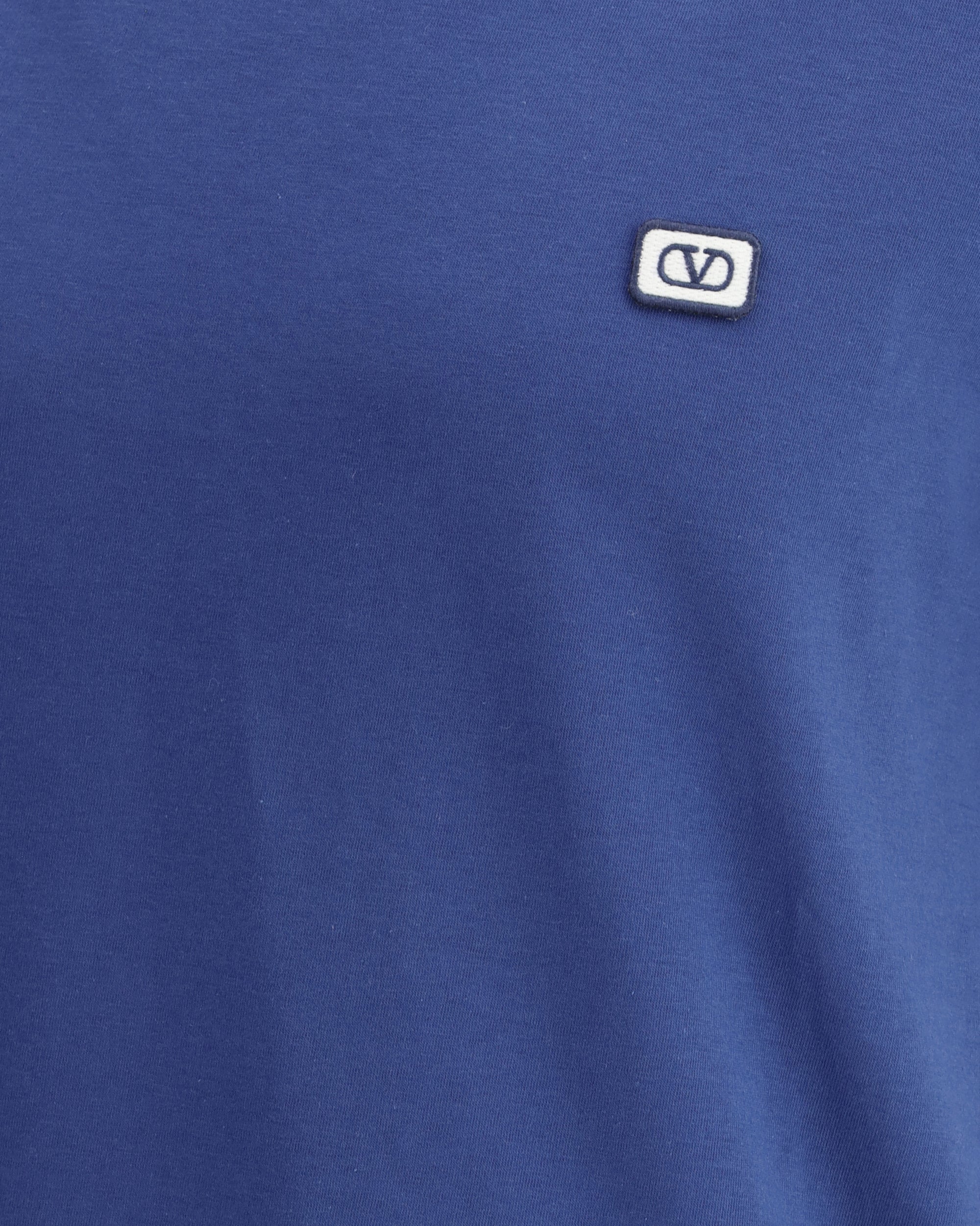 Cotton T-Shirt by Valentino, ribbed crew neck, contrasting applied iconic brand logo patch on front, monochrome pattern, regular fit.