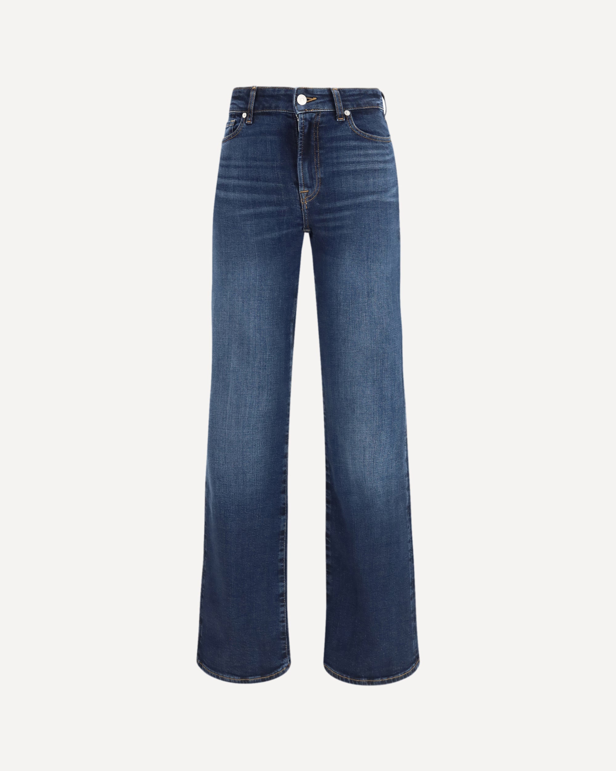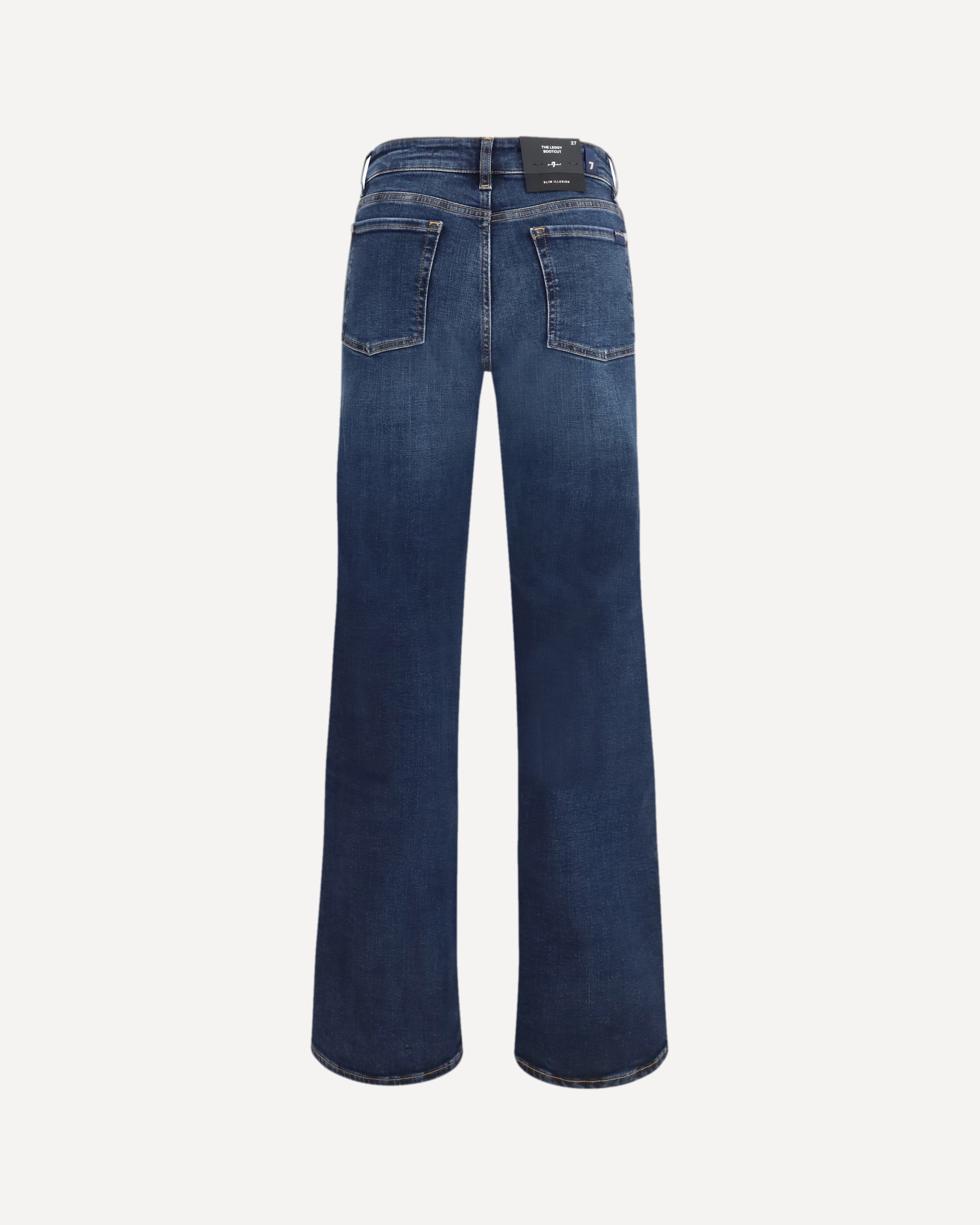 The Slim Illusion bootcut Jeans by 7 For All Mankind offer a contemporary take on feminine elegance, defined by a fluid, elongated silhouette. The mid-rise waist gently contours the hips and thighs before opening softly from the knee, creating a leg-lengthening effect. Crafted from soft yet supportive Italian cotton denim, the fabric is designed to sculpt, smooth, and move comfortably with the body. Finished with a zip-and-button closure and the brand’s tone-on-tone Squiggle embroidery on the back pocket, this pair stands out as a timeless staple elevated by the label’s signature craftsmanship.