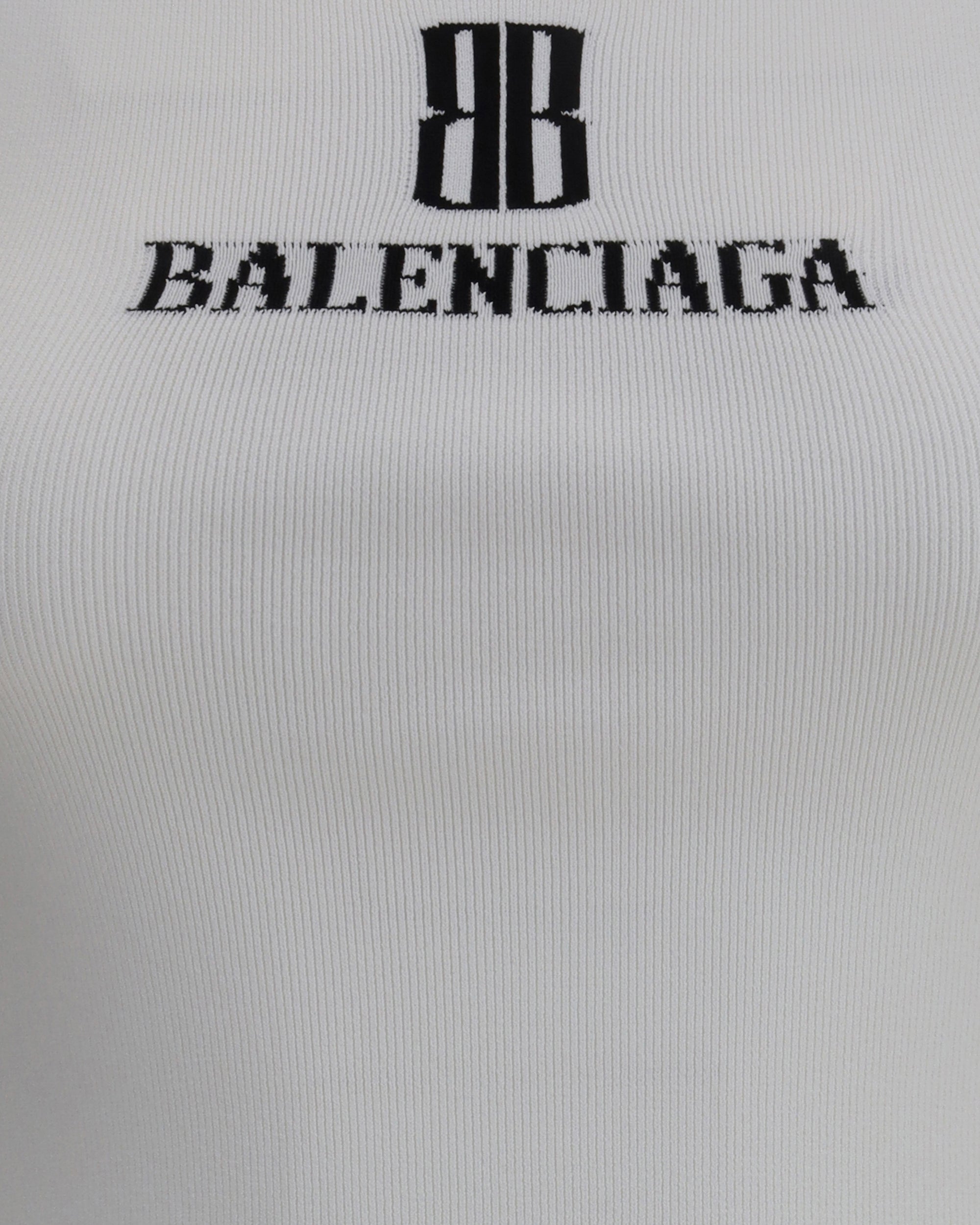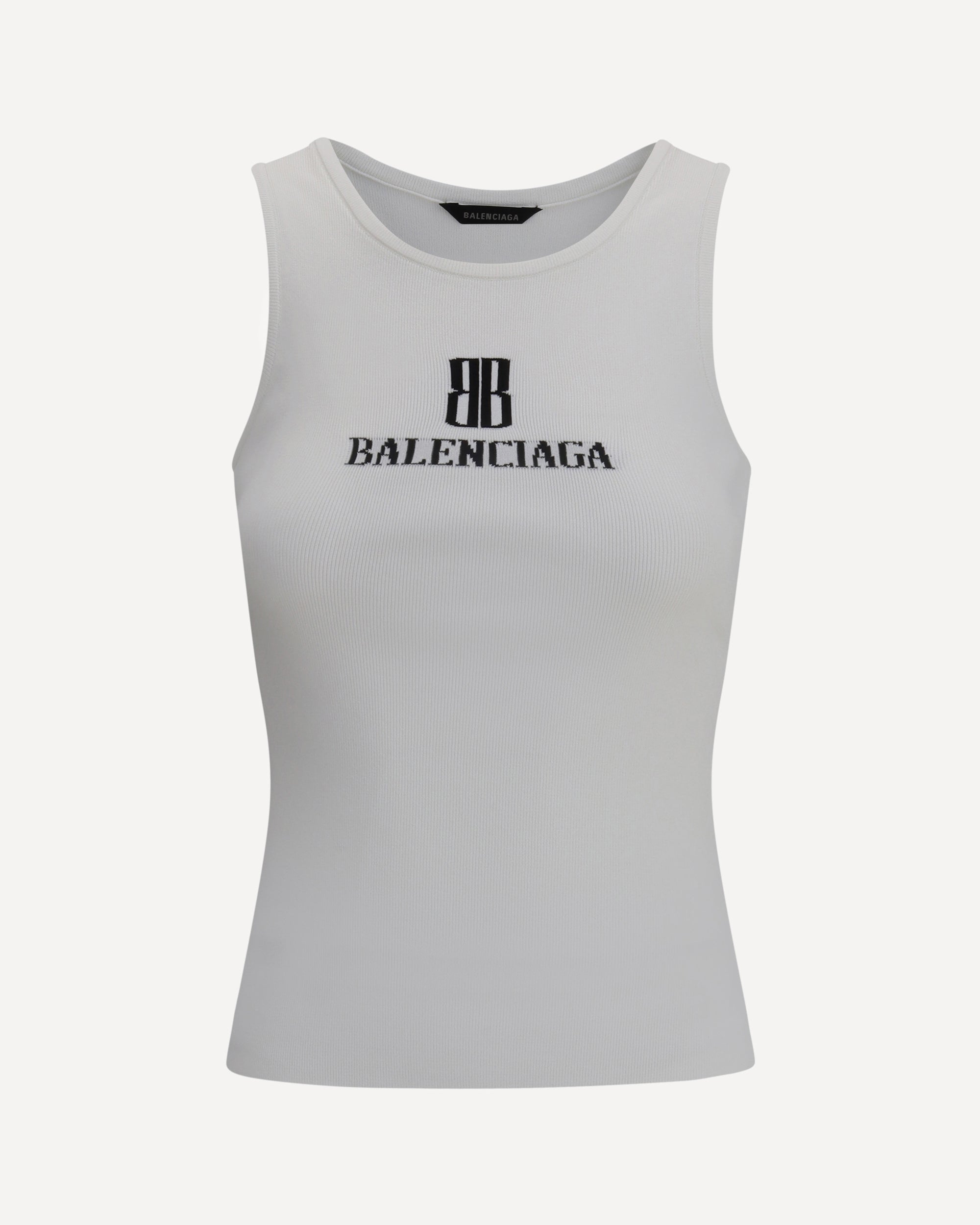 Top by Balenciaga, featuring the iconic contrast monogram printed on the front. Made of stretch fabric, this style features a slim fit that enhances the silhouette, perfect for modern, minimalist looks. Ideal to wear alone or paired with oversized garments for a contemporary play on volume.