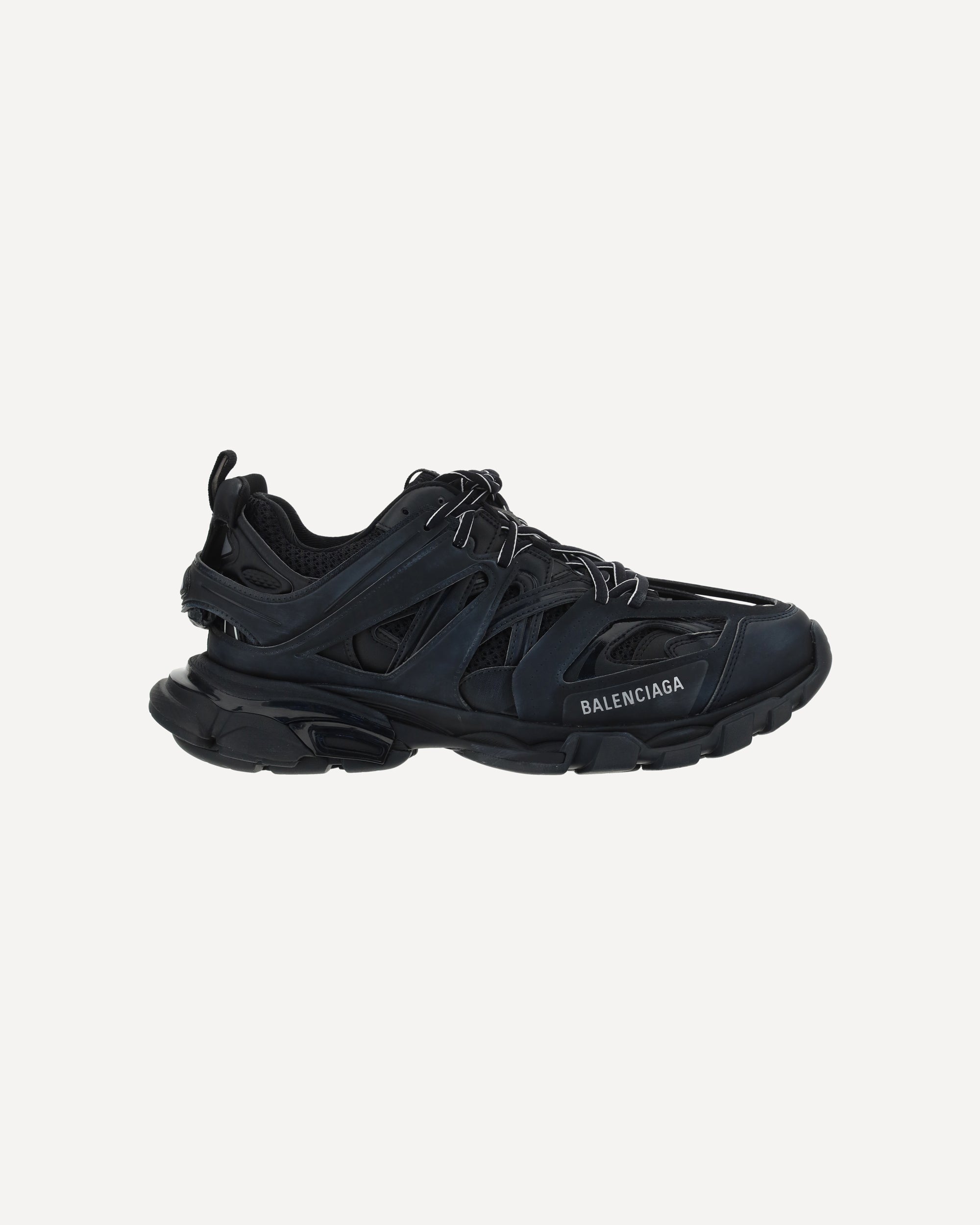 Track Sneakers by Balenciaga, inspired by high tech running shoes, multi layers, lace up front closure, size number at toe, distressed effect, structured sole, white printed brand logo on side, brand logo on sole and insole.