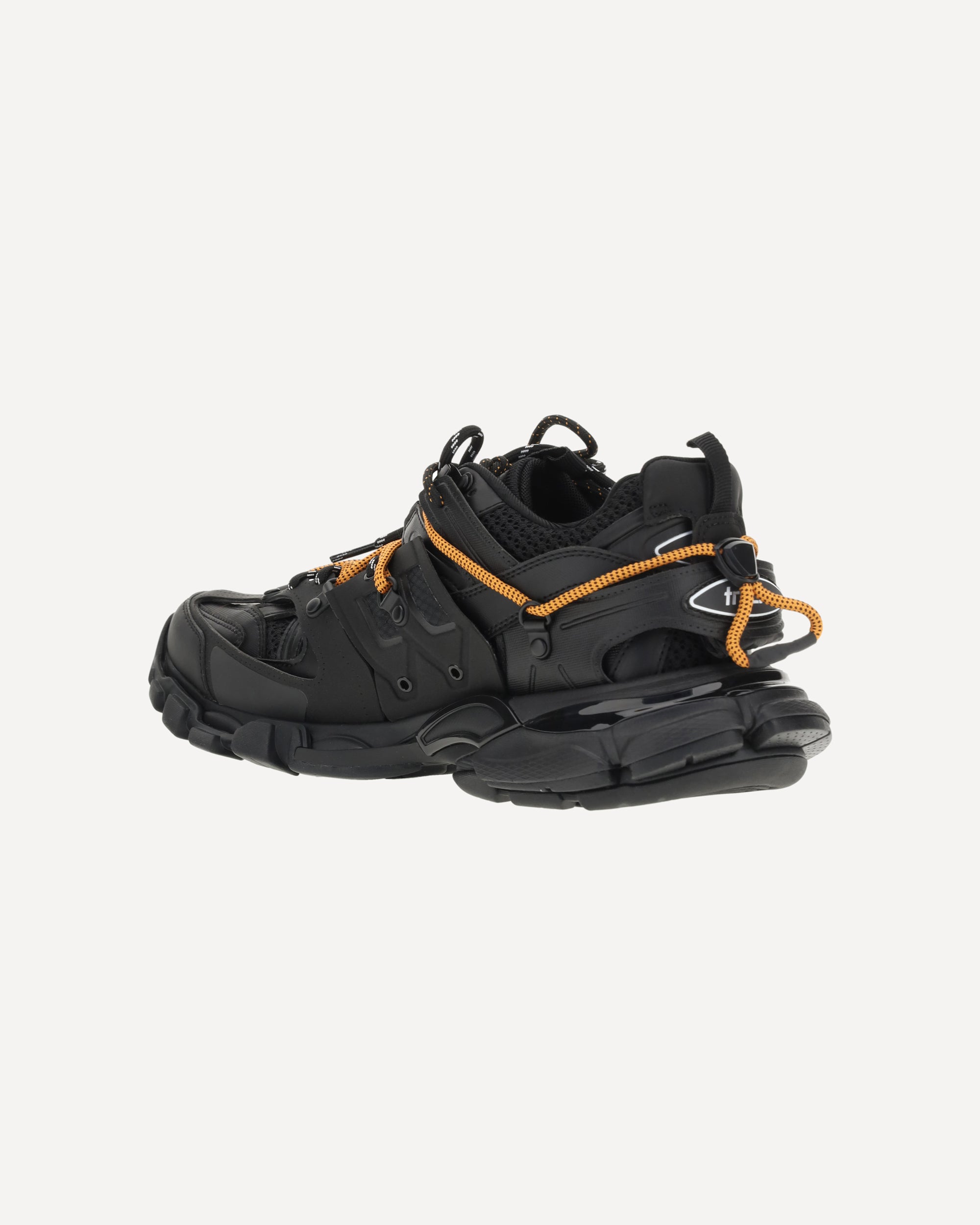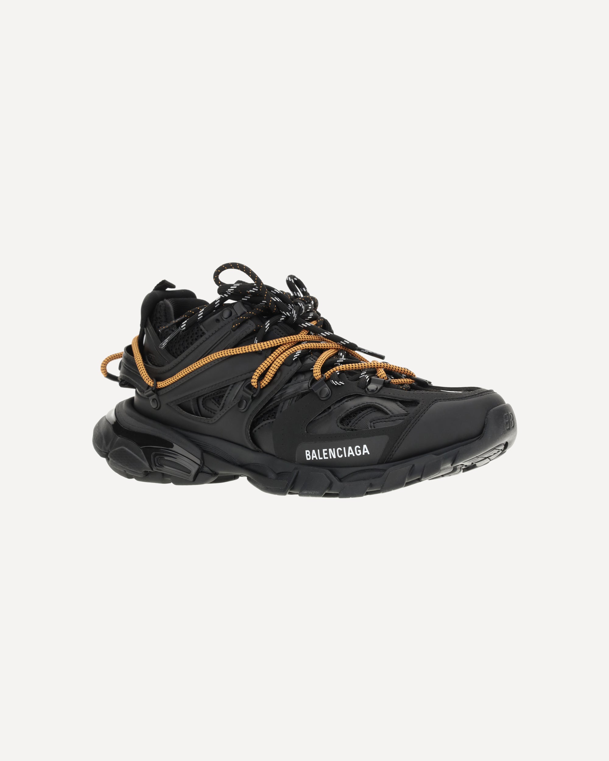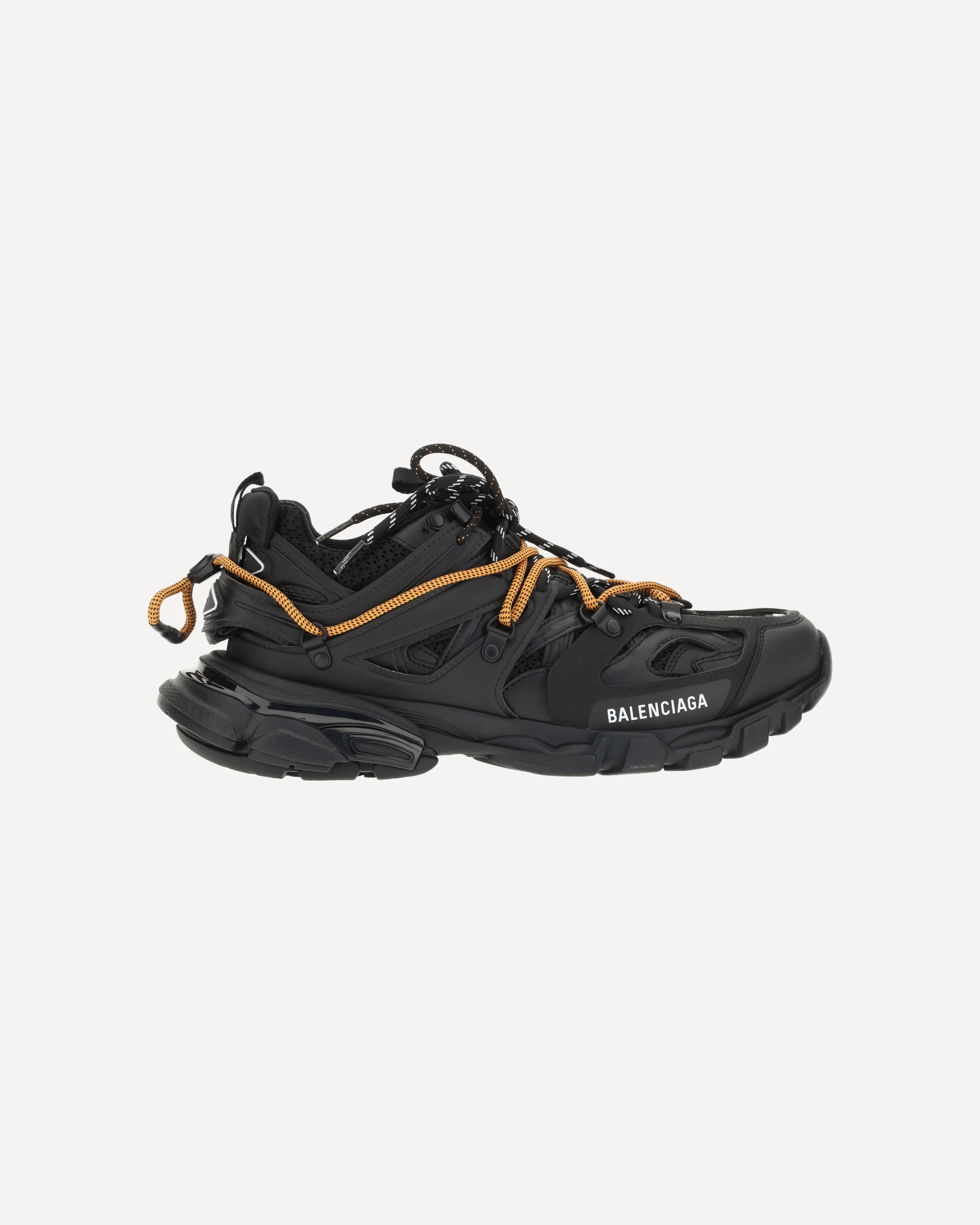 The Track Trail Laces Sneakers by Balenciaga are a mix of sporty style and distinctive details. The written size on the toe and embossed Track logo on the back of the heel add a recognizable touch, while the embossed BB logo on the front of the sole and the printed logo on the outer side emphasize the iconic brand. The tongue is embellished with the embossed logo, while double knotted laces with rope closure on the back and traditional hiking laces lend a functional and unique look. The heel and tongue loop and dynamically designed sole, more accentuated at the back, ensure optimal comfort and support for every step.