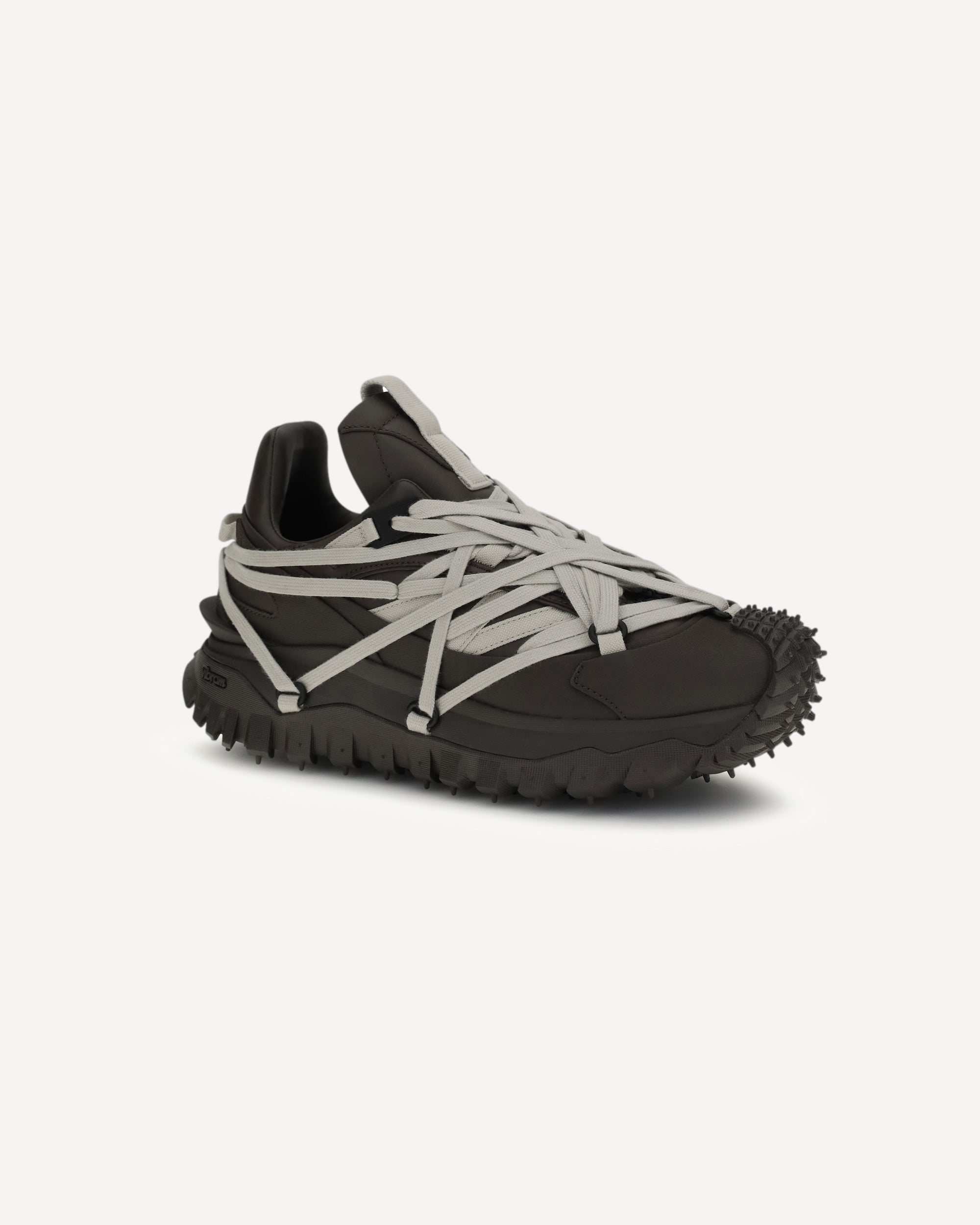 The Trailgrip Megalace Sneakers by Moncler + Rick Owens combine avant-garde style and functionality. The technical nylon and mesh upper with structured inserts is lightweight yet sturdy, while the long laces crossed on the outside create a "harness" effect. The serrated Vibram sole and rounded toe give a technical, urban look, perfect for a bold, contemporary style.