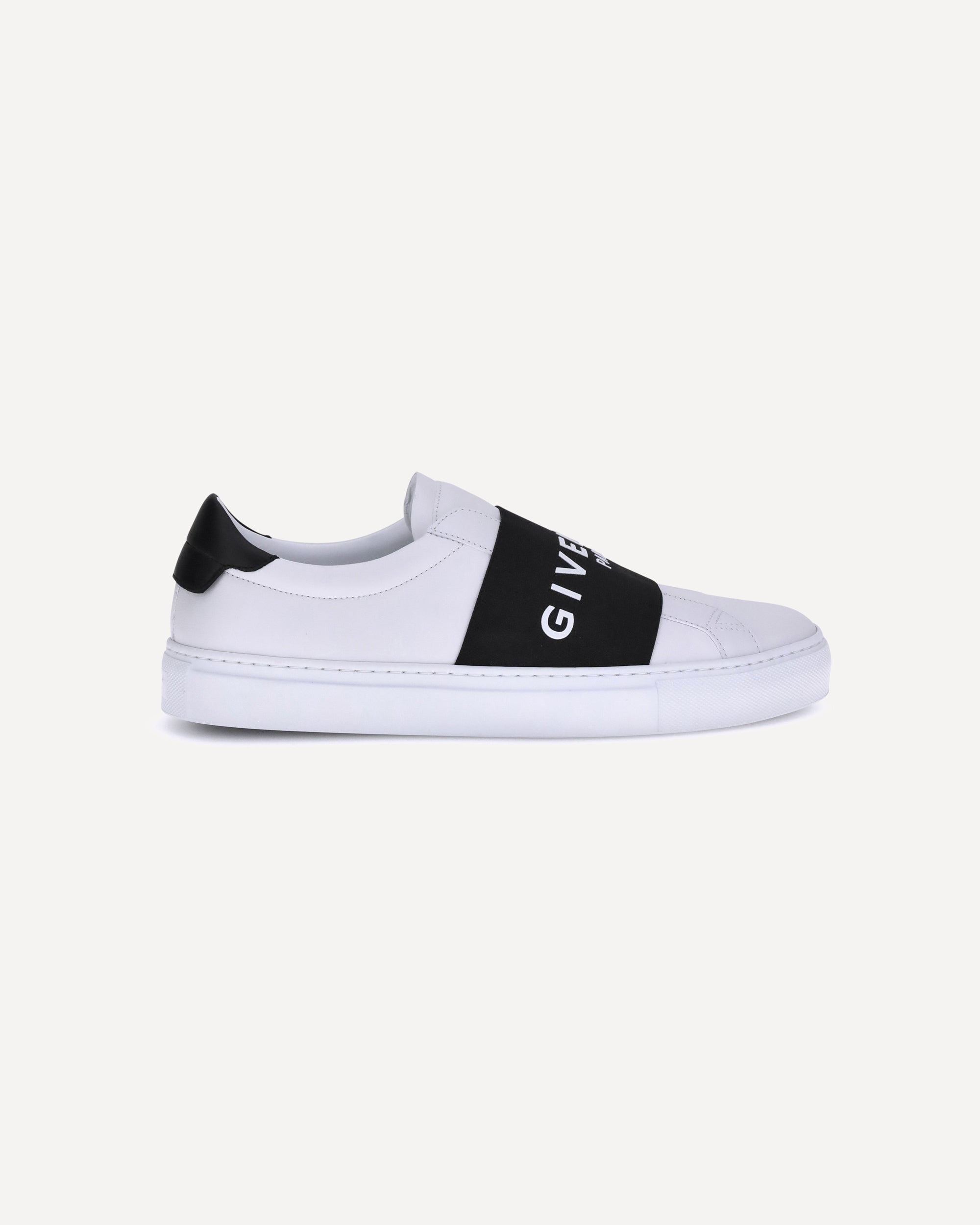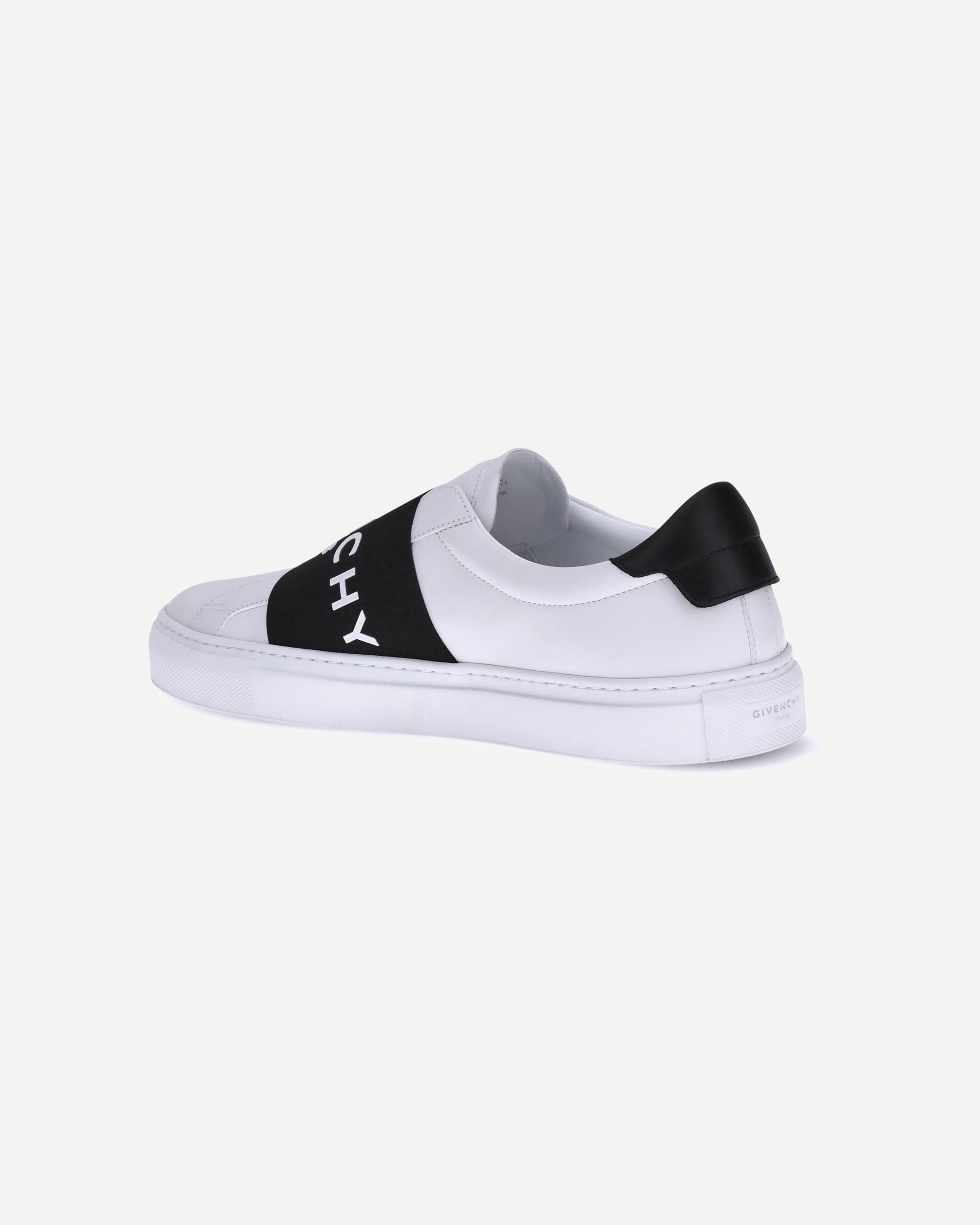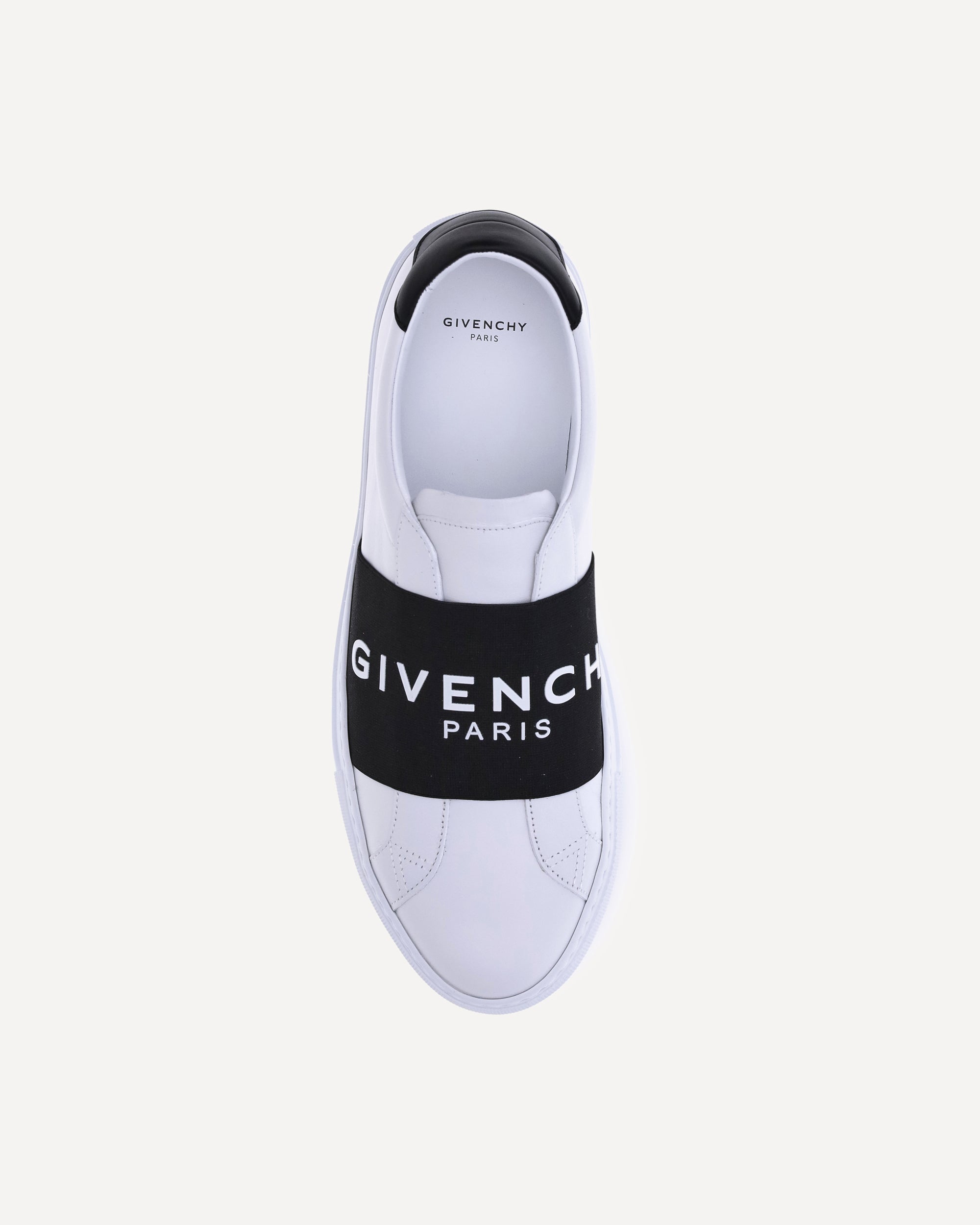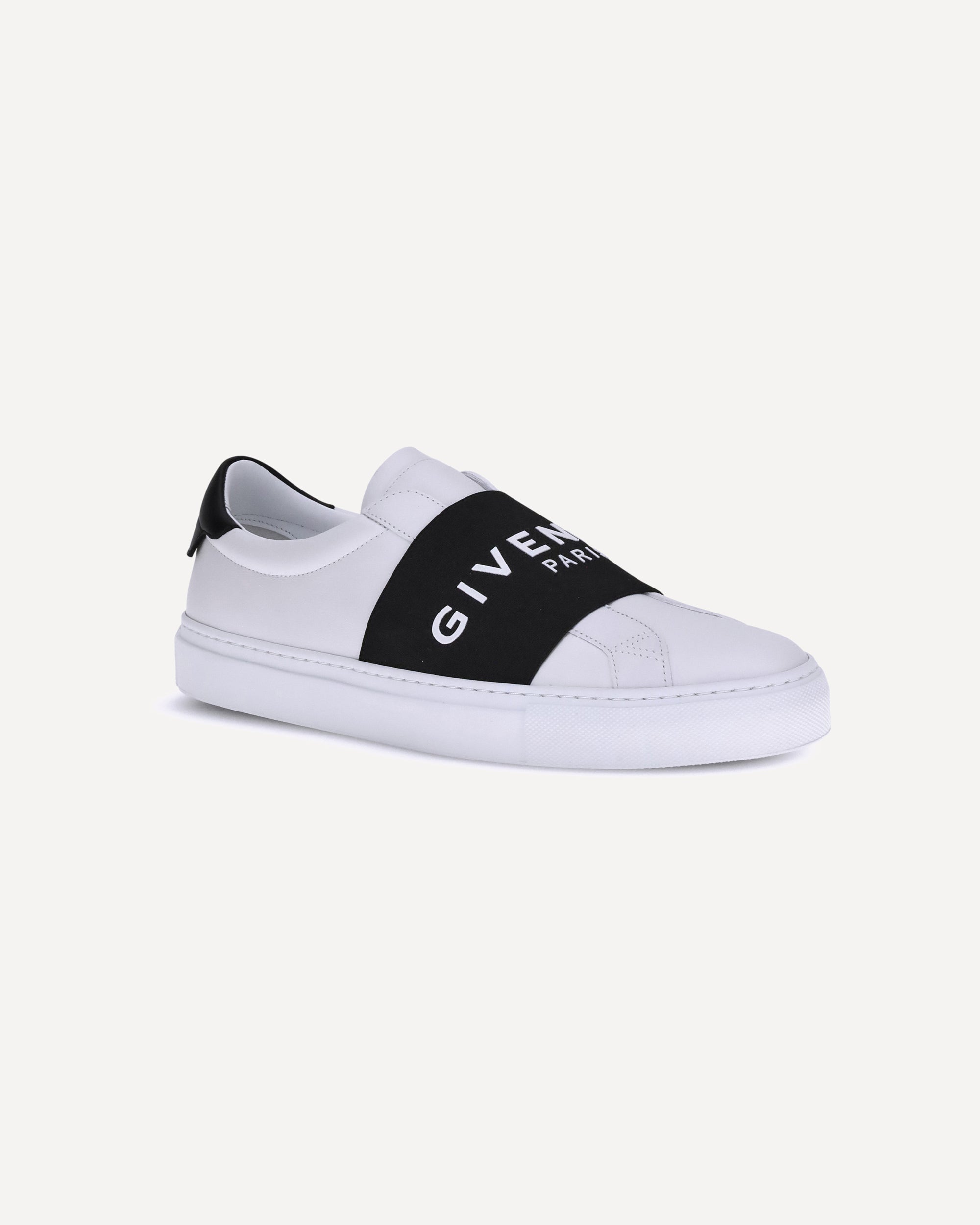 Givenchy's Urban Street Sneakers feature a modern, minimalist design. Featuring a wide black stretch band with the signature white GIVENCHY PARIS on the front, they offer comfort and style, complemented by a durable and functional rubber sole.