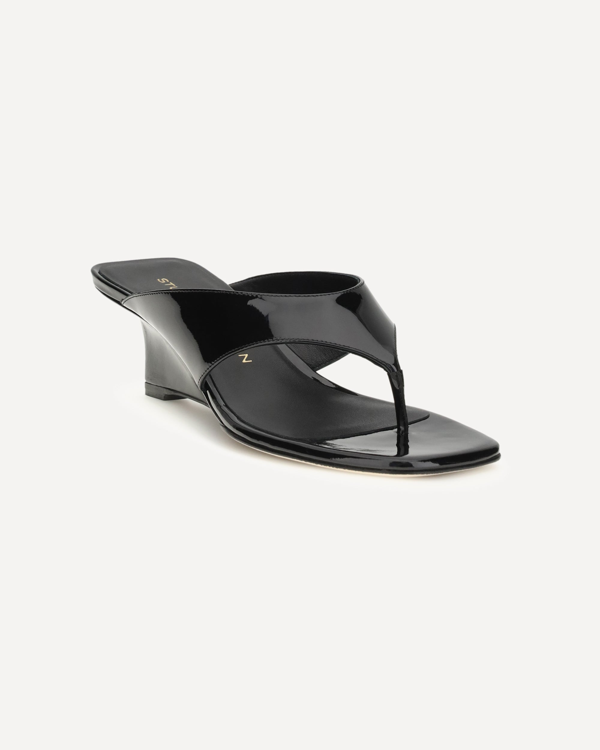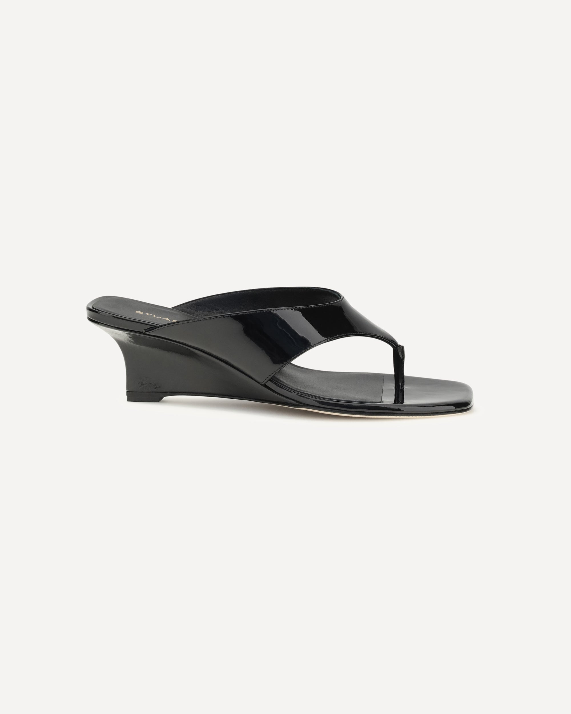 The Vinnie thong Sandals by Stuart Weitzman feature a square toe, wraparound upper, and square back counter. The sculpted 50 mm wedge adds height and definition to the silhouette, combining comfort and contemporary style in a distinctive and sophisticated design.