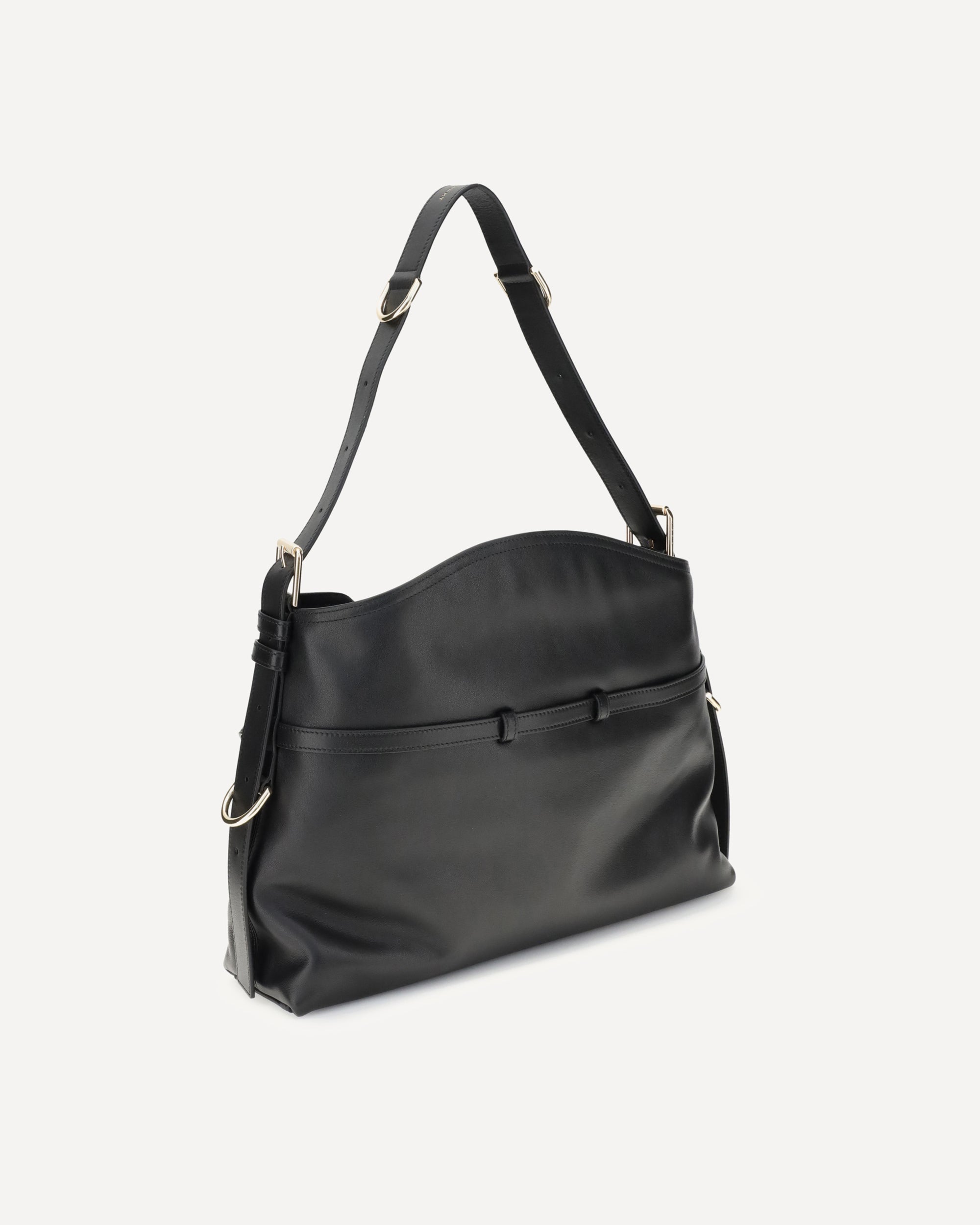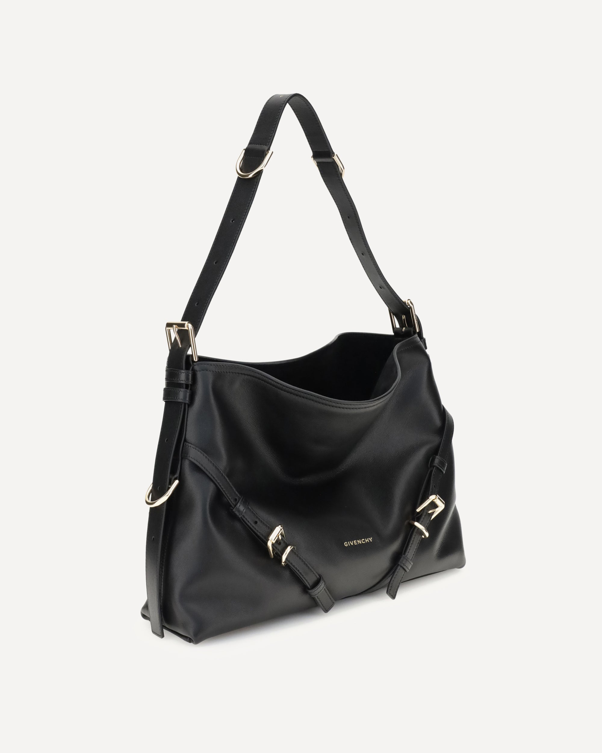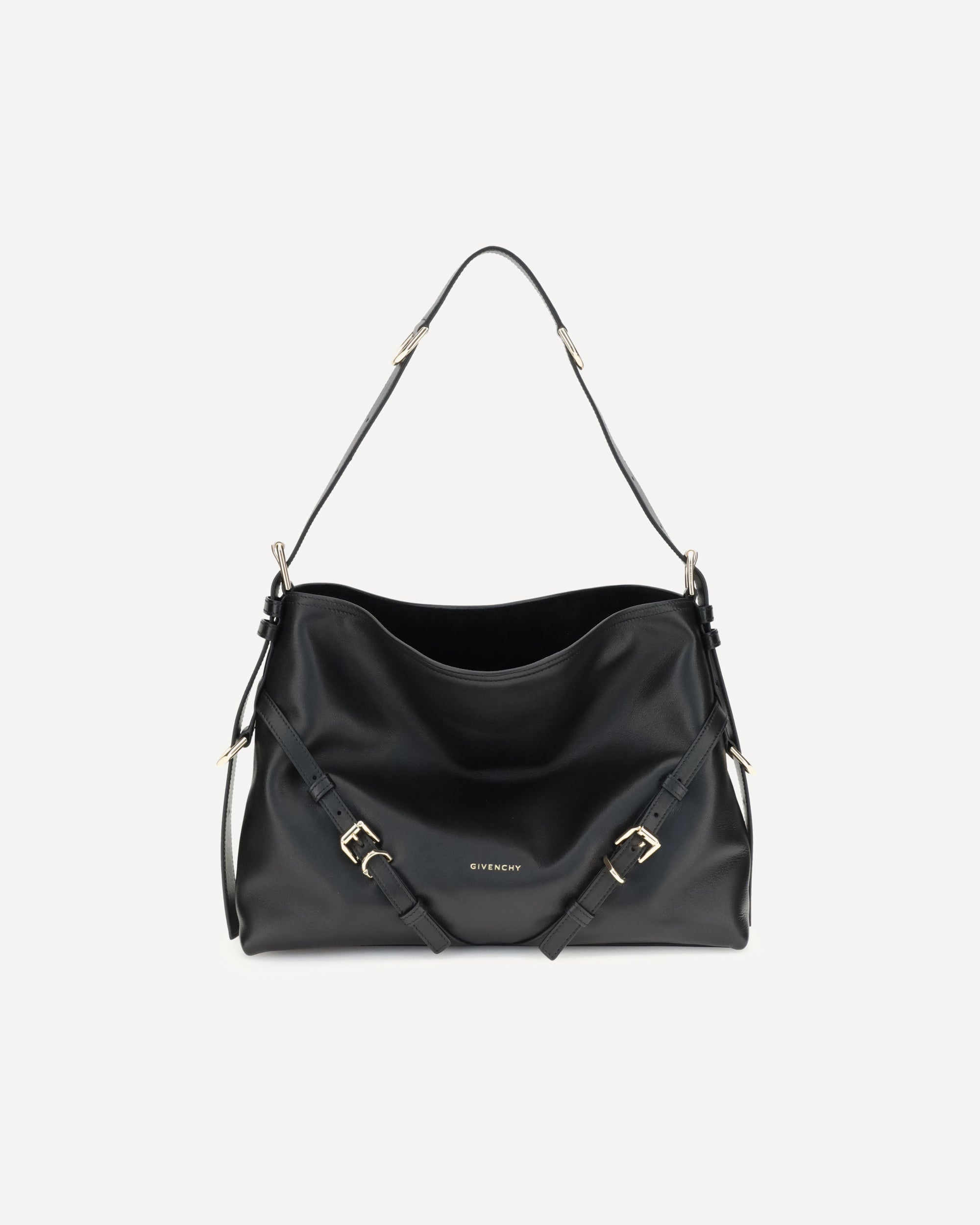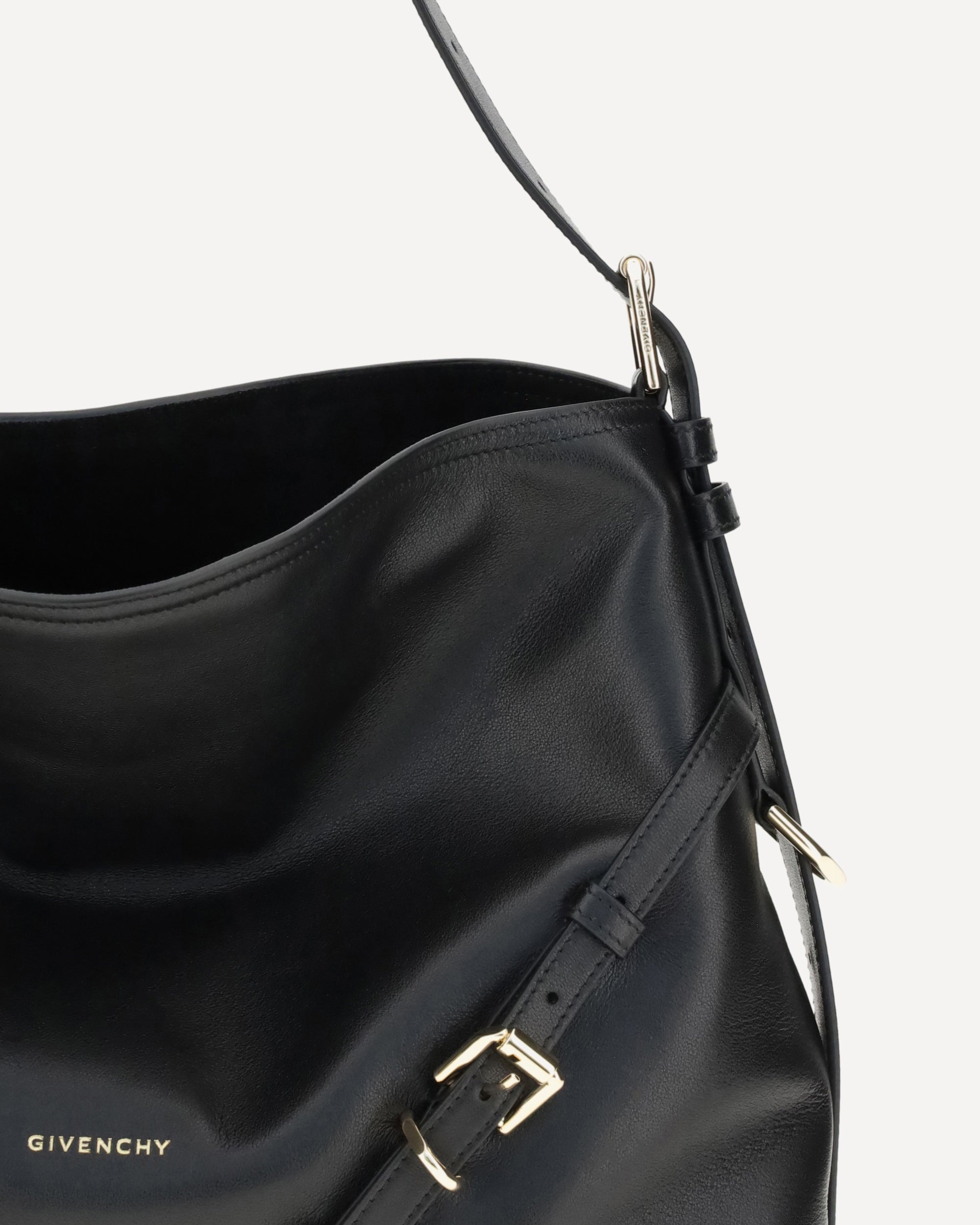 Givenchy's Voyou Shoulder Bag medium features a soft V-shaped silhouette and generous volume. The adjustable shoulder strap allows it to be carried by hand, shoulder or crossbody, ensuring maximum versatility. The GIVENCHY signature is stamped on both the front and top of the bag, while engraved metal clasps and gold-tone finish details complete the design with elegance.