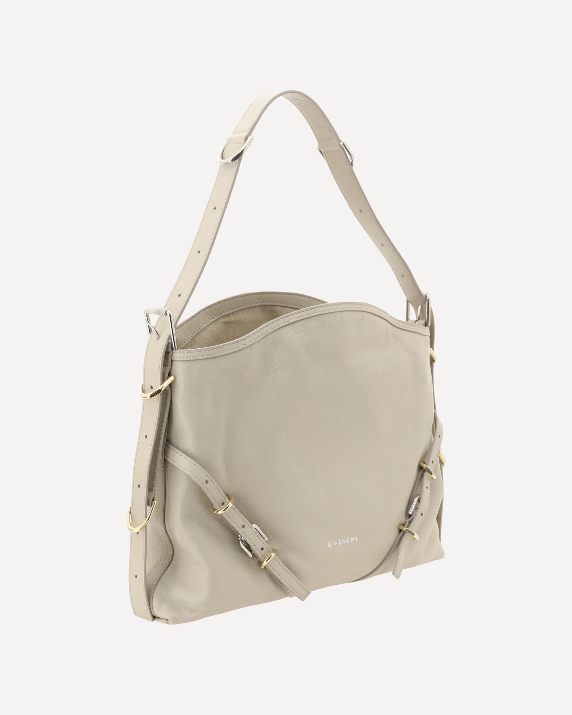 Calfskin Voyou Shoulder Bag by Givenchy, flat shoulder strap giftable by contrasting metal buckles, top zipper closure, leather straps detail applied to front panel, soft design, iconic brand monogram printed in contrasting press-stamp on front, interior slit pocket, single interior compartment.